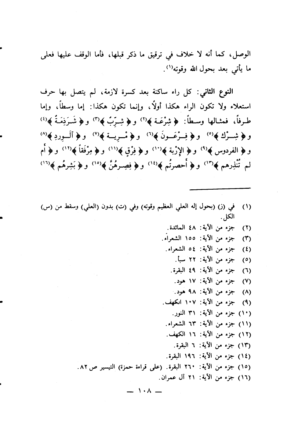 النوع الثاني: كل راء ساكنة بعد كسرة لازمة، لم يتصل بها حرف استعلاء ولا تكون الراء هكذا أولًا، وإنما تكون هكذا: إما وسطًا، وإما طرفًا، فمثالها وسطًا: {شِرْعَةً} (¬2) و {شِرْبٍ} (¬3) و {لَشِرْذِمَةٌ} (¬4) و {شِرْكٍ} (¬5) و {فِرْعَوْنَ} (¬6) و {مِرْيَةٍ} (¬7) و {الْمَوْرُودُ} (¬8) و {الْفِرْدَوْسَ} (¬9) و {الْإِرْبَةِ} (¬10) و {فِرْقٍ} (¬11) و {مِرْفَقًا} (¬12) و {أَمْ لَمْ تُنْذِرْهُمْ} (¬13) و {أُحْصِرْتُمْ} (¬14) و {فَصُرْهُنَّ} (¬15) و {بَشِّرْهُمْ} (¬16)