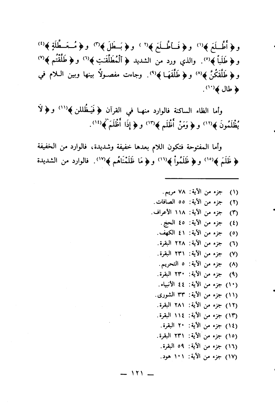 وأما الظاء الساكنة فالوارد منها في القرآن {فَيَظُللن} (¬11) و {لَا يُظْلَمُونَ} (¬12) و {وَمَنْ أظْلَم} (¬13) و {إذَا أظْلَمَ} (¬14).