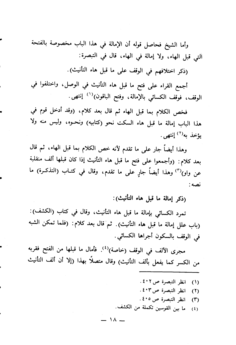 وأما الشيخ فحاصل قوله أن الإمالة في هذا الباب مخصوصة بالفتحة التي قبل الهاء، ولا إمالة في الهاء، قال في التبصرة: