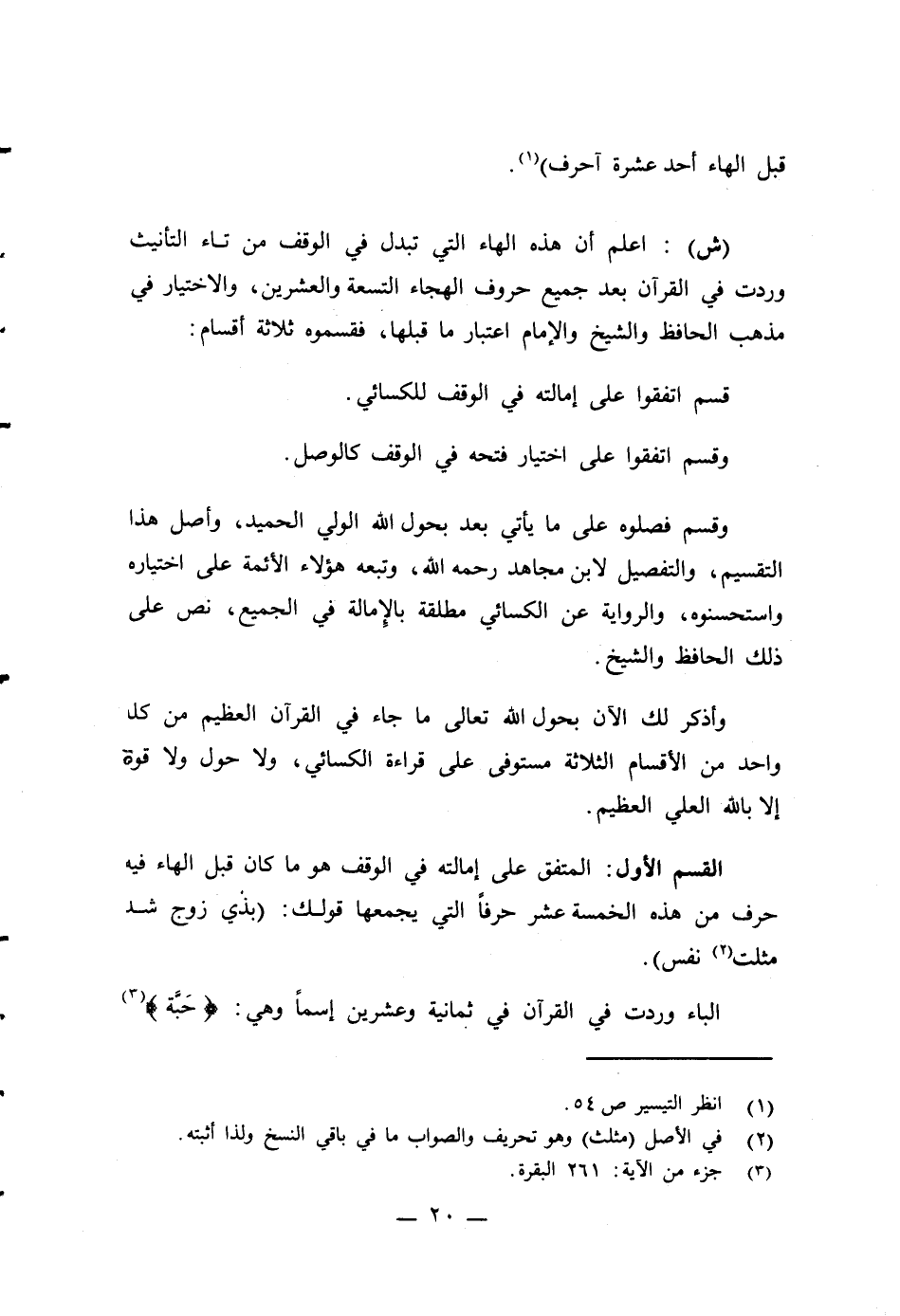 (ش): اعلم أن هذه الهاء التي تبدل في الوقف من تاء التأنيث وردت في القرآن بعد جميع حروف الهجاء التسعة والعشرين، والإختيار في مذهب الحافظ والشيخ والإمام اعتبار ما قبلها، فقسموه ثلاثة أقسام: