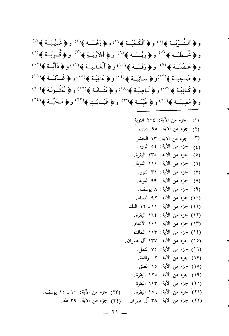 و {التَّوْبَةُ} (¬1) و {الْكَعْبَةَ} (¬2) و {رَهْبَةً} (¬3) و {شَيْبَةً} (¬4) و {خِطْبَةِ} (¬5) و {رِيبَةً} (¬6) و {الْإِرْبَةِ} (¬7) و {قُرْبَةٌ} (¬8) و {عُصْبَةٌ} (¬9) و {رَقَبَةٍ} (¬10) و {الْعَقَبَةَ} (¬11) و {دَابَّةٍ} (¬12) و {صَاحِبَةٌ} (¬13) و {سَائِبَةٍ} (¬14) و {عَاقِبَةُ} (¬15) و {غَائِبَةٍ} (¬16) و {كَاذِبَةٌ} (¬17) و {نَاصِيَةٍ} (¬18) و {مَثَابَةً} (¬19) و {لَمَثُوبَةٌ} (¬20) و {مُصِيبَةٌ} (¬21) و {طَيِّبَةً} (¬22) و {غَيَابَتِ} (¬23) و {مَحَبَّةً} (¬24)