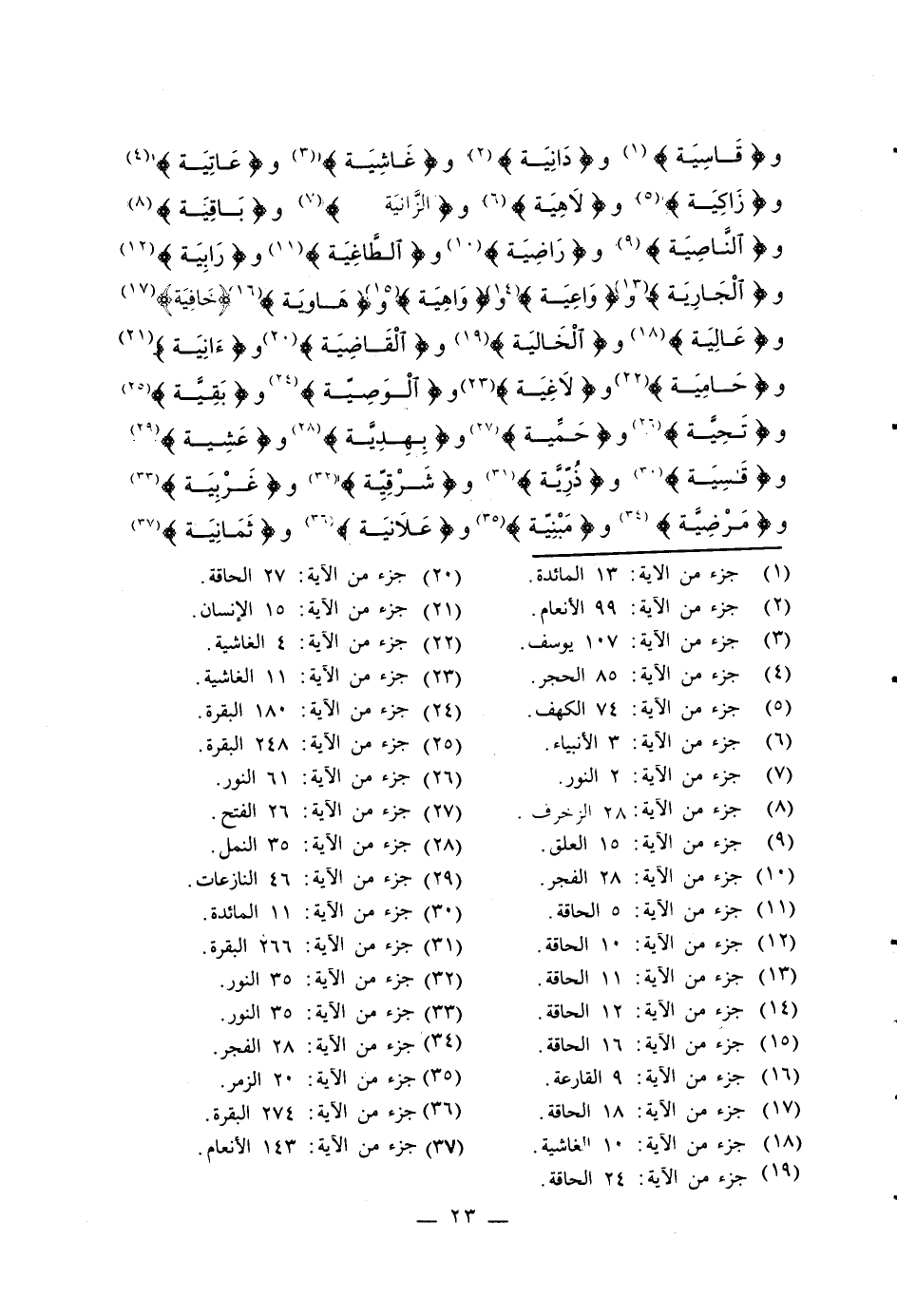 و {قَاسِيَة} (¬1) و {دَانِيَة} (¬2) و {غَاشِيَة} (¬3) و {عَاتِيَة} (¬4) و {زَاكِيَة} (¬5) و {لاَهِيَة} (¬6) {الزَّنيَة} (¬7) و {بَاقِية} (¬8) و {النَّاصِيَة} (¬9) و {رَاضِيَة} (¬10) و {الطَّاغِيَة} (¬11) و {رَابِيَة} (¬12) و {الْجَارِيَة} (¬13) و {وَاعِيَة} (¬14) و {وَاهِيَة} (¬15) و {هَاوَيَة} (¬16) و {خَافِيَة} (¬17) و {عَالِيَة} (¬18) و {لْخَاليَة} (¬19) و {الْقَاضِيَة} (¬20) و {ءَانِيَة} (¬21) و {حَامِيَة} (¬22) و {لاَغِيَة} (¬23) و {الْوَصِيّة} (¬24) و {بَقِيَّة} (¬25) و {تَحِيَّة} (¬26) و {حَمِّية} (¬27) و {بِهِدِيَّة} (¬28) و {عَشِية} (¬29) و {قَسِيَة} (¬30) و {ذُرِّيَّة} (¬31) و {شَرْقِيّة} (¬32) و {غَرْبِيَة} (¬33) و {مَرْضِيَّة} (¬34) و {مَبْنِيّة} (¬35) و {عَلاَنيَة} (¬36) و {ثَمَانِيَة} (¬37)