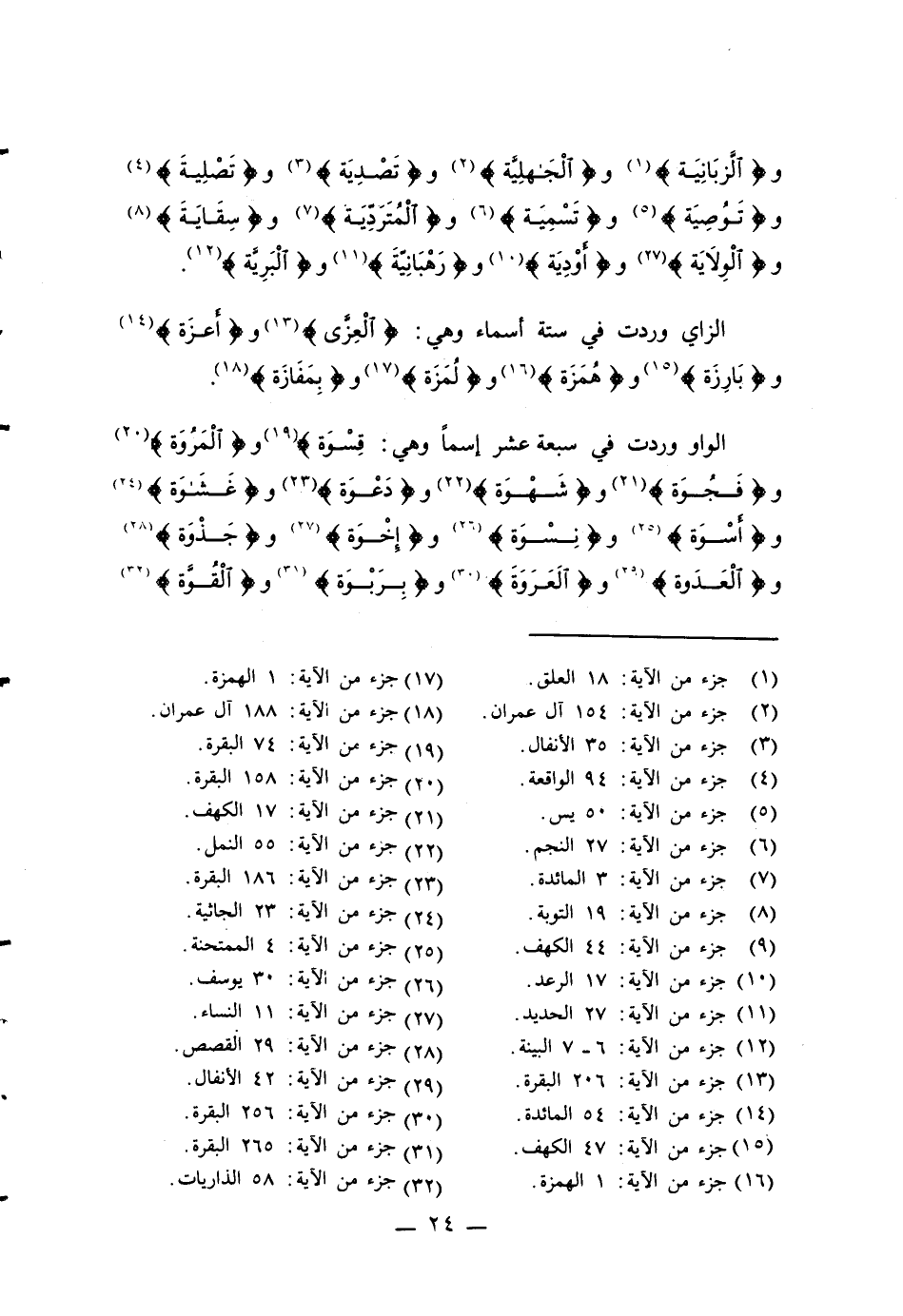 الزاي وردت في ستة أسماء وهي: {الْعِزَّى} (¬13) و {أَعزَةٍ} (¬14) و {بَارِزَة} (¬15) و {هُمَزَة} (¬16) و {لُمَزَة} (¬17) و {بِمَفَازَة} (¬18). الواو وردت في سبعة عشر إسماً وهي: {قِسْوَة} (¬19) و {الْمَرُوَة} (¬20) و {فَجُوَة} (¬21) و {شَهْوَة} (¬22) و {دَعْوَة} (¬23) و {غَشَوَة} (¬24) و {أَسْوَة} (¬25) و {نِسْوَة} (¬26) و {إِخْوَة} (¬27) و {جَذْوَة} (¬28) و {الْعَدَوة} (¬29) و {الَعَرَوَةَ} (¬30) و {بِرَبْوَة} (¬31) و {الْقُوَّة} (¬32)