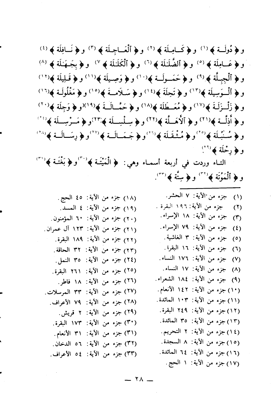 و {دُولَة} (¬1) و {كَامِلَة} (¬2) و {الْعَاجِلَة} (¬3) و {نَافِلَة} (¬4) و {عَامِلَة} (¬5) و {الضَّلَالَة} (¬6) و {الْكَلَلَة} (¬7) و {بِجَهَلَة} (¬8) و {الْجِبِلَّة} (¬9) و {حَمَولَة} (¬10) و {وَصِيلَة} (¬11) و {قَلِيلَة} (¬12) و {الْوَسِيلَة} (¬13) و {تَحِلَةَ} (¬14) و {سَلَامةَ} (¬15) و {مَغْلُولَة} (¬16) و {زَلْزَلَةَ} (¬17) و {مُعَطَلَة} (¬18) و {حَمَّالَةَ} (¬19) و {وَجِلَة} (¬20) و {أَذِلَّة} (¬21) و {الأَهَلَّة} (¬22) و {سِلْسِلَة} (¬23) و {مَرْسِلَة} (¬24) و {سُنبُلَة} (¬25) و {مُثْقَلَة} (¬26) و {جَمَالَة} (¬27) و {رِسَالَة} (¬28) و {رِحْلَة} (¬29).