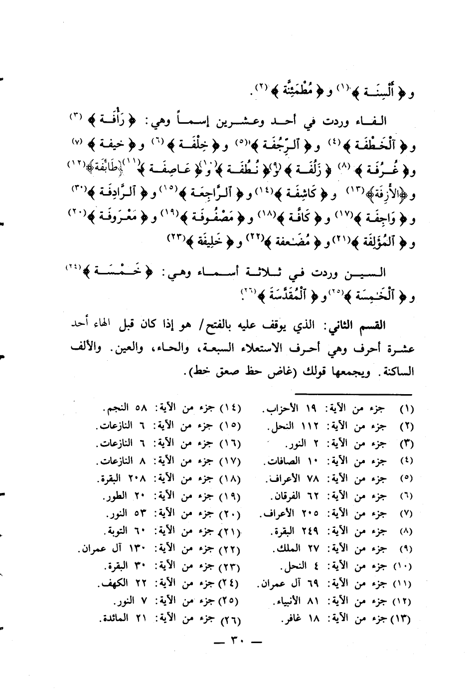 الفاء وردت في أحد وعشرين إسماً وهي: {رَأْفَة} (¬3) و {الْخَطْفَة} (¬4) و {الرِّجُفَة} (¬5) و {خِلْفَة} (¬6) و {خيفة} (¬7) و {غُرُفَة} (¬8) {زَلُفَة} (¬9) و {نُطُفَة} (¬10) و {عَاصِفَة} (¬11) {طَائِفَة} (¬12) و {الأَزِفَة} (¬13) و {كَاشِفَة} (¬14) و {الرَّاجِعَة} (¬15) و {الرَّادِفَة} (¬16) و {وَاجِفَة} (¬17) و {كَافَّة} (¬18) و {مَصْفُوفَة} (¬19) و {معْرَوفَة} (¬20) و {المُؤَلِفَة} (¬21) و {مُضَعفة} (¬22) و {خَلِيفَة} (¬23)