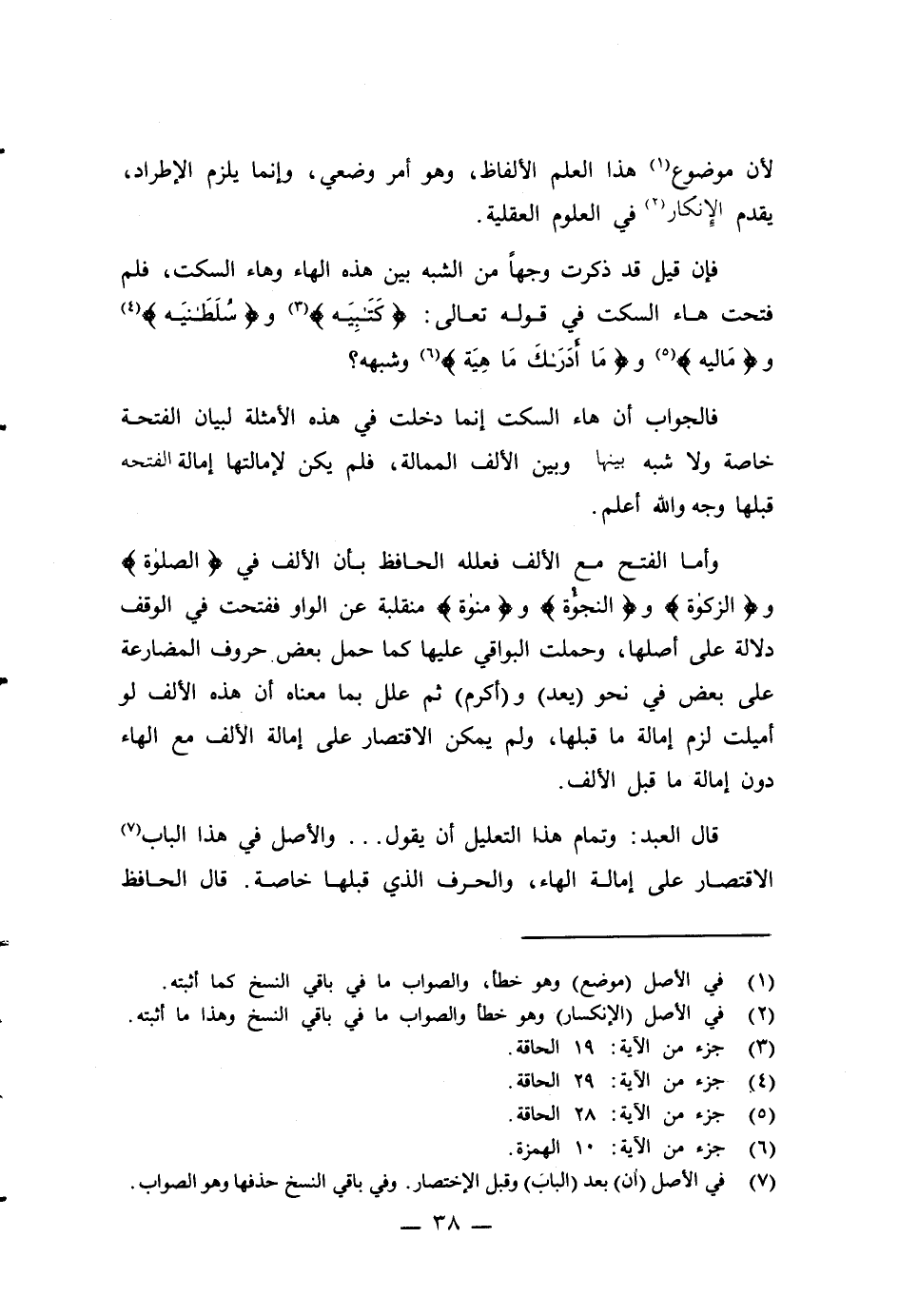 فالجواب أن هاء السكت إنما دخلت في هذه الأمثلة لبيان الفتحة خاصة ولا شبه بينا وبين الألف الممالة، فلم يكن لإمالتها إمالة الفتحه قبلها وجه والله أعلم.