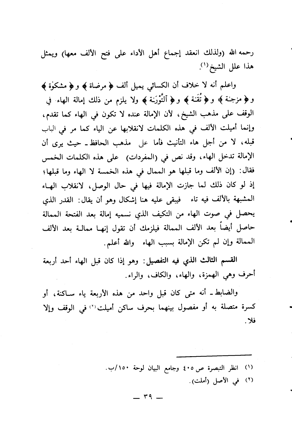 واعلم أنه لا خلاف أن الكسائي يميل ألف {مرضاة} و {مشكوة} و {(مزجاة} و {تُقَاة} و {التَّوْرَاة} ولا يلزم من ذلك إمالة الهاء. في الوقف على مذهب الشيخ، لأن الإمالة عنده لا تكون في الهاء كما تقدم، وإنما أميلت الألف في هذه الكلمات لانقلابها عن الياء كما مر في الباب قبله، لا من أجل هاء التأنيث فاأما عاد مذهب الحافظ - حيث يرى أن الإمالة تدخل الهاء، وقد نص في (المفردات) على هذه الكلمات الخمس فقال: (إن الألف وما قبلها هو الممال في هذه الخمسة لا الهاء وما قبلها؛ إذ لو كان ذلك لما جازت الإمالة فيها في حال الوصل، لانقلاب الهاء المشبهة بالألف فيه تاء فيبقى عليه هنا إشكال وهو أن يقال: القدر الذي يحصل في صوت الهاء من التكيف الذي نسميه إمالة بعد الفتحة الممالة حاصل أيضاً بعد الألف الممالة فيلزمك أن تقول إنها ممالة بعد الألف الممالة وإن لم تكن الإمالة بسبب الهاء والله أعلم.