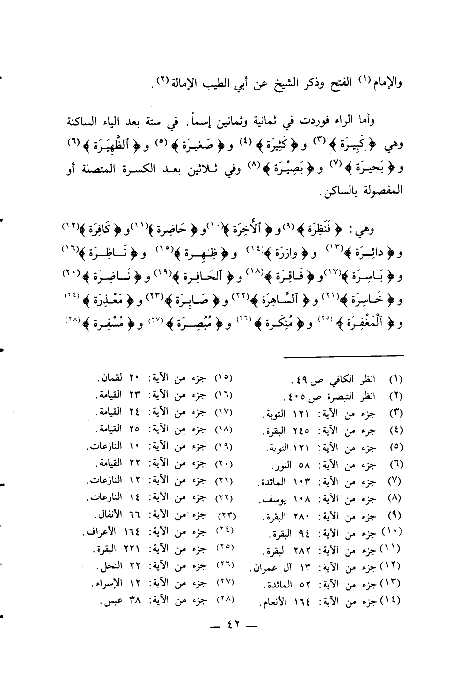وهي: {فَنَظِرَة} (¬9) و {الأَخِرَة} (¬10)، و {حَاضِرة} (¬11) و {كَافِرَة} (¬12) و {دائِرَة} (¬13) و {وازرَة} (¬14) و {ظِاهِرة {(¬15) و {نَاظِرَة} (¬16) و {بَاسِرَة} (¬17) و {فَاقِرَة} (¬18) و {الحَافِرة} (¬19) و {نَاضِرَة} (¬20) و {خَاسِرَة} (¬21) و {السَّاهِرَةِ} (¬22) و {صَابِرَة} (¬23) و {مَعْذِرَة} (¬24) و {الْمَغْفِرَة} (¬25) و {مُنِكَرة} (¬26) و {مُبُصِرَة} (¬27) و {مُسْفِرة} (¬28)