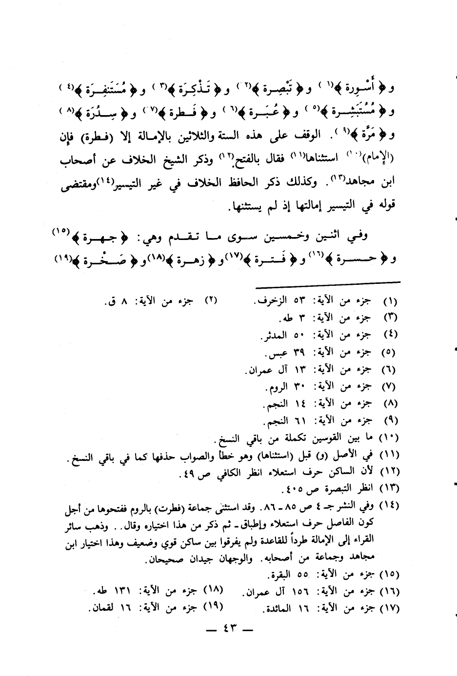 (¬14) وفي النشر جـ 4 ص 85 - 86. وقد استثنى جماعة (فطرت) بالروم ففتحوها من أجل كون الفاصل حرف استعلاء وإطباق - ثم ذكر من هذا اختياره وقال .. وذهب سائر القراء إلى الإمالة طرداً للقاعدة ولم يفرقوا بين ساكن قوي وضعيف وهذا اختيار ابن مجاهد وجماعة من أصحابه. والوجهان جيدان صحيحان.