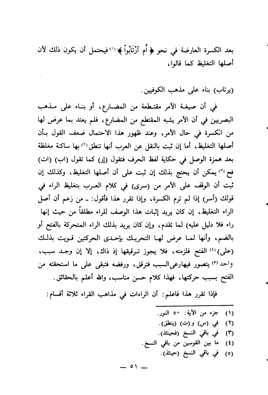 في أن صيغة الأمر مقتطعة من المضارع، أو بناء على مذهب البصريين في أن الأمر يشبه المقتطع من المضارع، فلم يعتد بما عرض لها من انكسرة في حال الأمر، وعند ظهور هذا الإحتمال ضعف القول بأن أصلها التغليظ، أما إن ثبت بالنقل عن العرب أنها تنطق (¬2) بها ساكنة مغلظة بعد همزة الوصل في حكاية لفظ الحرف فتقول (إر) كما تقول (اب) (ات) فح (¬3) يمكن أن يحتج بذلك إن ثبت على أن أصلها التغليظ، وكذلك إن ثبت أن الوقف على الأمر من (سرى) في كلام العرب بتغليظ الراء في قولك (أسر) إذا لم ترم الكسرة، وإذا تقرر هذا فأقول: - من زعم أن أصل الراء التغليظ، إن كان يريد إثبات هذا الوصف للراء مطلقاً من حيث إنها راء فلا دليل عليه) لما تقدم، وإن كان يريد بذلك الراء المتحركة بالقتح أو بالضم، وأنها لما عرض لها التحريك بإحدى الحركتين قويت بذلك (على) (¬4) الفتح فلزمته، فلا يجوز ترقيقها إذ ذاك، إلا إن وجد سبب، واحد (¬5) يتصور فيها رعى السبب فترقق، ورفضه فتبقى على ما استحقته من الفتح بسبب حركتها، فهذا كلام حسن مناسب، والله أعلم بالحقائق.