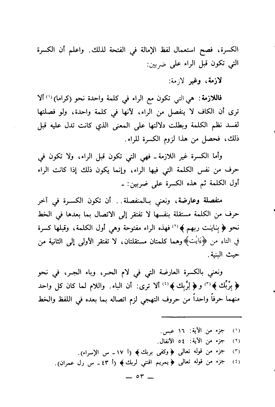 منفصلة وعارضة، ونعني بالمنفصلة .. أن تكون الكسرة في آخر حرف من الكلمة مستقلة بنفسها لا تفتقر إلى الإتصال بما بعدها في الخط نحو {بِآيَاتِ رَبِّهِمْ} (¬2) فهذه الراء مفتوحة وهي أول الكلمة، وقبلها كسرة في التاء من {ءَايت} وهما كلمتان مستقلتان، لا تفتقر الأولى إلى الثانية من حيث البنية.