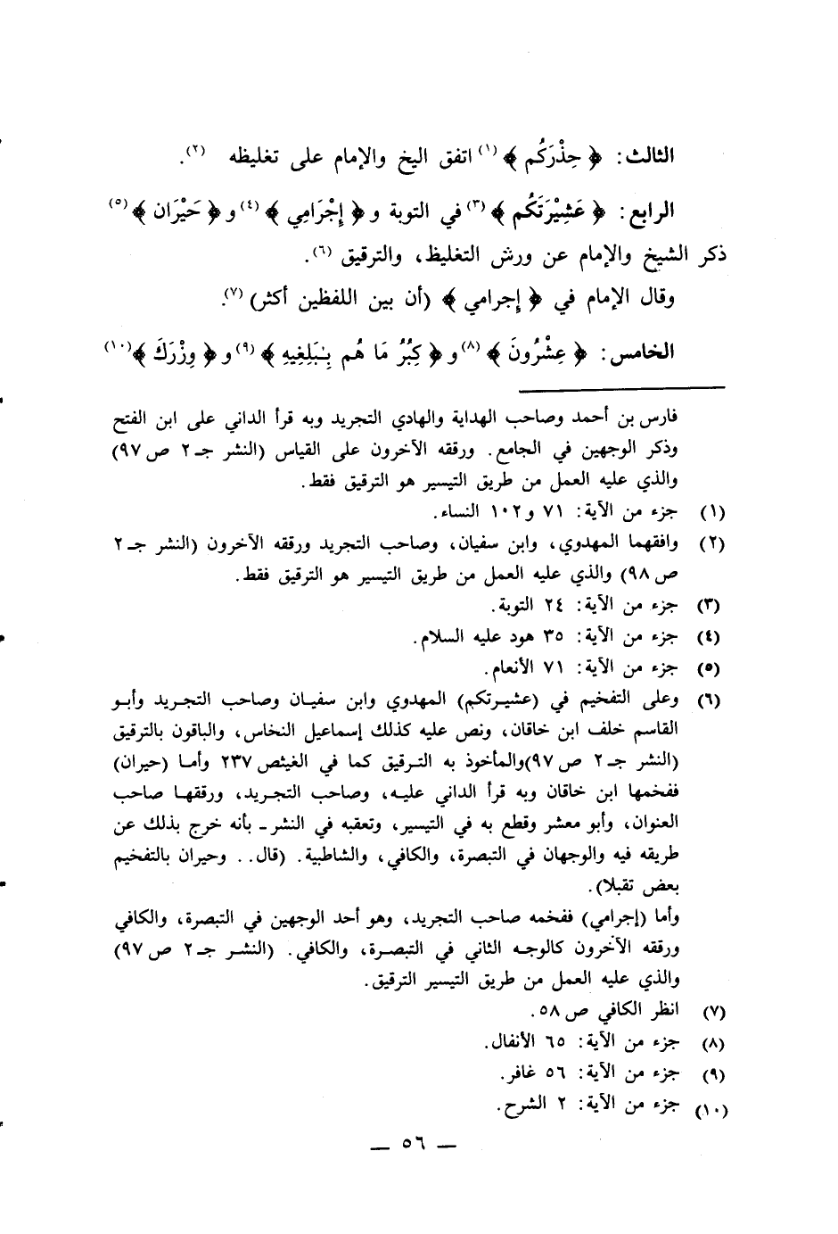 (¬6) وعلى التفخيم في (عشيرتكم) المهدوي وابن سفيان وصاحب التجريد وأبو القاسم خلف ابن خاقان، ونص عليه كذلك إسماعيل النخاس، والباقون بالترقيق (النشر جـ 2 ص 97) والمأخوذ به الترقيق كما في الغيث ص 237 وأما (حيران) ففخمها ابن خاقان وبه قرأ الداني عليه، وصاحب التجريد، ورققها صاحب العنوان، وأبو معشر وقطع به في التيسير، وتعقبه في النشر - بأنه خرج بذلك عن طريقه فيه والوجهان في التبصرة، والكافي، والشاطبية. (قال .. وحيران بالتفخيم بعض تقبلا).