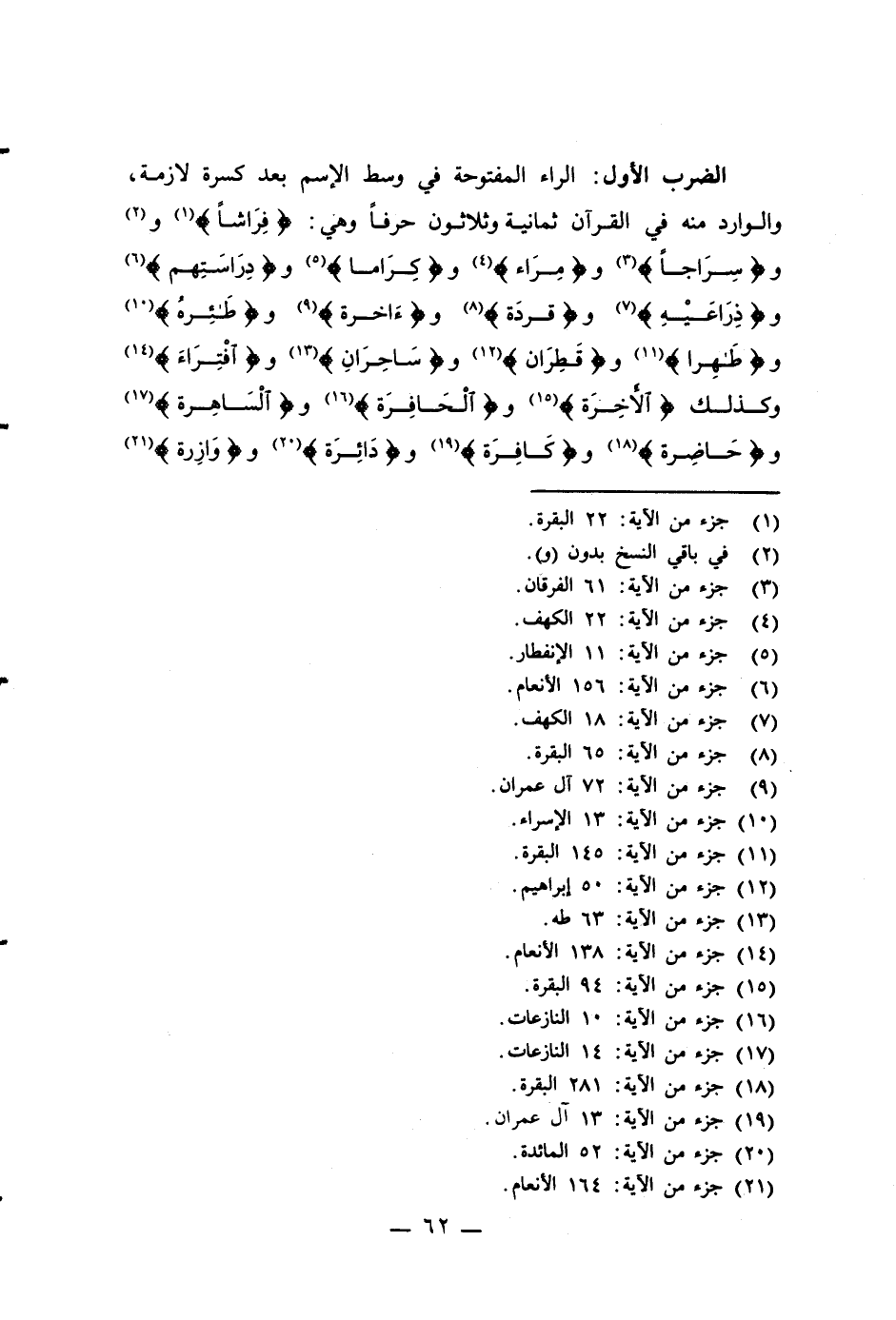 الضرب الأول: الراء المفتوحة في وسط الإسم بعد كسرة لازمة، والوارد منه في القرآن ثمانية وثلاثون حرفاً وهي: {فِرَاشاً} (¬1) و (¬2) و {سِرَاجاً} (¬3) و {مِرَاء} (¬4) و {كِرَاما} (¬5) و {دِرَاسَتِهم} (¬6) و {ذِرَاعَيْهِ} (¬7) و {قردَة} (¬8) و {ءَاخرة} (¬9) و {طَائِرهُ} (¬10) و {طَهِرا} (¬11) و {قَطِرَان} (¬12) و {سَاحِرَانِ} (¬13) و {افْتِرَاءَ} (¬14) وكذلك {الآخِرَة} (¬15) و {الْحَافِرَة} (¬16) و {الْسَاهِرة} (¬17) و {حَاضِرة} (¬18) و {كَافِرَة} (¬19) و {دَائِرَة} (¬20) و {وَازِرة} (¬21)