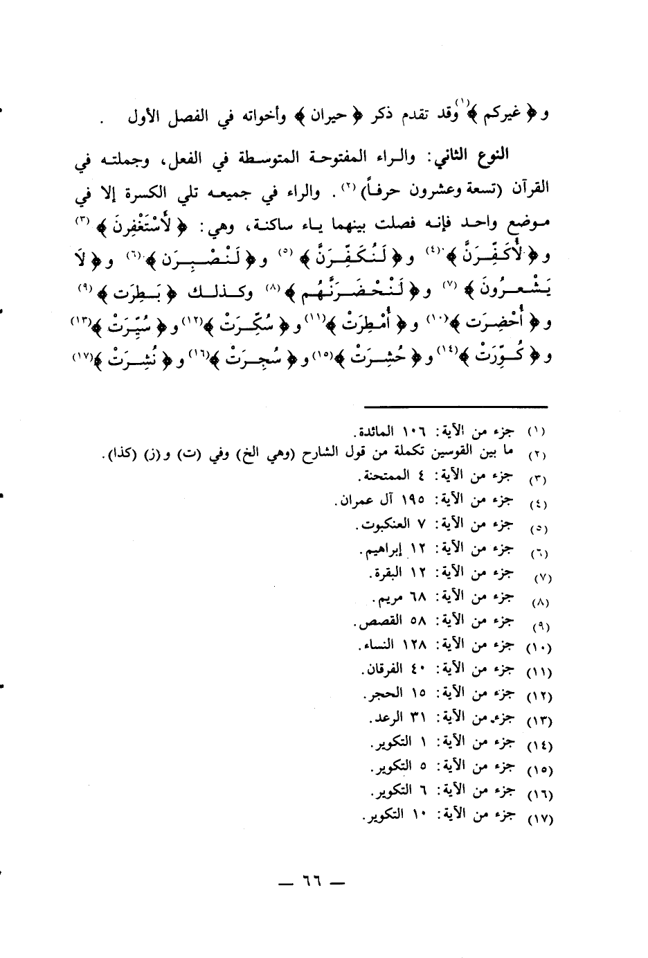 النوع الثاني: والراء المفتوحة المتوسطة في الفعل، وجملته في القرآن (تسعة وعشرون حرفًا) (¬2). والراء في جميعه تلي الكسرة إلا في موضع واحد فإنه فصلت بينهما ياء ساكنة، وهي: {لَأَسْتَغْفِرَنَّ} (¬3) و {لَأُكَفِّرَنَّ} (¬4) و {لَنُكَفِّرَنَّ} (¬5) و {لَنَصْبِرَنَّ} (¬6) و {لَا يَشْعُرُونَ} (¬7) و {لَنُحْضِرَنَّهُمْ} (¬8) وكذلك {بَطِرَتْ} (¬9) و {أَحْضَرَتْ} (¬10) و {أُمْطِرَتْ} (¬11) و {سُكِّرَتْ} (¬12) و {سُيِّرَتْ} (¬13) و {كُوِّرَتْ} (¬14) و {حُشِرَتْ} (¬15) و {سُجِّرَتْ} (¬16) و {نُشِرَتْ} (¬17)