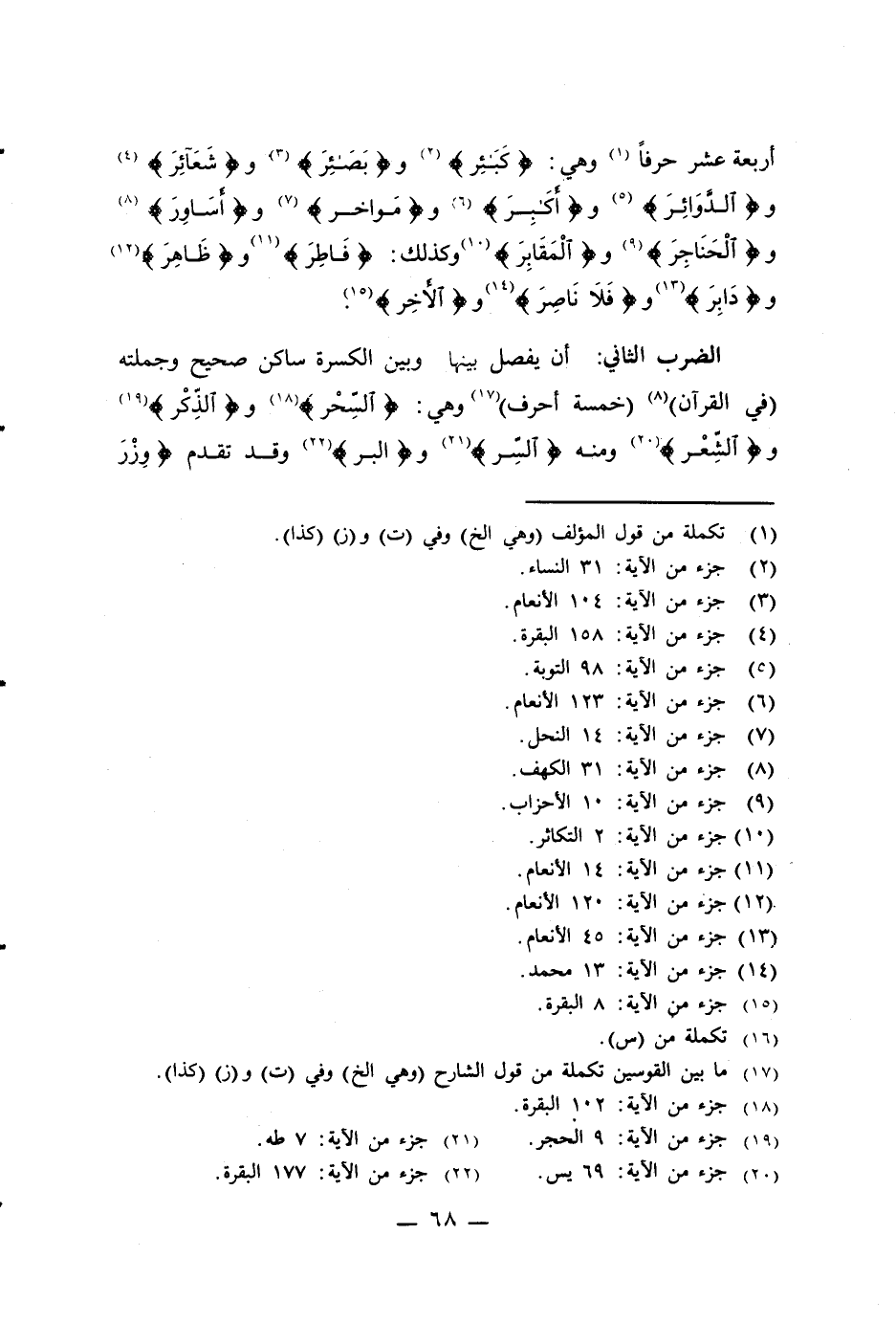 الضرب الثاني: أن يفصل بينها وبين الكسرة ساكن صحيح وجملته (في القرآن) (¬16) (خمسة أحرف) (¬17) وهي: {السِّحْرَ} (¬18) و {الذِّكْرَ} (¬19) و {الشِّعْرَ} (¬20) ومنه {السِّرَّ} (¬21) و {الْبَرِّ} (¬22) وقد تقدم {وِزْرَ