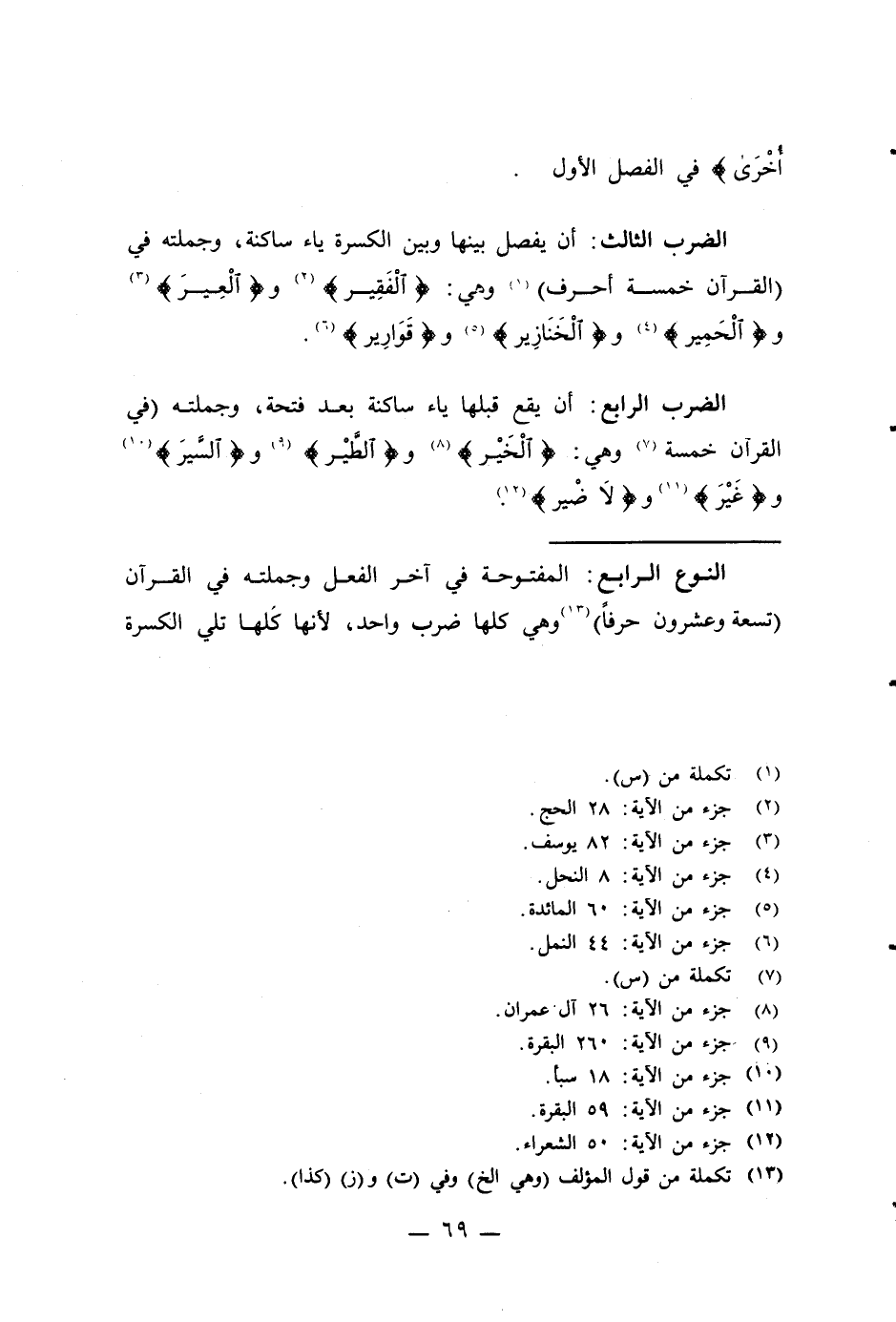 النوع الرابع: المفتوحة في آخر الفعل وجملته في القرآن (تسعة وعشرون حرفًا) (¬13) وهي كلها ضرب واحد، لأنها كَلها تلي الكسرة