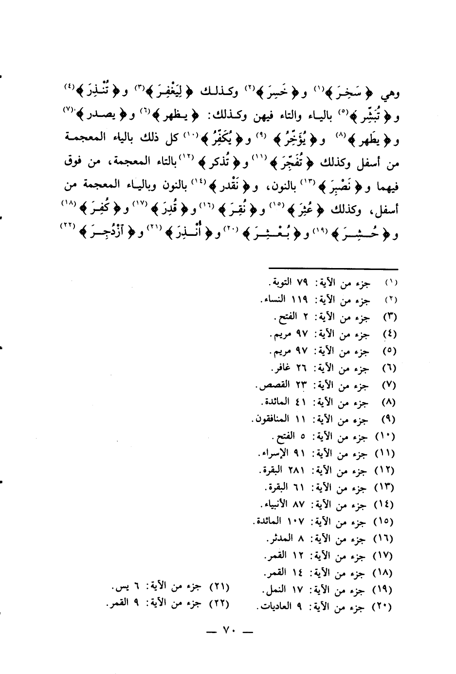 وهي {سَخَّرَ} (¬1) و {خَسِرَ} (¬2) وكذلك {لِيَغْفِرَ} (¬3) و {تُنْذِرُ} (¬4) و {لِتُبَشِّرَ} (¬5) بالياء والتاء فيهن وكذلك: {يُظْهِرُ} (¬6) و {يَصْدُرُ} (¬7) و {يُطَهِّرَ} (¬8) و {يُؤَخِّرَ} (¬9) و {يَكْفُرْ} (¬10) كل ذلك بالياء المعجمة من أسفل وكذلك {تَفْجُرَ} (¬11) و {تَذْكُرُ} (¬12) بالتاء المعجمة، من فوق فيهما و {نَصْبِرَ} (¬13) بالنون، و {نَقْدِرَ} (¬14) بالنون وبالياء المعجمة من أسفل، وكذلك {عُثِرَ} (¬15) و {نُقِرَ} (¬16) و {قَدَّرَ} (¬17) و {كُفِرَ} (¬18) و {حُشِرَ} (¬19) و {بُعْثِرَ} (¬20) و {أُنْذِرَ} (¬21) و {وَازْدُجِرَ} (¬22)