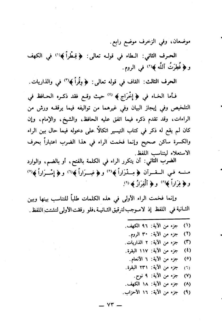 الضرب الثاني: أن يتكرر الراء في الكلمة بالفتح، أو بالضم، والوارد منه في القرآن {مِدْرَارًا} (¬5) و {ضِرَارًا} (¬6) و {إِسْرَارًا} (¬7) و {فِرَارًا} (¬8) و {الْفِرَارُ} (¬9).