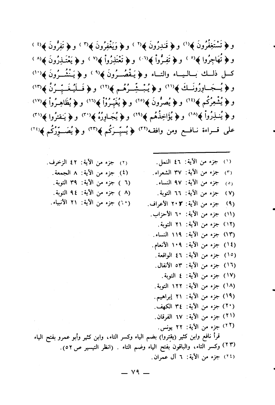 و {تَسْتَغْفِرُونَ} (¬1) و {قَادِرُونَ} (¬2) و {يَغْفِرُونَ} (¬3) و {تَفِرُّونَ} (¬4) و {فَتُهَاجِرُوا} (¬5) و {وتَفِرُّوا} (¬6) و {تَعْتَذِرُوا} (¬7) و {فَيَعْتَذِرُونَ} (¬8) كل ذلك بالياء والتاء و {يُقْصِرُونَ} (¬9) و {يُنْشِرُونَ} (¬10) و {يُجَاوِرُونَكَ} (¬11) و {يُبَشِّرُهُمْ} (¬12) و {فَلَيُغَيِّرُنَّ} (¬13) و {يُشْعِرُكُمْ} (¬14) و {يُصِرُّونَ} (¬15) و {يُغَيِّرُوا} (¬16) و {يُظَاهِرُوا} (¬17) و {وَلِيُنْذَرُوا} (¬18) و {يُؤَاخِذُهُمْ} (¬19) و {يُحَاوِرُهُ} (¬20) و {يَقْتُرُوا} (¬21) على قراءة نافع ومن وافقه (¬22) {يُسَيِّرُكُمْ} (¬23) و {يُصَوِّرُكُمْ} (¬24)
