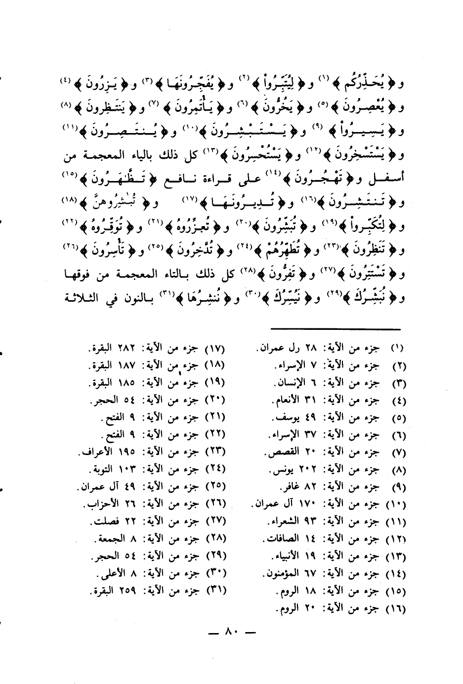 و {وَيُحَذِّرُكُمُ} (¬1) و {وَلِيُتَبِّرُوا} (¬2) و {يُفَجِّرُونَهَا} (¬3) و {يَزِرُونَ} (¬4) و {يَعْصِرُونَ} (¬5) و {يَخِرُّونَ} (¬6) و {يَأْتَمِرُونَ} (¬7) و {يَنْتَظِرُونَ} (¬8) و {يَسِيرُوا} (¬9) و {يَسْتَبْشِرُونَ} (¬10) و {يَنْتَصِرُونَ} (¬11) و {يَسْتَسْخِرُونَ} (¬12) و {يَسْتَحْسِرُونَ} (¬13) كل. ذلك بالياء المعجمة من أسفل و {تَهْجُرُونَ} (¬14) على قراءة نافع {تَظَاهَرُونَ} (¬15) و {تَنْتَشِرُونَ} (¬16) و {تُدِيرُونَهَا} (¬17) و {تُبَاشِرُوهُنَّ} (¬18) و {لِتُكَبِّرُوا} (¬19) و {تُبَشِّرُونَ} (¬20) و {وَتُعَزِّرُوهُ} (¬21) و {وَتُوَقِّرُوهُ} (¬22) و {تَنْظُرُونَ} (¬23) و {تُطَهِّرُهُمْ} (¬24) و {تَدَّخِرُو} (¬25) و {وَتَأْسِرُونَ} (¬26) و {تَسْتَتِرُونَ} (¬27) و {تَفِرُّونَ} (¬28) كل ذلك بالتاء المعجمة من فوقها و {نُبَشِّرُكَ} (¬29) و {وَنُيَسِّرُكَ} (¬30) و {نُنشِرُهَا} (¬31) بالنون في الثلاثة
