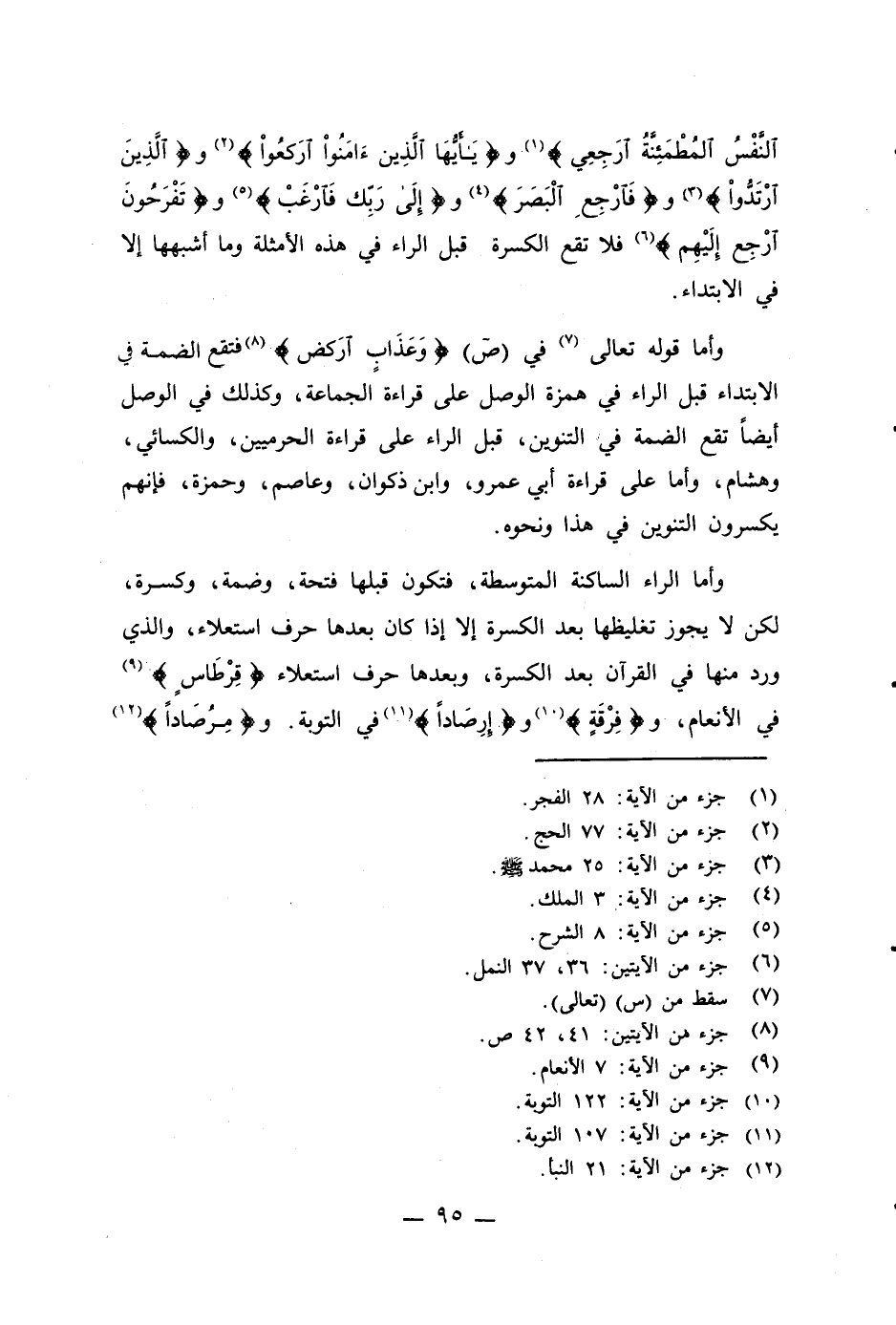 النَّفْسُ الْمُطْمَئِنَّةُ (27) ارْجِعِي} (¬1) و {يَاأَيُّهَا الَّذِينَ آمَنُوا ارْكَعُوا} (¬2) و {الَّذِينَ ارْتَدُّوا} (¬3) و {فَارْجِعِ الْبَصَرَ} (¬4) و {وَإِلَى رَبِّكَ فَارْغَبْ} (¬5) و {تَفْرَحُونَ (36) ارْجِعْ إِلَيْهِمْ} (¬6) فلا تقع الكسرة قبل الراء في هذه الأمثلة وما أشبهها إلا في الإبتداء.