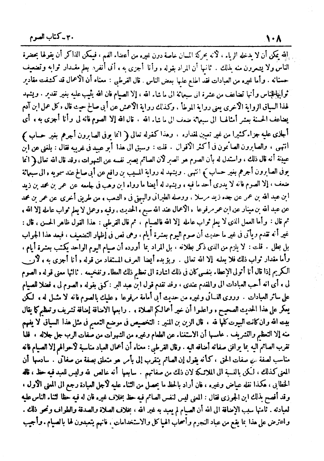 اللَّهُ يُمْكِنُ أَنْ لَا يَدْخُلَهُ الرِّيَاءُ لِأَنَّهُ بِحَرَكَةِ اللِّسَانِ خَاصَّةً دُونَ غَيْرِهِ مِنْ أَعْضَاءِ الْفَمِ فَيُمْكِنُ الذَّاكِرُ أَنْ يَقُولَهَا بِحَضْرَةِ النَّاسِ وَلَا يَشْعُرُونَ مِنْهُ بِذَلِكَ ثَانِيهَا أَنَّ الْمُرَادَ بِقَوْلِهِ وَأَنَا أَجْزِي بِهِ أَنِّي أَنْفَرِدُ بِعِلْمِ مِقْدَارِ ثَوَابِهِ وَتَضْعِيفِ حَسَنَاتِهِ وَأَمَّا غَيْرُهُ مِنَ الْعِبَادَاتِ فَقَدِ اطَّلَعَ عَلَيْهَا بَعْضُ النَّاسِ قَالَ الْقُرْطُبِيُّ مَعْنَاهُ أَنَّ الْأَعْمَالَ قَدْ كَشَفَتْ مَقَادِيرَ ثَوَابِهَا لِلنَّاسِ وَأَنَّهَا تُضَاعَفُ مِنْ عَشْرَةٍ إِلَى سَبْعِمِائَةٍ إِلَى مَا شَاءَ اللَّهُ إِلَّا الصِّيَامَ فَإِنَّ اللَّهَ يُثِيبُ عَلَيْهِ بِغَيْرِ تَقْدِيرٍ وَيَشْهَدُ لِهَذَا السِّيَاقِ الرِّوَايَةُ الْأُخْرَى يَعْنِي رِوَايَةَ الْمُوَطَّأِ وَكَذَلِكَ رِوَايَةُ الْأَعْمَشِ عَنْ أَبِي صَالِحٍ حَيْثُ قَالَ كل عمل بن آدَمَ يُضَاعَفُ الْحَسَنَةُ بِعَشْرِ أَمْثَالِهَا إِلَى سَبْعِمِائَةِ ضِعْفٍ إِلَى مَا شَاءَ اللَّهُ قَالَ اللَّهُ إِلَّا الصَّوْمَ فَإِنَّهُ لِي وَأَنَا أَجْزِي بِهِ أَيْ أُجَازِي عَلَيْهِ جَزَاءً كَثِيرًا مِنْ غَيْرِ تَعْيِينٍ لِمِقْدَارِهِ وَهَذَا كَقَوْلِهِ تَعَالَى إِنَّمَا يُوَفَّى الصَّابِرُونَ أَجْرَهُمْ بِغَيْرِ حِسَابٍ انْتَهَى وَالصَّابِرُونَ الصَّائِمُونَ فِي أَكْثَرِ الْأَقْوَالِ قُلْتُ وَسَبَقَ إِلَى هَذَا أَبُو عُبَيْدٍ فِي غَرِيبِهِ فَقَالَ بَلغنِي عَن بن عُيَيْنَةَ أَنَّهُ قَالَ ذَلِكَ وَاسْتَدَلَّ لَهُ بِأَنَّ الصَّوْمَ هُوَ الصَّبْرُ لِأَنَّ الصَّائِمَ يُصَبِّرُ نَفْسَهُ عَنِ الشَّهَوَاتِ وَقَدْ قَالَ اللَّهُ تَعَالَى إِنَّمَا يُوَفَّى الصَّابِرُونَ أَجْرَهُمْ بِغَيْرِ حِسَاب انْتَهَى وَيَشْهَدُ رِوَايَةُ الْمُسَيَّبِ بْنِ رَافِعٍ عَنْ أَبِي صَالِحٍ عِنْدَ سَمَوَيْهِ إِلَى سَبْعِمِائَةِ ضِعْفٍ إِلَّا الصَّوْمَ فَإِنَّهُ لَا يَدْرِي أَحَدٌ مَا فِيهِ وَيشْهد لَهُ أَيْضا مَا رَوَاهُ بن وَهْبٍ فِي جَامِعِهِ عَنْ عُمَرَ بْنِ مُحَمَّدَ بْنَ زَيْدِ بْنِ عَبْدِ اللَّهِ بْنِ عُمَرَ عَنْ جَدِّهِ زَيْدٍ مُرْسَلًا وَوَصَلَهُ الطَّبَرَانِيُّ وَالْبَيْهَقِيُّ فِي الشُّعَبِ مِنْ طَرِيقٍ أُخْرَى عَنْ عُمَرَ بن مُحَمَّد عَن عبد الله بن مينار عَن بن عُمَرَ مَرْفُوعًا الْأَعْمَالُ عِنْدَ اللَّهِ سَبْعٌ الْحَدِيثَ وَفِيهِ وَعَمَلٌ لَا يَعْلَمُ ثَوَابَ عَامِلِهِ إِلَّا اللَّهُ ثُمَّ قَالَ وَأَمَّا الْعَمَلُ الَّذِي لَا يَعْلَمُ ثَوَابَ عَامِلِهِ إِلَّا اللَّهُ فَالصِّيَامُ ثُمَّ قَالَ الْقُرْطُبِيُّ هَذَا الْقَوْلُ ظَاهِرُ الْحُسْنِ قَالَ غَيْرَ أَنَّهُ تَقَدَّمَ وَيَأْتِي فِي غَيْرِ مَا حَدِيثٍ أَنَّ صَوْمَ الْيَوْمِ بِعَشْرَةِ أَيَّامٍ وَهِيَ نَصٌّ فِي إِظْهَارِ التَّضْعِيفِ فَبَعُدَ هَذَا الْجَوَابُ بَلْ بَطَلَ قُلْتُ لَا يَلْزَمُ مِنَ الَّذِي ذُكِرَ بُطْلَانُهُ بَلِ الْمُرَادُ بِمَا أَوْرَدَهُ أَنَّ صِيَامَ الْيَوْمِ الْوَاحِدِ يُكْتَبُ بِعَشْرَةِ أَيَّامٍ وَأَمَّا مِقْدَارُ ثَوَابِ ذَلِكَ فَلَا يَعْلَمُهُ إِلَّا اللَّهُ تَعَالَى وَيُؤَيِّدُهُ أَيْضًا الْعُرْفُ الْمُسْتَفَادُ مِنْ قَوْلِهِ أَنَا أَجْزِي بِهِ لِأَنَّ الْكَرِيمَ إِذَا قَالَ أَنَا أَتَوَلَّى الْإِعْطَاءَ بِنَفْسِي كَانَ فِي ذَلِكَ إِشَارَةٌ إِلَى تَعْظِيمِ ذَلِكَ الْعَطَاءِ وَتَفْخِيمِهِ ثَالِثُهَا مَعْنَى قَوْلِهِ الصَّوْمُ لِي أَيْ إِنَّهُ أَحَبُّ الْعِبَادَاتِ إِلَيَّ وَالْمُقَدَّمُ عِنْدِي وَقَدْ تَقَدَّمَ قَوْلُ بن عَبْدِ الْبَرِّ كَفَى بِقَوْلِهِ الصَّوْمُ لِي فَضْلًا لِلصِّيَامِ عَلَى سَائِرِ الْعِبَادَاتِ وَرَوَى النَّسَائِيُّ وَغَيْرُهُ مِنْ ح