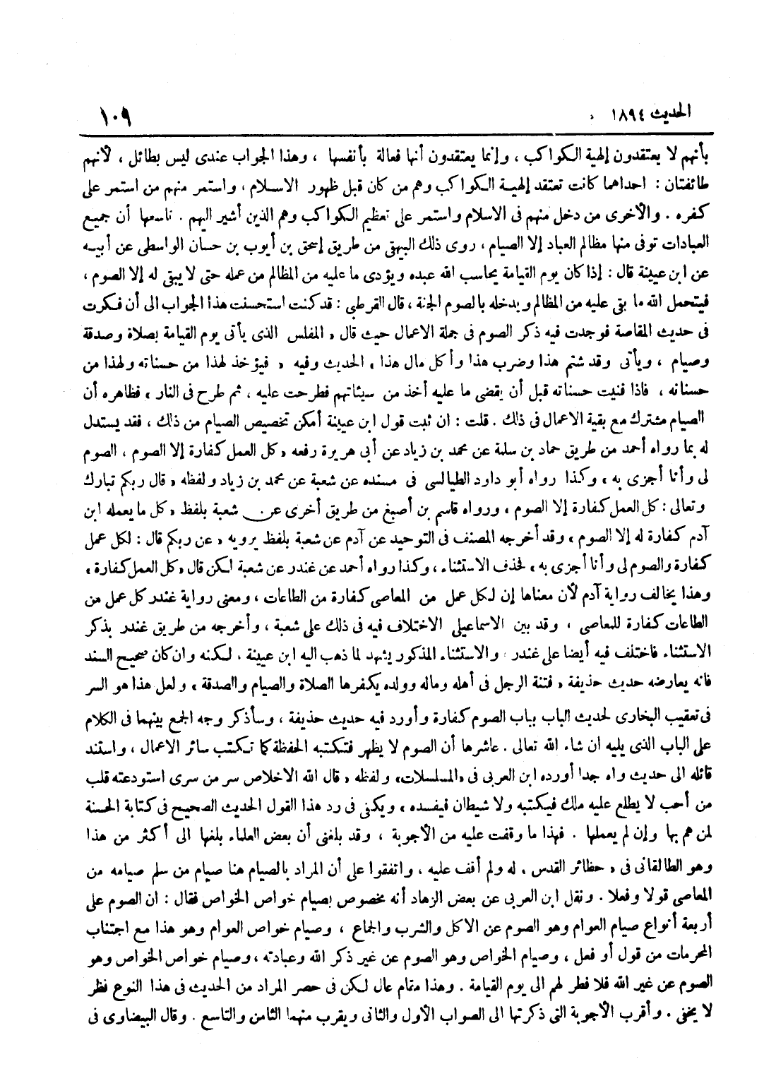 بِأَنَّهُمْ لَا يَعْتَقِدُونَ إِلَهِيَّةَ الْكَوَاكِبِ وَإِنَّمَا يَعْتَقِدُونَ أَنَّهَا فَعَّالَةٌ بِأَنْفُسِهَا وَهَذَا الْجَوَابُ عِنْدِي لَيْسَ بِطَائِلٍ لِأَنَّهُمْ طَائِفَتَانِ إِحْدَاهُمَا كَانَتْ تَعْتَقِدُ إِلَهِيَّةَ الْكَوَاكِبِ وَهُمْ مَنْ كَانَ قَبْلَ ظُهُورِ الْإِسْلَامِ وَاسْتَمَرَّ مِنْهُمْ مَنِ اسْتَمَرَّ عَلَى كُفْرِهِ وَالْأُخْرَى مَنْ دَخَلَ مِنْهُمْ فِي الْإِسْلَامِ وَاسْتَمَرَّ عَلَى تَعْظِيمِ الْكَوَاكِبِ وَهُمُ الَّذِينَ أُشِيرَ إِلَيْهِمْ تَاسِعُهَا أَنَّ جَمِيعَ الْعِبَادَاتِ تُوَفَّى مِنْهَا مَظَالِمُ الْعِبَادِ إِلَّا الصِّيَامَ رَوَى ذَلِكَ الْبَيْهَقِيُّ مِنْ طَرِيقِ إِسْحَاقَ بْنِ أَيُّوبَ بْنِ حَسَّانَ الْوَاسِطِيِّ عَنْ أَبِيه عَن بن عُيَيْنَةَ قَالَ إِذَا كَانَ يَوْمُ الْقِيَامَةِ يُحَاسِبُ اللَّهُ عَبْدَهُ وَيُؤَدِّي مَا عَلَيْهِ مِنَ الْمَظَالِمِ مِنْ عَمَلِهِ حَتَّى لَا يَبْقَى لَهُ إِلَّا الصَّوْمُ فَيَتَحَمَّلُ اللَّهُ مَا بَقِيَ عَلَيْهِ مِنَ الْمَظَالِمِ وَيُدْخِلُهُ بِالصَّوْمِ الْجَنَّةَ قَالَ الْقُرْطُبِيُّ قَدْ كُنْتُ اسْتَحْسَنْتُ هَذَا الْجَوَابَ إِلَى أَنْ فَكَّرْتُ فِي حَدِيثِ الْمُقَاصَّةِ فَوَجَدْتُ فِيهِ ذِكْرَ الصَّوْمِ فِي جُمْلَةِ الْأَعْمَالِ حَيْثُ قَالَ الْمُفْلِسُ الَّذِي يَأْتِي يَوْمَ الْقِيَامَةِ بِصَلَاةٍ وَصَدَقَةٍ وَصِيَامٍ وَيَأْتِي وَقَدْ شَتَمَ هَذَا وَضَرَبَ هَذَا وَأَكَلَ مَالِ هَذَا الْحَدِيثَ وَفِيهِ فَيُؤْخَذُ لِهَذَا مِنْ حَسَنَاتِهِ وَلِهَذَا مِنْ حَسَنَاتِهِ فَإِذَا فَنِيَتْ حَسَنَاتُهُ قَبْلَ أَنْ يَقْضِيَ مَا عَلَيْهِ أُخِذَ مِنْ سَيِّئَاتِهِمْ فَطُرِحَتْ عَلَيْهِ ثُمَّ طُرِحَ فِي النَّارِ فَظَاهِرُهُ أَنَّ الصِّيَامَ مُشْتَرِكٌ مَعَ بَقِيَّةِ الْأَعْمَالِ فِي ذَلِك قلت أَن ثَبت قَول بن عُيَيْنَةَ أَمْكَنَ تَخْصِيصُ الصِّيَامِ مِنْ ذَلِكَ فَقَدْ يُسْتَدَلُّ لَهُ بِمَا رَوَاهُ أَحْمَدُ مِنْ طَرِيقِ حَمَّادِ بْنِ سَلَمَةَ عَنْ مُحَمَّدِ بْنِ زِيَادٍ عَنْ أَبِي هُرَيْرَةَ رَفَعَهُ كُلُّ الْعَمَلِ كَفَّارَةٌ إِلَّا الصَّوْمَ الصَّوْمُ لِي وَأَنَا أَجْزِي بِهِ وَكَذَا رَوَاهُ أَبُو دَاوُدَ الطَّيَالِسِيُّ فِي مُسْنَدِهِ عَنْ شُعْبَةَ عَنْ مُحَمَّدِ بْنِ زِيَادٍ وَلَفْظُهُ قَالَ رَبُّكُمْ تَبَارَكَ وَتَعَالَى كُلُّ الْعَمَلِ كَفَّارَةٌ إِلَّا الصَّوْمَ وَرَوَاهُ قَاسِمُ بْنُ أَصْبَغَ مِنْ طَرِيقٍ أُخْرَى عَنْ شُعْبَةَ بِلَفْظِ كُلُّ مَا يعمله بن آدَمَ كَفَّارَةٌ لَهُ إِلَّا الصَّوْمَ وَقَدْ أَخْرَجَهُ الْمُصَنِّفُ فِي التَّوْحِيدِ عَنْ آدَمَ عَنْ شُعْبَةَ بِلَفْظٍ يَرْوِيهِ عَنْ رَبِّكُمْ قَالَ لِكُلِّ عَمَلٍ كَفَّارَةٌ وَالصَّوْمُ لِي وَأَنَا أَجْزِي بِهِ فَحَذَفَ الِاسْتِثْنَاءَ وَكَذَا رَوَاهُ أَحْمَدُ عَنْ غُنْدَرٍ عَنْ شُعْبَةَ لَكِنْ قَالَ كُلُّ الْعَمَلِ كَفَّارَةٌ وَهَذَا يُخَالِفُ رِوَايَةَ آدَمَ لِأَنَّ مَعْنَاهَا إِنَّ لِكُلِّ عَمَلٍ مِنَ الْمَعَاصِي كَفَّارَةٌ مِنَ الطَّاعَاتِ وَمَعْنَى رِوَايَةِ غُنْدَرٍ كُلُّ عَمَلٍ مِنَ الطَّاعَاتِ كَفَّارَةٌ لِلْمَعَاصِي وَقَدْ بَيَّنَ الْإِسْمَاعِيلِيُّ الِاخْتِلَافَ فِيهِ فِي ذَلِكَ عَلَى شُعْبَةَ وَأَخْرَجَهُ مِنْ طَرِيقِ غُنْدَرٍ بِذِكْرِ الِاسْتِثْنَاءِ فَاخْتُلِفَ فِيهِ أَيْضًا عَلَى غُنْدَرٍ وَالِاسْتِثْنَاء الْمَذْكُور يشْهد لما ذهب إِلَيْهِ بن عُيَيْنَةَ لَكِنَّهُ وَإِنْ كَانَ صَحِيحَ السَّنَدِ فَإِنَّهُ يُعَارِضُهُ حَدِيثُ حُذَيْفَةَ فِتْنَةُ الرَّجُلِ فِي أَهْلِهِ وَمَالِهِ وَوَلَدِهِ يُكَفِّرُهَا الصَّلَاةُ وَالصِّيَامُ وَالصَّدَقَةُ وَلَعَلَّ هَذَا هُوَ السِّرَّ فِي تَعْقِيبِ الْبُخَارِيِّ لِحَدِي