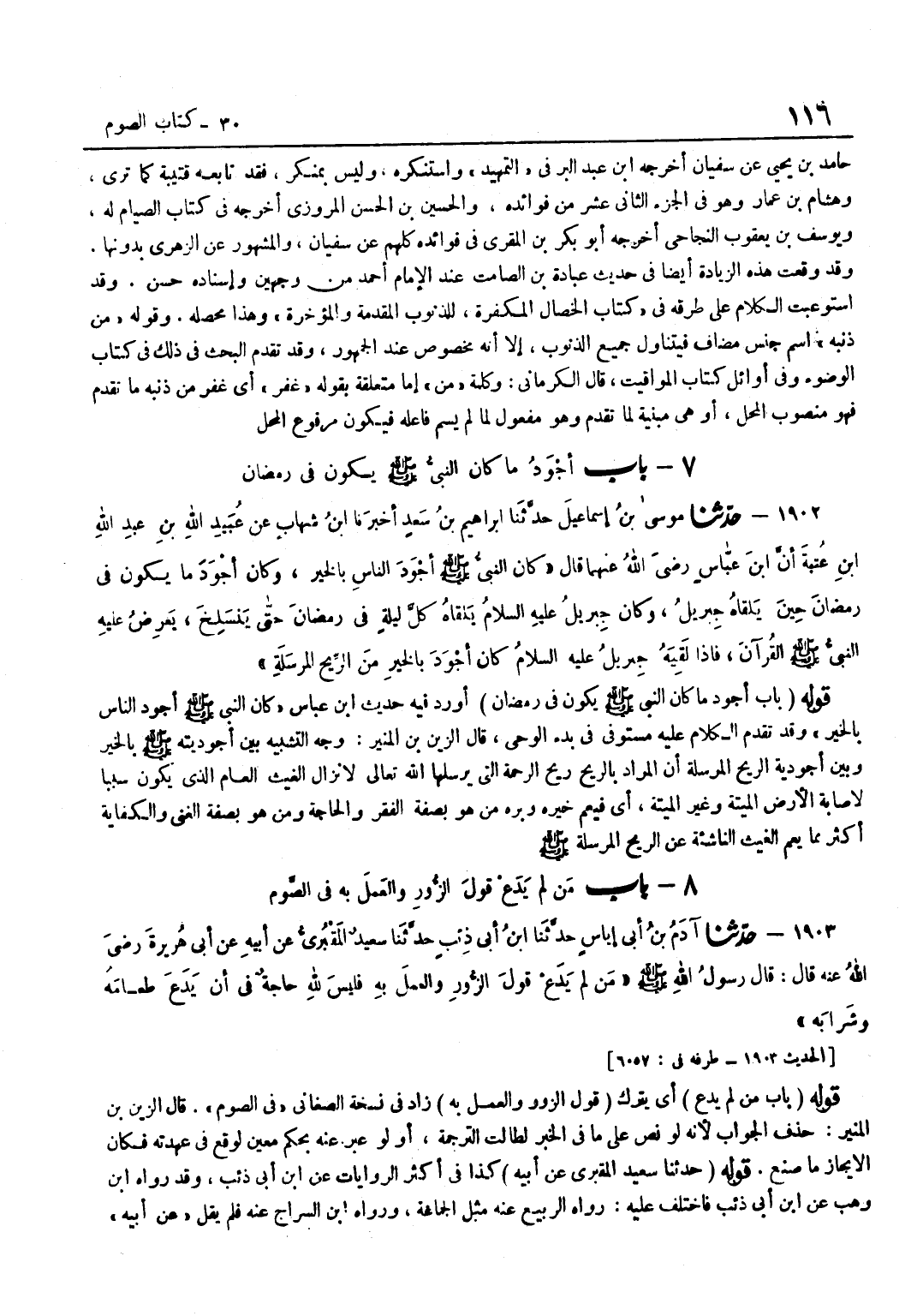 أَوْرَدَ فِيهِ حَدِيث بن عَبَّاسٍ كَانَ النَّبِيُّ صَلَّى اللَّهُ عَلَيْهِ وَسَلَّمَ أَجْوَدَ النَّاسِ بِالْخَيْرِ وَقَدْ تَقَدَّمَ الْكَلَامُ عَلَيْهِ مُسْتَوْفًى فِي بَدْءِ الْوَحْيِ قَالَ الزَّيْنُ بْنُ الْمُنِيرِ وَجْهُ التَّشْبِيهِ بَيْنَ أَجْوَدِيَّتِهِ صَلَّى اللَّهُ عَلَيْهِ وَسَلَّمَ بِالْخَيْرِ وَبَيْنَ أَجْوَدِيَّةِ الرِّيحِ الْمُرْسَلَةِ أَنَّ الْمُرَادَ بِالرِّيحِ رِيحُ الرَّحْمَةِ الَّتِي يُرْسِلُهَا اللَّهُ تَعَالَى لِإِنْزَالِ الْغَيْثِ الْعَامِّ الَّذِي يَكُونُ سَبَبًا لِإِصَابَةِ الْأَرْضِ الْمَيْتَةِ وَغَيْرِ الْمَيْتَةِ أَيْ فَيَعُمُّ خَيْرُهُ وَبِرُّهُ مَنْ هُوَ بِصِفَةِ الْفَقْرِ وَالْحَاجَةِ وَمَنْ هُوَ بِصِفَةِ الْغِنَى وَالْكِفَايَةِ أَكْثَرَ مِمَّا يَعُمُّ الْغَيْثُ النَّاشِئَةُ عَنِ الرِّيحِ الْمُرْسَلَةِ صَلَّى اللَّهُ عَلَيْهِ وَسَلَّمَ قَوْلُهُ بَابُ مَنْ لَمْ يَدَعْ أَيْ يَتْرُكْ قَوْلَ الزُّورِ وَالْعَمَلَ بِهِ زَادَ فِي نُسْخَةِ الصَّغَانِيِّ فِي الصَّوْمِ قَالَ الزَّيْنُ بْنُ الْمُنِيرِ حَذَفَ الْجَوَابَ لِأَنَّهُ لَوْ نَصَّ عَلَى مَا فِي الْخَبَرِ لَطَالَتِ التَّرْجَمَةُ أَوْ لَوْ عَبَّرَ عَنْهُ بِحُكْمٍ مُعَيَّنٍ لَوَقَعَ فِي عُهْدَتِهِ فَكَانَ الإيجاز مَا صنع