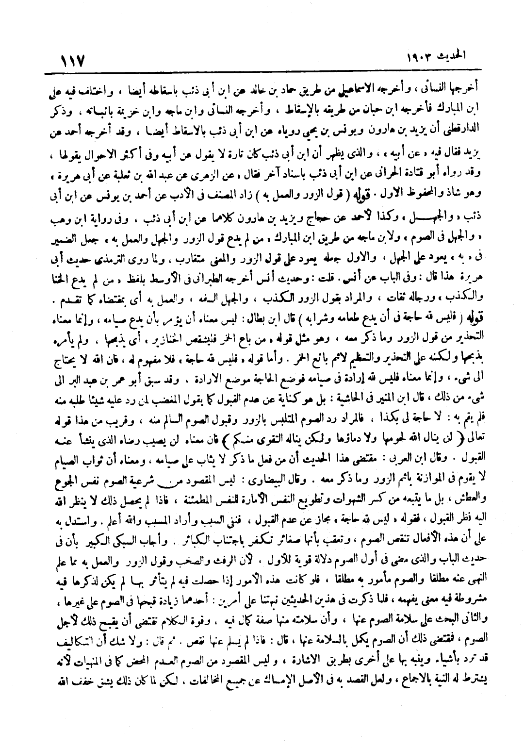 أَخْرَجَهَا النَّسَائِيُّ وَأَخْرَجَهُ الْإِسْمَاعِيلِيُّ مِنْ طَرِيقِ حَمَّادِ بن خَالِد عَن بن أَبِي ذِئْبٍ بِإِسْقَاطِهِ أَيْضًا وَاخْتُلِفَ فِيهِ عَلَى بن الْمُبَارك فَأخْرجهُ بن حبَان من طَرِيقه بالاسقاط وَأخرجه النَّسَائِيّ وبن ماجة وبن خُزَيْمَةَ بِإِثْبَاتِهِ وَذَكَرَ الدَّارَقُطْنِيُّ أَنَّ يَزِيدَ بْنَ هَارُون وَيُونُس بن يحيى روياه عَن بن أَبِي ذِئْبٍ بِالْإِسْقَاطِ أَيْضًا وَقَدْ أَخْرَجَهُ أَحْمَدُ عَنْ يَزِيدَ فَقَالَ فِيهِ عَنْ أَبِيهِ وَالَّذِي يظْهر أَن بن أَبِي ذِئْبٍ كَانَ تَارَةً لَا يَقُولُ عَنْ أَبِيهِ وَفِي أَكْثَرِ الْأَحْوَالِ يَقُولُهَا وَقَدْ رَوَاهُ أَبُو قَتَادَة الْحَرَّانِي عَن بن أَبِي ذِئْبٍ بِإِسْنَادٍ آخَرَ فَقَالَ عَنِ الزُّهْرِيِّ عَنْ عَبْدِ اللَّهِ بْنِ ثَعْلَبَةَ عَنْ أَبِي هُرَيْرَةَ وَهُوَ شَاذٌّ وَالْمَحْفُوظُ الْأَوَّلُ قَوْلُهُ قَوْلَ الزُّورِ وَالْعَمَلَ بِهِ زَادَ الْمُصَنِّفُ فِي الْأَدَبِ عَن أَحْمد بن يُونُس عَن بن أَبِي ذِئْبٍ وَالْجَهْلَ وَكَذَا لِأَحْمَدَ عَنْ حَجَّاجٍ وَيزِيد بن هَارُون كِلَاهُمَا عَن بن أبي ذِئْب وَفِي رِوَايَة بن وَهْبٍ وَالْجَهْلَ فِي الصَّوْمِ وَلِابْنِ مَاجَهْ مِنْ طَرِيق بن الْمُبَارَكِ مَنْ لَمْ يَدَعْ قَوْلَ الزُّورِ وَالْجَهْلَ وَالْعَمَلَ بِهِ جَعَلَ الضَّمِيرَ فِي بِهِ يُعُودُ عَلَى الْجَهْلِ وَالْأَوَّلُ جَعَلَهُ يَعُودُ عَلَى قَوْلِ الزُّورِ وَالْمَعْنَى مُتَقَارِبٌ وَلَمَّا رَوَى التِّرْمِذِيُّ حَدِيثَ أَبِي هُرَيْرَةَ هَذَا قَالَ وَفِي الْبَابِ عَنْ أَنَسٍ قُلْتُ وَحَدِيثُ أَنَسٍ أَخْرَجَهُ الطَّبَرَانِيُّ فِي الْأَوْسَطِ بِلَفْظِ مَنْ لَمْ يَدَعِ الْخَنَا وَالْكَذِبَ وَرِجَالُهُ ثِقَاتٌ وَالْمُرَادُ بِقَوْلِ الزُّورِ الْكَذِبُ وَالْجَهْلِ السَّفَهُ وَالْعَمَلِ بِهِ أَيْ بِمُقْتَضَاهُ كَمَا تَقَدَّمَ قَوْلُهُ فَلَيْسَ لِلَّهِ حَاجَةٌ فِي أَنْ يَدَعَ طَعَامه وَشَرَابه قَالَ بن بَطَّالٍ لَيْسَ مَعْنَاهُ أَنْ يُؤْمَرَ بِأَنْ يَدَعَ صِيَامَهُ وَإِنَّمَا مَعْنَاهُ التَّحْذِيرُ مِنْ قَوْلِ الزُّورِ وَمَا ذُكِرَ مَعَهُ وَهُوَ مِثْلُ قَوْلِهِ مَنْ بَاعَ الْخَمْرَ فَلْيُشَقِّصِ الْخَنَازِيرَ أَيْ يَذْبَحُهَا وَلَمْ يَأْمُرْهُ بِذَبْحِهَا وَلَكِنَّهُ عَلَى التَّحْذِيرِ وَالتَّعْظِيمِ لِإِثْمِ بَائِعِ الْخَمْرِ وَأَمَّا قَوْلُهُ فَلَيْسَ لِلَّهِ حَاجَةٌ فَلَا مَفْهُومَ لَهُ فَإِنَّ اللَّهَ لَا يَحْتَاجُ إِلَى شَيْءٍ وَإِنَّمَا مَعْنَاهُ فَلَيْسَ لِلَّهِ إِرَادَةٌ فِي صِيَامِهِ فَوَضَعَ الْحَاجَةَ مَوْضِعَ الْإِرَادَةِ وَقَدْ سَبَقَ أَبُو عُمَرَ بْنُ عَبْدِ الْبَرِّ إِلَى شَيْء من ذَلِك قَالَ بن الْمُنِيرِ فِي الْحَاشِيَةِ بَلْ هُوَ كِنَايَةٌ عَنْ عَدَمِ الْقَبُولِ كَمَا يَقُولُ الْمُغْضَبُ لِمَنْ رَدَّ عَلَيْهِ شَيْئًا طَلَبَهُ مِنْهُ فَلَمْ يَقُمْ بِهِ لَا حَاجَةَ لِي بِكَذَا فَالْمُرَادُ رَدُّ الصَّوْمِ الْمُتَلَبِّسِ بِالزُّورِ وَقَبُولُ السَّالِمِ مِنْهُ وَقَرِيبٌ مِنْ هَذَا قَوْلُهُ تَعَالَى لَنْ يَنَالَ اللَّهَ لُحُومُهَا وَلَا دماؤها وَلَكِن يَنَالهُ التَّقْوَى مِنْكُم فَإِنَّ مَعْنَاهُ لَنْ يُصِيبَ رِضَاهُ الَّذِي يَنْشَأُ عَنهُ الْقبُول وَقَالَ بن الْعَرَبِيِّ مُقْتَضَى هَذَا الْحَدِيثِ أَنَّ مَنْ فَعَلَ مَا ذُكِرَ لَا يُثَابُ عَلَى صِيَامِهِ وَمَعْنَاهُ أَنَّ ثَوَابَ الصِّيَامِ لَا يَقُومُ فِي الْمُوَازَنَةِ بِإِثْمِ الزُّورِ وَمَا ذُكِرَ مَعَهُ وَقَالَ الْبَيْضَاوِيُّ لَيْسَ الْمَقْصُودُ مِنْ شَرْعِيَّةِ الصَّوْمِ نَفْسَ الْجُوعِ وَالْعَطَشِ بَلْ مَا يَتْبَعُهُ مِنْ كَسْرِ الشَّهَوَاتِ وَتَطْوِيعِ النَّفْسِ الْأَمَّارَةِ لِلنَّفْسِ الْمُطْمَئِنَّةِ فَإِذَا 