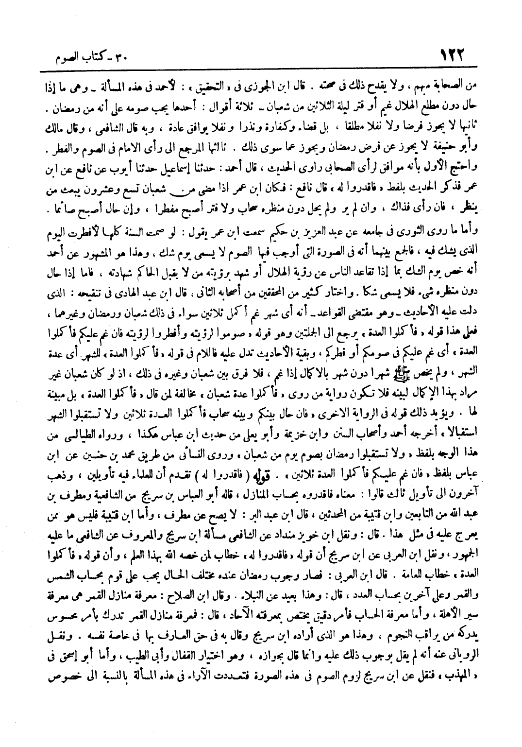 مِنَ الصَّحَابَةِ مُبْهَمٍ وَلَا يَقْدَحُ ذَلِكَ فِي صِحَّته قَالَ بن الْجَوْزِيِّ فِي التَّحْقِيقِ لِأَحْمَدَ فِي هَذِهِ الْمَسْأَلَةِ وَهِيَ مَا إِذَا حَالَ دُونَ مَطْلِعِ الْهِلَالِ غَيْمٌ أَوْ قَتَرٌ لَيْلَةَ الثَّلَاثِينَ مِنْ شَعْبَانَ ثَلَاثَةُ أَقْوَالٍ أَحَدُهَا يَجِبُ صَوْمُهُ عَلَى أَنَّهُ مِنْ رَمَضَانَ ثَانِيهَا لَا يَجُوزُ فَرْضًا وَلَا نَفْلًا مُطْلَقًا بَلْ قَضَاءً وَكَفَّارَةً وَنَذْرًا وَنَفْلًا يُوَافِقُ عَادَةً وَبِهِ قَالَ الشَّافِعِيُّ وَقَالَ مَالِكٌ وَأَبُو حَنِيفَةَ لَا يَجُوزُ عَنْ فَرْضِ رَمَضَانَ وَيَجُوزُ عَمَّا سِوَى ذَلِكَ ثَالِثُهَا الْمَرْجِعُ إِلَى رَأْيِ الْإِمَامِ فِي الصَّوْمِ وَالْفِطْرِ وَاحْتَجَّ الْأَوَّلُ بِأَنَّهُ مُوَافِقٌ لِرَأْيِ الصَّحَابِيِّ رَاوِي الْحَدِيثِ قَالَ أَحْمَدُ حَدَّثَنَا إِسْمَاعِيلُ حَدَّثَنَا أَيُّوبُ عَنْ نَافِعٍ عَن بن عُمَرَ فَذَكَرَ الْحَدِيثَ بِلَفْظِ فَاقْدُرُوا لَهُ قَالَ نَافِع فَكَانَ بن عُمَرَ إِذَا مَضَى مِنْ شَعْبَانَ تِسْعٌ وَعِشْرُونَ يَبْعَثُ مَنْ يَنْظُرُ فَإِنْ رَأَى فَذَاكَ وَإِنْ لَمْ يَرَ وَلَمْ يَحُلْ دُونَ مَنْظَرِهِ سَحَابٌ وَلَا قَتَرٌ أَصْبَحَ مُفْطِرًا وَإِنْ حَالَ أَصْبَحَ صَائِمًا وَأَمَّا مَا رَوَى الثَّوْرِيُّ فِي جَامِعِهِ عَن عبد الْعَزِيز بن حَكِيم سَمِعت بن عُمَرَ يَقُولُ لَوْ صُمْتُ السَّنَةَ كُلَّهَا لَأَفْطَرْتُ الْيَوْمَ الَّذِي يُشَكُّ فِيهِ فَالْجَمْعُ بَيْنَهُمَا أَنَّهُ فِي الصُّورَةِ الَّتِي أَوْجَبَ فِيهَا الصَّوْمَ لَا يُسَمَّى يَوْمَ شَكٍّ وَهَذَا هُوَ الْمَشْهُورُ عَنْ أَحْمَدَ أَنَّهُ خَصَّ يَوْمَ الشَّكِّ بِمَا إِذَا تَقَاعَدَ النَّاسُ عَنْ رُؤْيَةِ الْهِلَالِ أَوْ شَهِدَ بِرُؤْيَتِهِ مَنْ لَا يَقْبَلُ الْحَاكِمُ شَهَادَتَهُ فَأَمَّا إِذَا حَالَ دُونَ مَنْظَرِهِ شَيْءٌ فَلَا يُسَمَّى شَكًّا وَاخْتَارَ كَثِيرٌ مِنَ الْمُحَقِّقِينَ مِنْ أَصْحَابِهِ الثَّانِي قَالَ بن عَبْدِ الْهَادِي فِي تَنْقِيحِهِ الَّذِي دَلَّتْ عَلَيْهِ الْأَحَادِيثُ وَهُوَ مُقْتَضَى الْقَوَاعِدِ أَنَّهُ أَيُّ شَهْرٍ غُمَّ أُكْمِلَ ثَلَاثِينَ سَوَاءٌ فِي ذَلِكَ شَعْبَانُ وَرَمَضَانُ وَغَيْرُهُمَا فَعَلَى هَذَا قَوْلُهُ فَأَكْمِلُوا الْعِدَّةَ يَرْجِعُ إِلَى الْجُمْلَتَيْنِ وَهُوَ قَوْلُهُ صُومُوا لِرُؤْيَتِهِ وَأَفْطِرُوا لِرُؤْيَتِهِ فَإِنْ غُمَّ عَلَيْكُمْ فَأَكْمِلُوا الْعِدَّةَ أَيْ غُمَّ عَلَيْكُمْ فِي صَوْمِكُمْ أَوْ فِطْرِكُمْ وَبَقِيَّةُ الْأَحَادِيثِ تَدُلُّ عَلَيْهِ فَاللَّامُ فِي قَوْلِهِ فَأَكْمِلُوا الْعِدَّةَ لِلشَّهْرِ أَيْ عِدَّةَ الشَّهْرِ وَلَمْ يَخُصَّ صَلَّى اللَّهُ عَلَيْهِ وَسَلَّمَ شَهْرًا دُونَ شَهْرٍ بِالْإِكْمَالِ إِذَا غُمَّ فَلَا فَرْقَ بَيْنَ شَعْبَانَ وَغَيْرِهِ فِي ذَلِكَ إِذْ لَوْ كَانَ شَعْبَانُ غَيْرَ مُرَادٍ بِهَذَا الْإِكْمَالِ لَبَيَّنَهُ فَلَا تَكُونُ رِوَايَةُ مَنْ رَوَى فَأَكْمِلُوا عِدَّةَ شَعْبَانَ مُخَالِفَةً لِمَنْ قَالَ فَأَكْمِلُوا الْعِدَّةَ بَلْ مُبَيِّنَةً لَهَا وَيُؤَيِّدُ ذَلِكَ قَوْلُهُ فِي الرِّوَايَةِ الْأُخْرَى فَإِنْ حَالَ بَيْنَكُمْ وَبَيْنَهُ سَحَابٌ فَأَكْمِلُوا الْعِدَّةَ ثَلَاثِينَ وَلَا تَسْتَقْبِلُوا الشَّهْرَ اسْتِقْبَالًا أَخْرَجَهُ أَحْمَدُ وَأَصْحَاب السّنَن وبن خُزَيْمَة وَأَبُو يعلى من حَدِيث بن عَبَّاسٍ هَكَذَا وَرَوَاهُ الطَّيَالِسِيُّ مِنْ هَذَا الْوَجْهِ بِلَفْظِ وَلَا تَسْتَقْبِلُوا رَمَضَانَ بِصَوْمِ يَوْمٍ مِنْ شَعْبَانَ وَرَوَى النَّسَائِيُّ مِنْ طَرِيقِ مُحَمَّدِ بْنِ حنين عَن بن عَبَّاسٍ بِلَفْظِ فَإِنْ غُمَّ عَلَيْكُمْ فَأَكْمِلُوا الْعِدَّةَ ثَلَاثِينَ قَوْلُهُ فَاقْدُرُوا ل