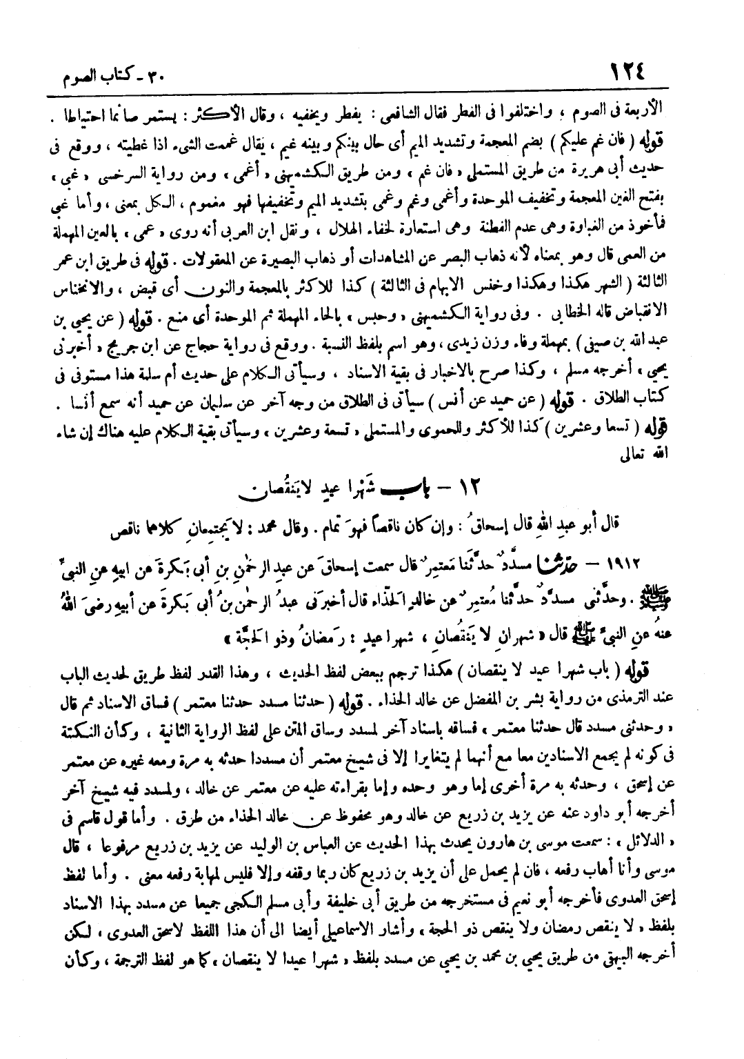 [1912] قَوْلُهُ حَدَّثَنَا مُسَدَّدٌ حَدَّثَنَا مُعْتَمِرٌ فَسَاقَ الْإِسْنَادَ ثُمَّ قَالَ وَحَدَّثَنِي مُسَدَّدٌ قَالَ حَدَّثَنَا مُعْتَمِرٌ فَسَاقَهُ بِإِسْنَادٍ آخَرَ لِمُسَدَّدٍ وَسَاقَ الْمَتْنَ عَلَى لَفْظِ الرِّوَايَةِ الثَّانِيَةِ وَكَأَنَّ النُّكْتَةَ فِي كَوْنِهِ لَمْ يَجْمَعِ الْإِسْنَادَيْنِ مَعًا مَعَ أَنَّهُمَا لَمْ يَتَغَايَرَا إِلَّا فِي شَيْخِ مُعْتَمِرٍ أَنَّ مُسَدَّدًا حَدَّثَهُ بِهِ مَرَّةً وَمَعَهُ غَيْرُهُ عَنْ مُعْتَمِرٍ عَنْ إِسْحَاقَ وَحَدَّثَهُ بِهِ مَرَّةً أُخْرَى إِمَّا وَهُوَ وَحْدُهُ وَإِمَّا بِقِرَاءَتِهِ عَلَيْهِ عَنْ مُعْتَمِرٍ عَنْ خَالِدٍ وَلِمُسَدَّدٍ فِيهِ شَيْخٌ آخَرُ أَخْرَجَهُ أَبُو دَاوُدَ عَنْهُ عَنْ يَزِيدَ بْنِ زُرَيْعٍ عَنْ خَالِدٍ وَهُوَ مَحْفُوظٌ عَنْ خَالِدٍ الْحَذَّاءِ مِنْ طُرُقٍ وَأَمَّا قَوْلُ قَاسِمٍ فِي الدَّلَائِلِ سَمِعْتُ مُوسَى بْنَ هَارُونَ يُحَدِّثُ بِهَذَا الْحَدِيثِ عَنِ الْعَبَّاسِ بْنِ الْوَلِيدِ عَنْ يَزِيدَ بْنِ زُرَيْعٍ مَرْفُوعًا قَالَ مُوسَى وَأَنَا أَهَابُ رَفْعَهُ فَإِنْ لَمْ يُحْمَلْ عَلَى أَنَّ يَزِيدَ بْنَ زُرَيْعٍ كَانَ رُبَّمَا وَقَفَهُ وَإِلَّا فَلَيْسَ لِمَهَابَةِ رَفْعِهِ مَعْنًى وَأَمَّا لَفْظُ إِسْحَاقَ الْعَدَوِيِّ فَأَخْرَجَهُ أَبُو نُعَيْمٍ فِي مُسْتَخْرَجِهِ مِنْ طَرِيقِ أَبِي خَلِيفَةَ وَأَبِي مُسْلِمٍ الْكَجِّيِّ جَمِيعًا عَنْ مُسَدَّدٍ بِهَذَا الْإِسْنَادِ بِلَفْظِ لَا يَنْقُصُ رَمَضَانُ وَلَا يَنْقُصُ ذُو الْحِجَّةِ وَأَشَارَ الْإِسْمَاعِيلِيُّ أَيْضًا إِلَى أَنَّ هَذَا اللَّفْظَ لِإِسْحَاقَ الْعَدَوِيِّ لَكِنْ أَخْرَجَهُ الْبَيْهَقِيُّ مِنْ طَرِيقِ يَحْيَى بْنِ مُحَمَّدِ بْنِ يَحْيَى عَن مُسَدّد بِلَفْظ شهرا عيدا لَا يَنْقُصَانِ كَمَا هُوَ لَفْظُ التَّرْجَمَةِ وَكَأَنَّ