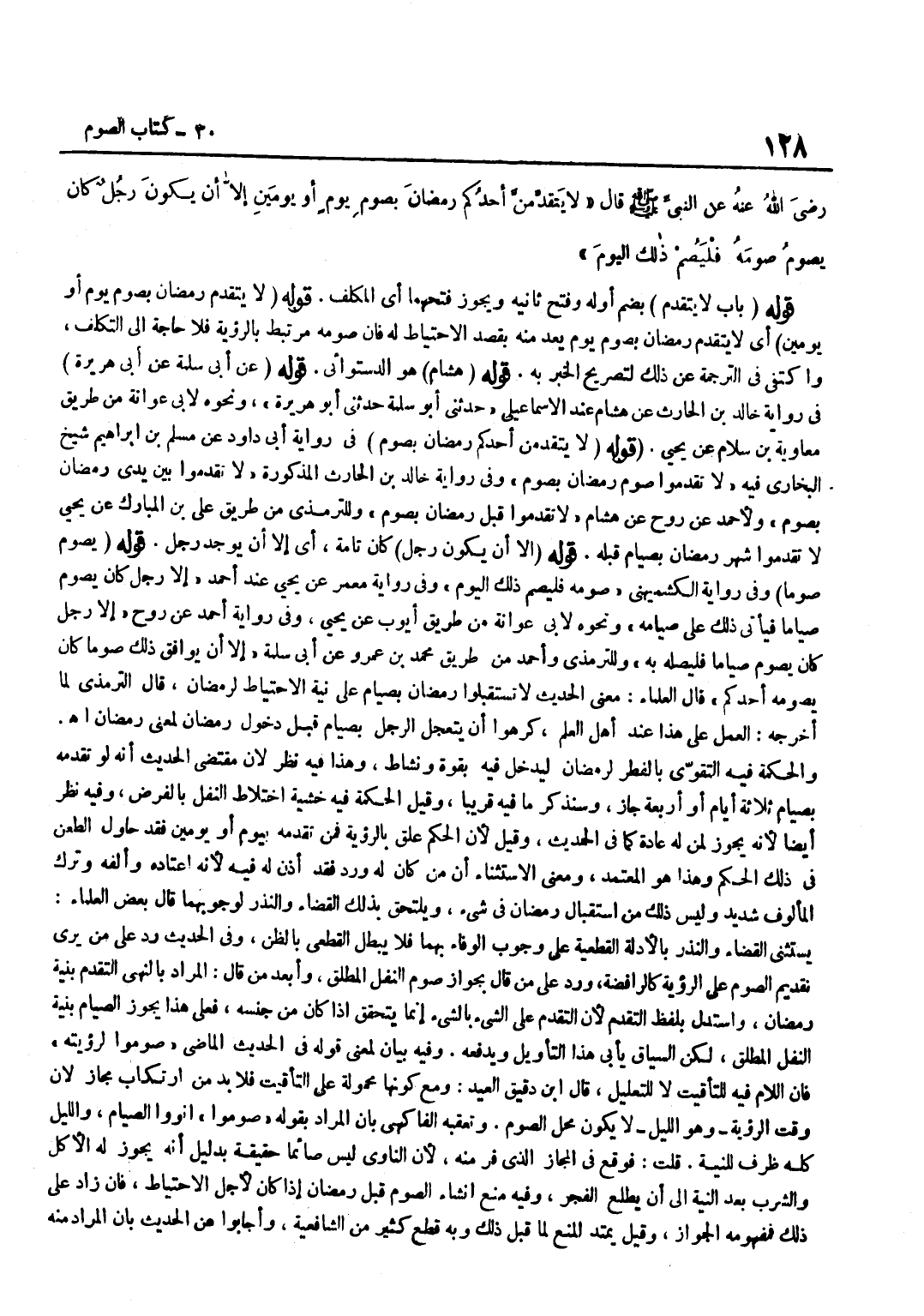 [1914] قَوْلُهُ لَا يُتَقَدَّمُ رَمَضَانُ بِصَوْمِ يَوْمٍ أَوْ يَوْمَيْنِ أَيْ لَا يُتَقَدَّمُ رَمَضَانُ بِصَوْمِ يَوْمٍ يُعَدُّ مِنْهُ بِقَصْدِ الِاحْتِيَاطِ لَهُ فَإِنَّ صَوْمَهُ مُرْتَبِطٌ بِالرُّؤْيَةِ فَلَا حَاجَةَ إِلَى التَّكَلُّفِ وَاكْتَفَى فِي التَّرْجَمَةِ عَنْ ذَلِكَ لِتَصْرِيحِ الْخَبَرِ بِهِ قَوْلُهُ هِشَامٌ هُوَ الدَّسْتُوَائِيُّ قَوْلُهُ عَنْ أَبِي سَلَمَةَ عَنْ أَبِي هُرَيْرَةَ فِي رِوَايَةِ خَالِدِ بْنِ الْحَارِثِ عَنْ هِشَامٍ عِنْدَ الْإِسْمَاعِيلِيِّ حَدَّثَنِي أَبُو سَلَمَةَ حَدَّثَنِي أَبُو هُرَيْرَةَ وَنَحْوُهُ لِأَبِي عَوَانَةَ مِنْ طَرِيقِ مُعَاوِيَةَ بْنِ سَلَّامٍ عَنْ يَحْيَى قَوْلُهُ لَا يَتَقَدَّمْنَ أَحَدُكُمْ رَمَضَانَ بِصَوْمِ فِي رِوَايَةِ أَبِي دَاوُدَ عَنْ مُسْلِمِ بْنِ إِبْرَاهِيمَ شَيْخِ الْبُخَارِيِّ فِيهِ لَا تَقَدَّمُوا صَوْمَ رَمَضَانَ بِصَوْمِ وَفِي رِوَايَةِ خَالِدِ بْنِ الْحَارِثِ الْمَذْكُورَةِ لَا تَقَدَّمُوا بَيْنَ يَدَيْ رَمَضَانَ بِصَوْمِ وَلِأَحْمَدَ عَنْ رَوْحٍ عَنْ هِشَامٍ لَا تَقَدَّمُوا قَبْلَ رَمَضَانَ بِصَوْمٍ وَلِلتِّرْمِذِيِّ مِنْ طَرِيقِ عَلِيِّ بْنِ الْمُبَارَكِ عَنْ يَحْيَى لَا تَقَدَّمُوا شَهْرَ رَمَضَانَ بِصِيَامٍ قَبْلَهُ قَوْلُهُ إِلَّا أَنْ يَكُونَ رَجُلٌ كَانَ تَامَّةٌ أَيْ إِلَّا أَنْ يُوجَدَ رَجُلٌ قَوْلُهُ يَصُومُ صَوْمًا وَفِي رِوَايَةِ الْكُشْمِيهَنِيِّ صَوْمَهُ فَلْيَصُمْ ذَلِكَ الْيَوْمَ وَفِي رِوَايَةِ مَعْمَرٍ عَنْ يَحْيَى عِنْدَ أَحْمَدَ إِلَّا رَجُلٌ كَانَ يَصُومُ صِيَامًا فياتي ذَلِك عَلَى صِيَامِهِ وَنَحْوُهُ لِأَبِي عَوَانَةَ مِنْ طَرِيقِ أَيُّوبَ عَنْ يَحْيَى وَفِي رِوَايَةِ أَحْمَدَ عَنْ رَوْحٍ إِلَّا رَجُلٌ كَانَ يَصُومُ صِيَامًا فَلْيَصِلْهُ بِهِ وَلِلتِّرْمِذِيِّ وَأَحْمَدَ مِنْ طَرِيقِ مُحَمَّدِ بْنِ عَمْرٍو عَنْ أَبِي سَلَمَةَ إِلَّا أَنْ يُوَافِقَ ذَلِكَ صَوْمًا كَانَ يَصُومُهُ أَحَدُكُمْ قَالَ الْعُلَمَاءُ مَعْنَى الْحَدِيثِ لَا تَسْتَقْبِلُوا رَمَضَانَ بِصِيَامٍ عَلَى نِيَّةِ الِاحْتِيَاطِ لِرَمَضَانَ قَالَ التِّرْمِذِيُّ لَمَّا أَخْرَجَهُ الْعَمَلُ عَلَى هَذَا عِنْدَ أَهْلِ الْعِلْمِ كَرِهُوا أَنْ يَتَعَجَّلَ الرَّجُلُ بِصِيَامٍ قَبْلَ دُخُولِ رَمَضَانَ لِمَعْنَى رَمَضَانَ اهـ وَالْحِكْمَةُ فِيهِ التَّقَوِّي بِالْفِطْرِ لِرَمَضَانَ لِيَدْخُلَ فِيهِ بِقُوَّةٍ وَنَشَاطٍ وَهَذَا فِيهِ نَظَرٌ لِأَنَّ مُقْتَضَى الْحَدِيثِ أَنَّهُ لَوْ تَقَدَّمَهُ بِصِيَامِ ثَلَاثَةِ أَيَّامٍ أَوْ أَرْبَعَةٍ جَازَ وَسَنَذْكُرُ مَا فِيهِ قَرِيبًا وَقِيلَ الْحِكْمَةُ فِيهِ خَشْيَةُ اخْتِلَاطِ النَّفْلِ بِالْفَرْضِ وَفِيهِ نَظَرٌ أَيْضًا لِأَنَّهُ يَجُوزُ لِمَنْ لَهُ عَادَةٌ كَمَا فِي الْحَدِيثِ وَقِيلَ لِأَنَّ الْحُكْمَ عُلِّقَ بِالرُّؤْيَةِ فَمَنْ تَقَدَّمَهُ بِيَوْمٍ أَوْ يَوْمَيْنِ فَقَدْ حَاوَلَ الطَّعْنَ فِي ذَلِكَ الْحُكْمِ وَهَذَا هُوَ الْمُعْتَمَدُ وَمَعْنَى الِاسْتِثْنَاءِ أَنَّ مَنْ كَانَ لَهُ وِرْدٌ فَقَدْ أُذِنَ لَهُ فِيهِ لِأَنَّهُ اعْتَادَهُ وَأَلِفَهُ وَتَرْكُ الْمَأْلُوفِ شَدِيدٌ وَلَيْسَ ذَلِكَ مِنِ اسْتِقْبَالِ رَمَضَانَ فِي شَيْءٍ وَيُلْتَحَقُ بِذَلِكَ الْقَضَاءِ وَالنُّذُرُ لِوُجُوبِهِمَا قَالَ بَعْضُ الْعُلَمَاءِ يُسْتَثْنَى الْقَضَاءُ وَالنُّذُرُ بِالْأَدِلَّةِ الْقَطْعِيَّةِ عَلَى وُجُوبِ الْوَفَاءِ بِهِمَا فَلَا يَبْطُلُ الْقَطْعِيُّ بِالظَّنِّ وَفِي الْحَدِيثِ رَدٌّ عَلَى مَنْ يَرَى تَقْدِيمَ الصَّوْمِ عَلَى الرُّؤْيَةِ كَالرَّافِضَةِ وَرَدٌّ عَلَى مَنْ قَالَ بِجَوَازِ صَوْمِ النَّفْلِ الْمُطْلَقِ وَأَبْعَدَ مَنْ قَالَ الْمُرَادُ بِالنَّهْيِ