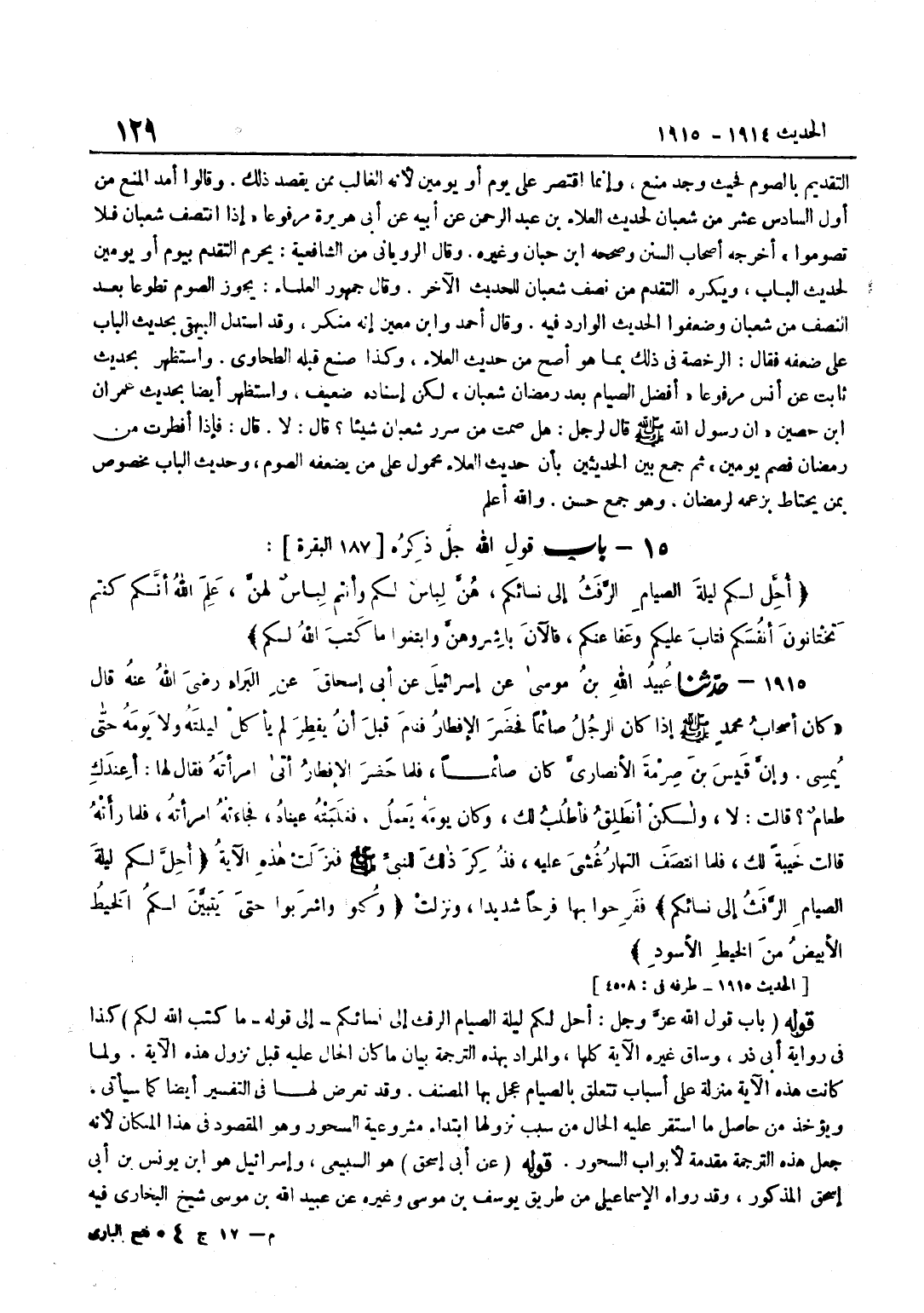 إِلَى قَوْله مَا كتب الله لكم كَذَا فِي رِوَايَةِ أَبِي ذَرٍّ وَسَاقَ غَيْرُهُ الْآيَةَ كُلَّهَا وَالْمُرَادُ بِهَذِهِ التَّرْجَمَةِ بَيَانُ مَا كَانَ الْحَالُ عَلَيْهِ قَبْلَ نُزُولِ هَذِهِ الْآيَةِ وَلَمَّا كَانَتْ هَذِهِ الْآيَةُ مُنَزَّلَةً عَلَى أَسْبَابٍ تَتَعَلَّقُ بِالصِّيَامِ عَجَّلَ بِهَا الْمُصَنِّفُ وَقَدْ تَعَرَّضَ لَهَا فِي التَّفْسِيرِ أَيْضًا كَمَا سَيَأْتِي وَيُؤْخَذُ مِنْ حَاصِلِ مَا اسْتَقَرَّ عَلَيْهِ الْحَالُ مِنْ سَبَبِ نُزُولِهَا ابْتِدَاءُ مَشْرُوعِيَّةِ السُّحُورِ وَهُوَ الْمَقْصُودُ فِي هَذَا الْمَكَانِ لِأَنَّهُ جَعَلَ هَذِهِ التَّرْجَمَةَ مُقَدِّمَةً لِأَبْوَابِ السُّحُورِ