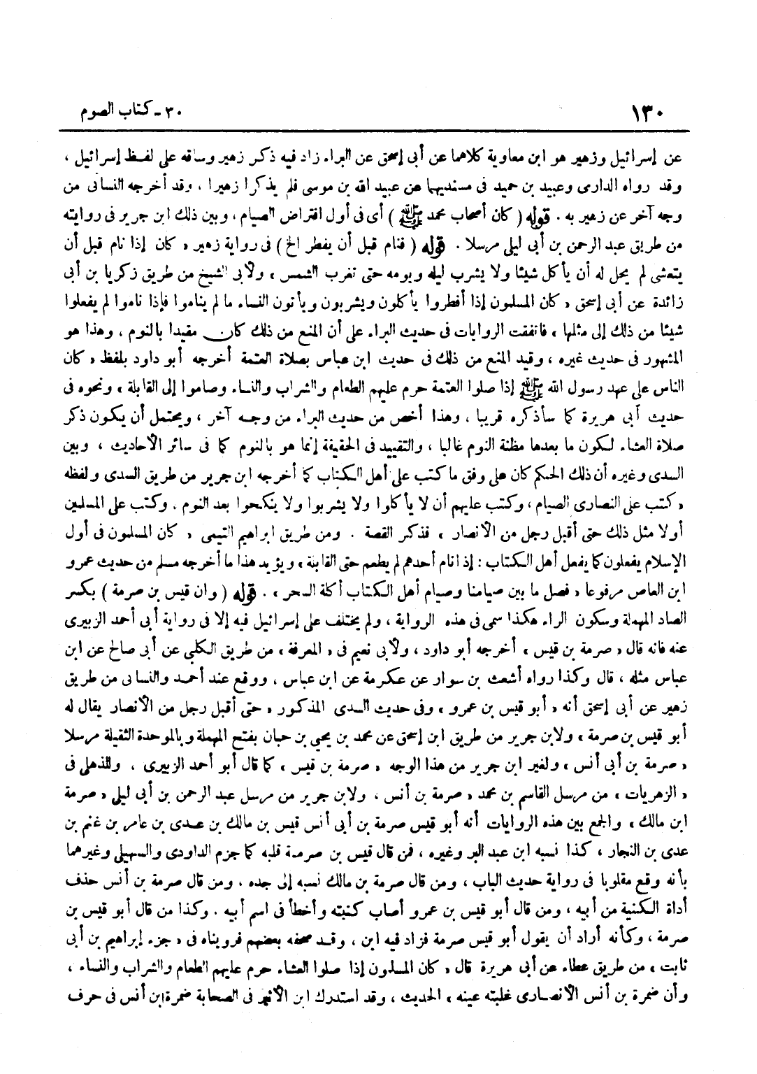 عَن إِسْرَائِيل وَزُهَيْر هُوَ بن مُعَاوِيَةَ كِلَاهُمَا عَنْ أَبِي إِسْحَاقَ عَنِ الْبَرَاءِ زَادَ فِيهِ ذِكْرَ زُهَيْرٍ وَسَاقَهُ عَلَى لَفْظِ إِسْرَائِيل وَقد رَوَاهُ الدَّارمِيّ وَعبيد بْنُ حُمَيْدٍ فِي مُسْنَدَيْهِمَا عَنْ عُبَيْدِ اللَّهِ بْنِ مُوسَى فَلَمْ يَذْكُرَا زُهَيْرًا وَقَدْ أَخْرَجَهُ النَّسَائِيُّ مِنْ وَجْهٍ آخَرَ عَنْ زُهَيْرٍ بِهِ قَوْلُهُ كَانَ أَصْحَابُ مُحَمَّدٍ صَلَّى اللَّهُ عَلَيْهِ وَسَلَّمَ أَيْ فِي أَوَّلِ افْتِرَاضِ الصِّيَامِ وَبَيَّنَ ذَلِك بن جَرِيرٍ فِي رِوَايَتِهِ مِنْ طَرِيقِ عَبْدِ الرَّحْمَنِ بْنِ أَبِي لَيْلَى مُرْسَلًا قَوْلُهُ فَنَامَ قَبْلَ أَنْ يُفْطِرَ إِلَخْ فِي رِوَايَةِ زُهَيْرٍ كَانَ إِذَا نَامَ قَبْلَ أَنْ يَتَعَشَّى لَمْ يَحِلَّ لَهُ أَنْ يَأْكُلَ شَيْئًا وَلَا يَشْرَبَ لَيْلَهُ وَيَوْمَهُ حَتَّى تَغْرُبَ الشَّمْسُ وَلِأَبِي الشَّيْخِ مِنْ طَرِيقِ زَكَرِيَّا بْنِ أَبِي زَائِدَةَ عَنْ أَبِي إِسْحَاقَ كَانَ الْمُسْلِمُونَ إِذَا أَفْطَرُوا يَأْكُلُونَ وَيَشْرَبُونَ وَيَأْتُونَ النِّسَاءَ مَا لَمْ يَنَامُوا فَإِذَا نَامُوا لم يَفْعَلُوا شَيْئا من ذَلِك إِلَى مثلهَا فَاتَّفَقَتِ الرِّوَايَاتُ فِي حَدِيثِ الْبَرَاءِ عَلَى أَنَّ الْمَنْعَ مِنْ ذَلِكَ كَانَ مُقَيَّدًا بِالنَّوْمِ وَهَذَا هُوَ الْمَشْهُورُ فِي حَدِيثِ غَيْرِهِ وَقُيِّدَ الْمَنْعُ من ذَلِك فِي حَدِيث بن عَبَّاسٍ بِصَلَاةِ الْعَتَمَةِ أَخْرَجَهُ أَبُو دَاوُدَ بِلَفْظِ كَانَ النَّاسُ عَلَى عَهْدِ رَسُولِ اللَّهِ صَلَّى اللَّهُ عَلَيْهِ وَسَلَّمَ إِذَا صَلَّوُا الْعَتَمَةَ حَرُمَ عَلَيْهِمُ الطَّعَامُ وَالشَّرَابُ وَالنِّسَاءُ وَصَامُوا إِلَى الْقَابِلَةِ وَنَحْوُهُ فِي حَدِيثِ أَبِي هُرَيْرَةَ كَمَا سَأَذْكُرُهُ قَرِيبًا وَهَذَا أَخَصُّ مِنْ حَدِيثِ الْبَرَاءِ مِنْ وَجْهٍ آخَرَ وَيُحْتَمَلُ أَنْ يَكُونَ ذَكَرَ صَلَاةَ الْعِشَاءِ لِكَوْنِ مَا بَعْدَهَا مَظِنَّةَ النَّوْمِ غَالِبًا وَالتَّقْيِيدُ فِي الْحَقِيقَةِ إِنَّمَا هُوَ بِالنَّوْمِ كَمَا فِي سَائِرِ الْأَحَادِيثِ وَبَيَّنَ السُّدِّيُّ وَغَيْرُهُ أَنَّ ذَلِكَ الْحُكْمَ كَانَ عَلَى وَفْقِ مَا كُتِبَ على أهل الْكتاب كَمَا أخرجه بن جَرِيرٍ مِنْ طَرِيقِ السُّدِّيِّ وَلَفْظُهُ كُتِبَ عَلَى النَّصَارَى الصِّيَامُ وَكُتِبَ عَلَيْهِمْ أَنْ لَا يَأْكُلُوا وَلَا يَشْرَبُوا وَلَا يَنْكِحُوا بَعْدَ النَّوْمِ وَكُتِبَ عَلَى الْمُسْلِمِينَ أَوَّلًا مِثْلُ ذَلِكَ حَتَّى أَقْبَلَ رَجُلٌ مِنَ الْأَنْصَارِ فَذَكَرَ الْقِصَّةَ وَمِنْ طَرِيقِ إِبْرَاهِيمَ التَّيْمِيِّ كَانَ الْمُسْلِمُونَ فِي أَوَّلِ الْإِسْلَامِ يَفْعَلُونَ كَمَا يَفْعَلُ أَهْلُ الْكِتَابِ إِذَا نَامَ أَحَدُهُمْ لَمْ يَطْعَمْ حَتَّى الْقَابِلَةَ وَيُؤَيِّدُ هَذَا مَا أَخْرَجَهُ مُسْلِمٌ مِنْ حَدِيثِ عَمْرِو بْنِ الْعَاصِ مَرْفُوعًا فَصْلُ مَا بَيْنَ صِيَامِنَا وَصِيَامِ أَهْلِ الْكِتَابِ أَكْلَةُ السَّحَرِ قَوْلُهُ وَإِنَّ قَيْسَ بْنَ صِرْمَةَ بِكَسْرِ الصَّادِ الْمُهْمَلَةِ وَسُكُونِ الرَّاءِ هَكَذَا سُمِّيَ فِي هَذِهِ الرِّوَايَةِ وَلَمْ يُخْتَلَفْ عَلَى إِسْرَائِيلَ فِيهِ إِلَّا فِي رِوَايَةِ أَبِي أَحْمَدَ الزُّبَيْرِيِّ عَنْهُ فَإِنَّهُ قَالَ صِرْمَةُ بْنُ قَيْسٍ أَخْرَجَهُ أَبُو دَاوُدَ وَلِأَبِي نُعَيْمٍ فِي الْمَعْرِفَةِ مِنْ طَرِيقِ الْكَلْبِيِّ عَنْ أَبِي صَالِحٍ عَنِ بن عَبَّاسٍ مِثْلُهُ قَالَ وَكَذَا رَوَاهُ أَشْعَثُ بْنُ سوار عَن عِكْرِمَة عَن بن عَبَّاسٍ وَوَقَعَ عِنْدَ أَحْمَدَ وَالنَّسَائِيِّ مِنْ طَرِيقِ زُهَيْرٍ عَنْ أَبِي إِسْحَاقَ أَنَّهُ أَبُو قَيْسِ بْنُ عَمْرٍو وَفِي حَدِيثِ السُّدِّيِّ الْمَذْكُورِ حَتَّى أَقْ