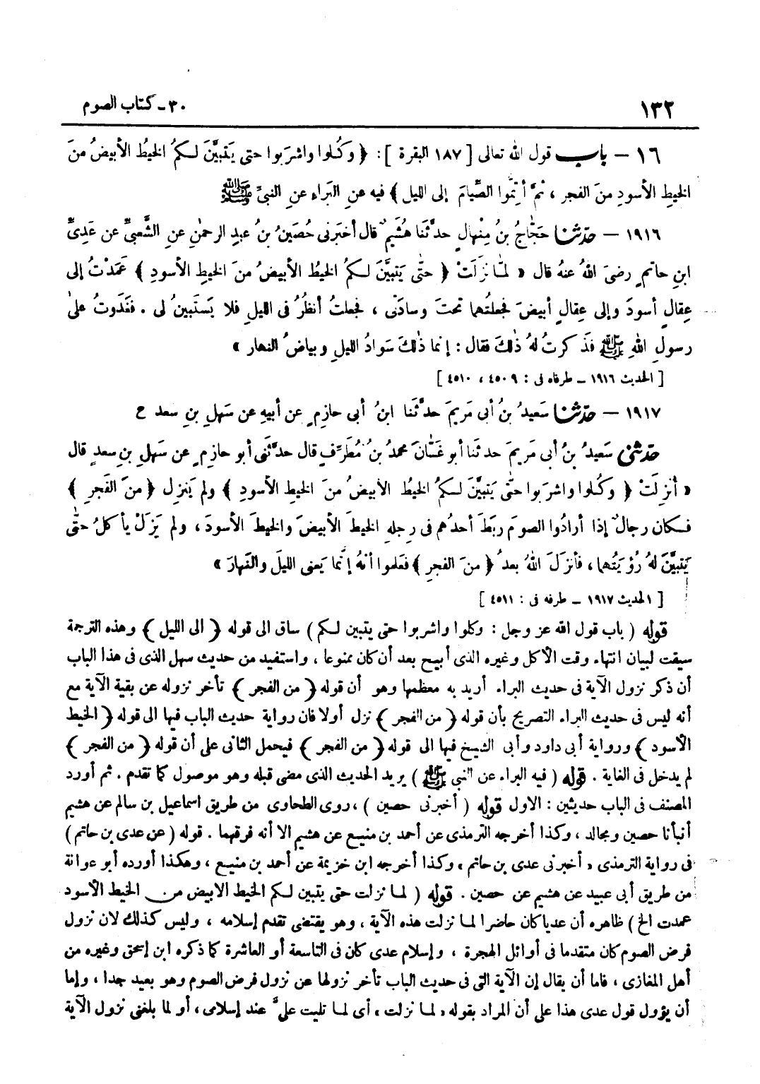 [1916] قَوْلُهُ أَخْبَرَنِي حُصَيْنٌ رَوَى الطَّحَاوِيُّ مِنْ طَرِيقِ إِسْمَاعِيلَ بْنِ سَالِمٍ عَنْ هُشَيْمٍ أَنْبَأَنَا حُصَيْنٌ وَمُجَالِدٌ وَكَذَا أَخْرَجَهُ التِّرْمِذِيُّ عَنْ أَحْمَدَ بْنِ مَنِيعٍ عَنْ هُشَيْمٍ إِلَّا أَنَّهُ فَرَّقَهُمَا قَوْلُهُ عَنْ عَدِيِّ بْنِ حَاتِمٍ فِي رِوَايَةِ التِّرْمِذِيِّ أَخْبرنِي عدي بن حَاتِم وَكَذَا أخرجه بن خُزَيْمَةَ عَنْ أَحْمَدَ بْنِ مَنِيعٍ وَهَكَذَا أَوْرَدَهُ أَبُو عَوَانَةَ مِنْ طَرِيقِ أَبِي عُبَيْدٍ عَنْ هُشَيْمٍ عَنْ حُصَيْنٍ قَوْلُهُ لَمَّا نَزَلَتْ حَتَّى يتَبَيَّن لكم الْخَيط الْأَبْيَض من الْخَيط الْأسود عَمَدْتُ إِلَخْ ظَاهِرُهُ أَنَّ عَدِيًّا كَانَ حَاضِرًا لَمَّا نَزَلَتْ هَذِهِ الْآيَةُ وَهُوَ يَقْتَضِي تَقَدُّمَ إِسْلَامِهِ وَلَيْسَ كَذَلِكَ لِأَنَّ نُزُولَ فَرْضِ الصَّوْمِ كَانَ مُتَقَدِّمًا فِي أَوَائِلِ الْهِجْرَةِ وَإِسْلَامَ عَدِيٍّ كَانَ فِي التَّاسِعَةِ أَوِ الْعَاشِرَةِ كَمَا ذَكَرَهُ بن إِسْحَاقَ وَغَيْرُهُ مِنْ أَهْلِ الْمَغَازِي فَإِمَّا أَنْ يُقَالَ إِنَّ الْآيَةَ الَّتِي فِي حَدِيثِ الْبَابِ تَأَخَّرَ نُزُولُهَا عَنْ نُزُولِ فَرْضِ الصَّوْمِ وَهُوَ بعيد جدا وَأما أَن يؤول قَوْلُ عَدِيٍّ هَذَا عَلَى أَنَّ الْمُرَادَ بِقَوْلِهِ لَمَّا نَزَلَتْ أَيْ لَمَّا تُلِيَتْ عَلَيَّ عِنْدَ إِسْلَامِي أَوْ لَمَّا بَلَغَنِي نُزُولُ الْآيَةِ