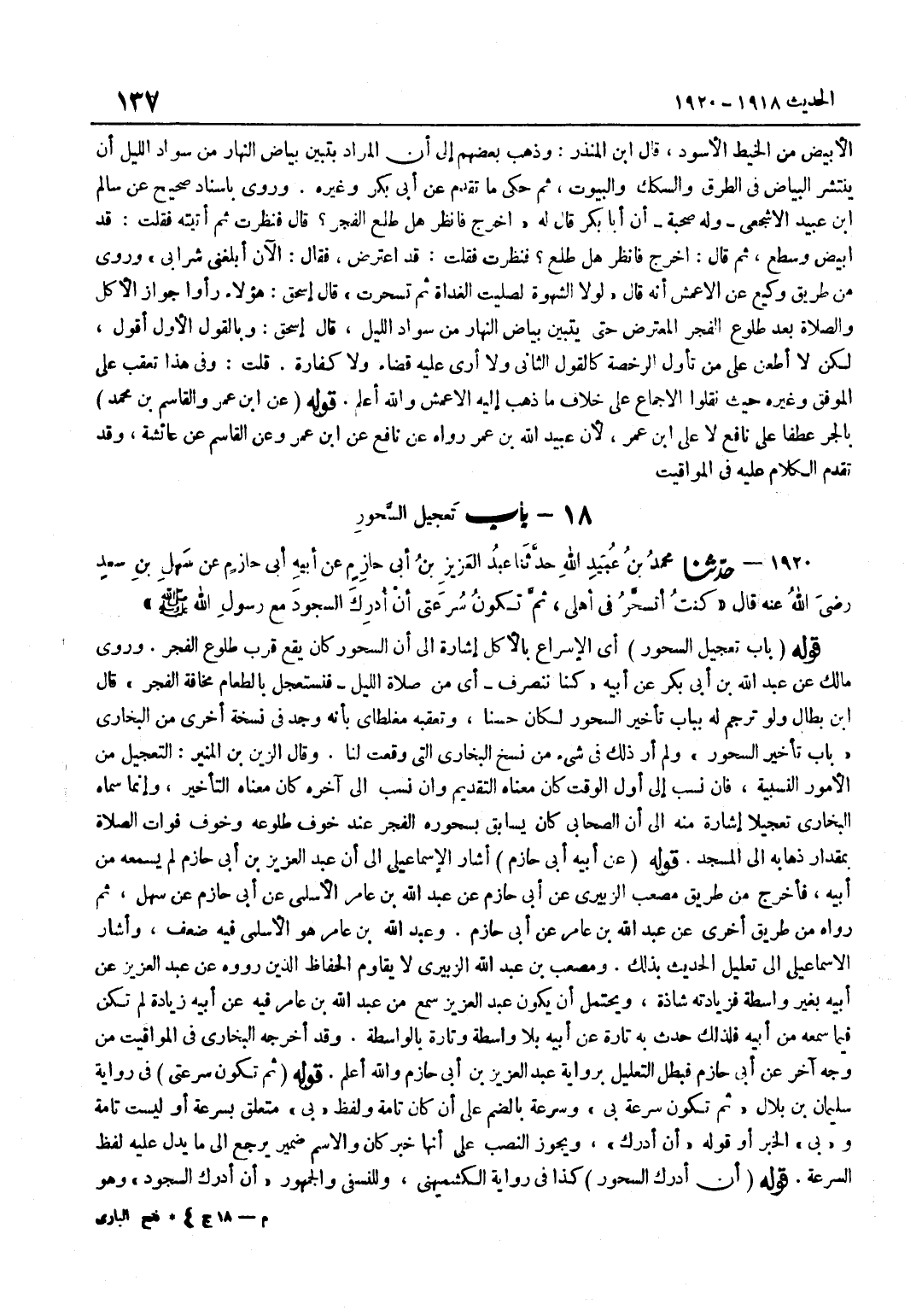 [1920] قَوْلُهُ عَنْ أَبِيهِ أَبِي حَازِمٍ أَشَارَ الْإِسْمَاعِيلِيُّ إِلَى أَنَّ عَبْدَ الْعَزِيزِ بْنَ أَبِي حَازِمٍ لَمْ يَسْمَعْهُ مِنْ أَبِيهِ فَأَخْرَجَ مِنْ طَرِيقِ مُصْعَبٍ الزُّبَيْرِيِّ عَنْ أَبِي حَازِمٍ عَنْ عَبْدِ اللَّهِ بْنِ عَامِرِ الْأَسْلَمِيِّ عَنْ أَبِي حَازِمٍ عَنْ سَهْلٍ ثُمَّ رَوَاهُ مِنْ طَرِيقٍ أُخْرَى عَنْ عَبْدِ اللَّهِ بْنِ عَامِرٍ عَنْ أَبِي حَازِمٍ وَعَبْدُ اللَّهِ بْنُ عَامِرٍ هُوَ الْأَسْلَمِيُّ فِيهِ ضَعْفٌ وَأَشَارَ الْإِسْمَاعِيلِيُّ إِلَى تَعْلِيلِ الْحَدِيثِ بِذَلِكَ وَمُصْعَبُ بْنُ عَبْدِ اللَّهِ الزُّبَيْرِيُّ لَا يُقَاوِمُ الْحُفَّاظَ الَّذِينَ رَوَوْهُ عَنْ عَبْدِ الْعَزِيزِ عَنْ أَبِيهِ بِغَيْرِ وَاسِطَةٍ فَزِيَادَتُهُ شَاذَّةٌ وَيُحْتَمَلُ أَنْ يَكُونَ عَبْدُ الْعَزِيزِ سَمِعَ مِنْ عَبْدِ اللَّهِ بْنِ عَامِرٍ فِيهِ عَنْ أَبِيهِ زِيَادَةً لَمْ تَكُنْ فِيمَا سَمِعَهُ مِنْ أَبِيهِ فَلِذَلِكَ حَدَّثَ بِهِ تَارَةً عَنْ أَبِيهِ بِلَا وَاسِطَةٍ وَتَارَةً بِالْوَاسِطَةِ وَقَدْ أَخْرَجَهُ الْبُخَارِيُّ فِي الْمَوَاقِيتِ مِنْ وَجْهٍ آخَرَ عَنْ أَبِي حَازِمٍ فَبَطَلَ التَّعْلِيلُ بِرِوَايَةِ عَبْدِ الْعَزِيزِ بْنِ أَبِي حَازِمٍ وَاللَّهُ أَعْلَمُ قَوْلُهُ ثُمَّ تَكُونُ سُرْعَتِي فِي رِوَايَةِ سُلَيْمَانَ بْنِ بِلَالٍ ثُمَّ تَكُونُ سُرْعَةٌ بِي وَسُرْعَةٌ بِالضَّمِّ عَلَى أَنَّ كَانَ تَامَّةٌ وَلَفْظُ بِي مُتَعَلِّقٌ بِسُرْعَةٍ أَوْ لَيْسَتْ تَامَّة وَبِي الْخَبَرُ أَوْ قَوْلُهُ أَنْ أُدْرِكَ وَيَجُوزُ النَّصْبُ عَلَى أَنَّهَا خَبَرُ كَانَ وَالِاسْمُ ضَمِيرٌ يَرْجِعُ إِلَى مَا يَدُلُّ عَلَيْهِ لَفْظُ السُّرْعَةِ قَوْلُهُ أَنْ أُدْرِكَ السُّحُورَ كَذَا فِي رِوَايَةِ الْكُشْمِيهَنِيِّ وَلِلنَّسَفِيِّ وَالْجُمْهُورِ أَنْ أُدْرِكَ السُّجُودَ وَهُوَ