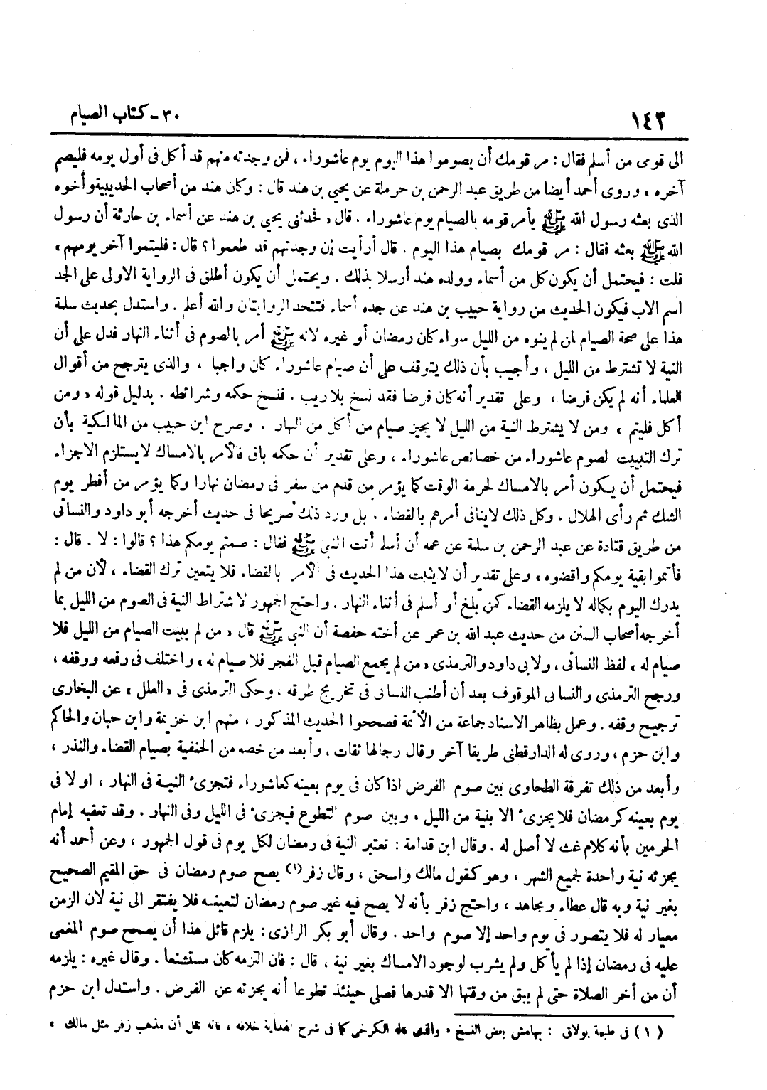 إِلَى قَوْمِي مِنْ أَسْلَمَ فَقَالَ مُرْ قَوْمَكَ أَنْ يَصُومُوا هَذَا الْيَوْمَ يَوْمَ عَاشُورَاءَ فَمَنْ وَجَدْتَهُ مِنْهُمْ قَدْ أَكَلَ فِي أَوَّلِ يَوْمِهِ فَلْيَصُمْ آخِرَهُ وَرَوَى أَحْمَدُ أَيْضًا مِنْ طَرِيقِ عَبْدِ الرَّحْمَنِ بْنِ حَرْمَلَةَ عَنْ يَحْيَى بْنِ هِنْدٍ قَالَ وَكَانَ هِنْدٌ مِنْ أَصْحَابِ الْحُدَيْبِيَةِ وَأَخُوهُ الَّذِي بَعَثَهُ رَسُولَ اللَّهِ صَلَّى اللَّهُ عَلَيْهِ وَسَلَّمَ يَأْمُرُ قَوْمَهُ بِالصِّيَامِ يَوْمَ عَاشُورَاءَ قَالَ فَحَدَّثَنِي يَحْيَى بْنُ هِنْدٍ عَنْ أَسْمَاءَ بْنِ حَارِثَةَ أَنَّ رَسُولَ اللَّهِ صَلَّى اللَّهُ عَلَيْهِ وَسَلَّمَ بَعَثَهُ فَقَالَ مُرْ قَوْمَكَ بِصِيَامِ هَذَا الْيَوْمِ قَالَ أَرَأَيْتَ إِنْ وَجَدْتَهُمْ قَدْ طَعِمُوا قَالَ فَلْيُتِمُّوا آخِرَ يَوْمِهِمْ قُلْتُ فَيُحْتَمَلُ أَنْ يَكُونَ كُلٌّ مِنْ أَسْمَاءَ وَوَلَدِهِ هِنْدٍ أُرْسِلَا بِذَلِكَ وَيُحْتَمَلُ أَنْ يَكُونَ أَطْلَقَ فِي الرِّوَايَةِ الْأُولَى عَلَى الْجَدِّ اسْمَ الْأَبِ فَيَكُونُ الْحَدِيثُ مِنْ رِوَايَةِ حَبِيبِ بْنِ هِنْدٍ عَنْ جَدِّهِ أَسْمَاءَ فَتَتَّحِدُ الرِّوَايَتَانِ وَاللَّهُ أَعْلَمُ وَاسْتُدِلَّ بِحَدِيثِ سَلَمَةَ هَذَا عَلَى صِحَّةِ الصِّيَامِ لِمَنْ لَمْ يَنْوِهِ مِنَ اللَّيْلِ سَوَاءٌ كَانَ رَمَضَانَ أَوْ غَيْرَهُ لِأَنَّهُ صَلَّى اللَّهُ عَلَيْهِ وَسَلَّمَ أَمَرَ بِالصَّوْمِ فِي أَثْنَاءِ النَّهَارِ فَدَلَّ عَلَى أَنَّ النِّيَّةَ لَا تُشْتَرَطُ مِنَ اللَّيْلِ وَأُجِيبُ بِأَنَّ ذَلِكَ يَتَوَقَّفُ عَلَى أَنَّ صِيَامَ عَاشُورَاءَ كَانَ وَاجِبًا وَالَّذِي يَتَرَجَّحُ مِنْ أَقْوَالِ الْعُلَمَاءِ أَنَّهُ لَمْ يَكُنْ فَرْضًا وَعَلَى تَقْدِيرِ أَنَّهُ كَانَ فَرْضًا فَقَدْ نُسِخَ بِلَا رَيْبٍ فَنُسِخَ حُكْمُهُ وَشَرَائِطُهُ بِدَلِيلِ قَوْلِهِ وَمَنْ أَكَلَ فَلْيُتِمَّ وَمَنْ لَا يَشْتَرِطُ النِّيَّةَ مِنَ اللَّيْلِ لَا يُجِيزُ صِيَامَ مَنْ أَكَلَ مِنَ النَّهَارِ وَصَرَّحَ بن حَبِيبٍ مِنَ الْمَالِكِيَّةِ بِأَنَّ تَرْكَ التَّبْيِيتِ لِصَوْمِ عَاشُورَاءَ مِنْ خَصَائِصِ عَاشُورَاءَ وَعَلَى تَقْدِيرِ أَنَّ حُكْمَهُ بَاقٍ فَالْأَمْرُ بِالْإِمْسَاكِ لَا يَسْتَلْزِمُ الْإِجْزَاءَ فَيُحْتَمَلُ أَنْ يَكُونَ أَمَرَ بِالْإِمْسَاكِ لِحُرْمَةِ الْوَقْتِ كَمَا يُؤْمَرُ مَنْ قَدِمَ مِنْ سَفَرٍ فِي رَمَضَانَ نَهَارًا وَكَمَا يُؤْمَرُ مَنْ أَفْطَرَ يَوْمَ الشَّكِّ ثُمَّ رَأَى الْهِلَالَ وَكُلُّ ذَلِكَ لَا يُنَافِي أَمْرَهُمْ بِالْقَضَاءِ بَلْ وَرَدَ ذَلِكَ صَرِيحًا فِي حَدِيثٍ أَخْرَجَهُ أَبُو دَاوُدَ وَالنَّسَائِيُّ مِنْ طَرِيقِ قَتَادَةَ عَنْ عَبْدِ الرَّحْمَنِ بْنِ سَلَمَةَ عَنْ عَمِّهِ أَنَّ أَسْلَمَ أَتَتِ النَّبِيَّ صَلَّى اللَّهُ عَلَيْهِ وَسَلَّمَ فَقَالَ صُمْتُمْ يَوْمَكُمْ هَذَا قَالُوا لَا قَالَ فَأَتِمُّوا بَقِيَّةَ يَوْمِكُمْ وَاقْضُوهُ وَعَلَى تَقْدِيرِ أَنْ لَا يَثْبُتَ هَذَا الْحَدِيثُ فِي الْأَمْرِ بِالْقَضَاءِ فَلَا يَتَعَيَّنُ تَرْكُ الْقَضَاءِ لِأَنَّ مَنْ لَمْ يُدْرِكِ الْيَوْمَ بِكَمَالِهِ لَا يَلْزَمُهُ الْقَضَاءُ كَمَنْ بَلَغَ أَوْ أَسْلَمَ فِي أَثْنَاءِ النَّهَارِ وَاحْتَجَّ الْجُمْهُورُ لِاشْتِرَاطِ النِّيَّةِ فِي الصَّوْمِ مِنَ اللَّيْلِ بِمَا أَخْرَجَهُ أَصْحَابُ السُّنَنِ مِنْ حَدِيثِ عَبْدِ اللَّهِ بْنِ عُمَرَ عَنْ أُخْتِهِ حَفْصَةَ أَنَّ النَّبِيَّ صَلَّى اللَّهُ عَلَيْهِ وَسَلَّمَ قَالَ مَنْ لَمْ يُبَيِّتِ الصِّيَامَ مِنَ اللَّيْلِ فَلَا صِيَامَ لَهُ لَفْظُ النَّسَائِيِّ وَلِأَبِي دَاوُدَ وَالتِّرْمِذِيِّ مَنْ لَمْ يُجْمِعِ الصِّيَامَ قَبْلَ الْفَجْرِ فَلَا صِيَامَ لَهُ وَاخْتُلِفَ فِي رَفْعِ