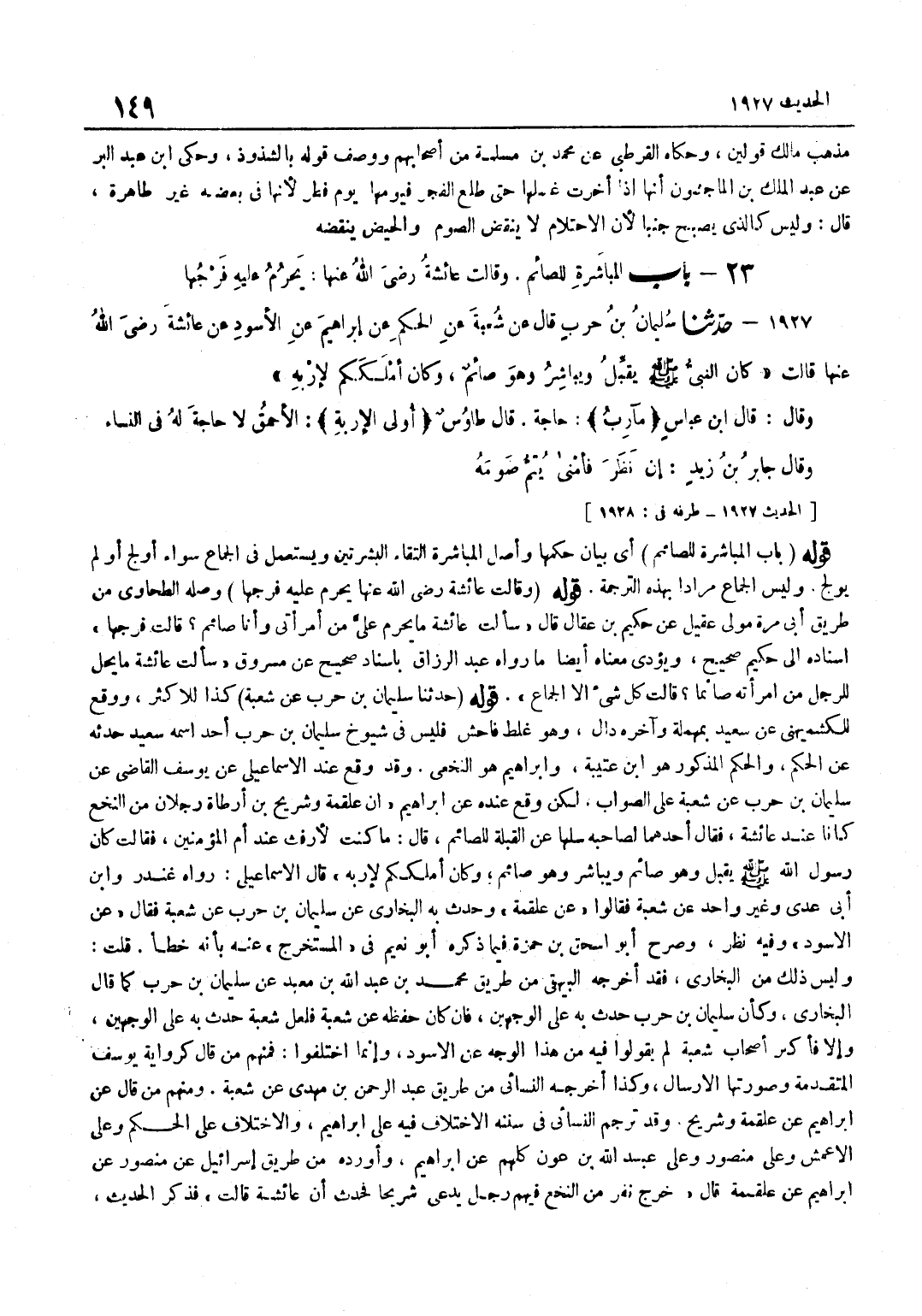 [1927] قَوْلُهُ حَدَّثَنَا سُلَيْمَانُ بْنُ حَرْبٍ عَنْ شُعْبَةَ كَذَا لِلْأَكْثَرِ وَوَقَعَ لِلْكُشْمِيهَنِيِّ عَنْ سَعِيدٍ بِمُهْمَلَةٍ وَآخِرُهُ دَالٌ وَهُوَ غَلَطٌ فَاحِشٌ فَلَيْسَ فِي شُيُوخِ سُلَيْمَانَ بْنِ حَرْبٍ أَحَدٌ اسْمُهُ سعيد حَدثهُ عَن الحكم وَالْحكم الْمَذْكُور هُوَ بن عُتَيْبَةَ وَإِبْرَاهِيمُ هُوَ النَّخَعِيُّ وَقَدْ وَقَعَ عِنْدَ الْإِسْمَاعِيلِيِّ عَنْ يُوسُفَ الْقَاضِي عَنْ سُلَيْمَانَ بْنِ حَرْبٍ عَنْ شُعْبَةَ عَلَى الصَّوَابِ لَكِنْ وَقَعَ عِنْدَهُ عَنْ إِبْرَاهِيمَ أَنَّ عَلْقَمَةَ وَشُرَيْحَ بْنَ أَرْطَاةَ رَجُلَانِ مِنَ النَّخَعِ كَانَا عِنْدَ عَائِشَةَ فَقَالَ أَحَدُهُمَا لِصَاحِبِهِ سَلْهَا عَنِ الْقُبْلَةِ لِلصَّائِمِ قَالَ مَا كُنْتُ لِأَرْفُثَ عِنْدَ أُمِّ الْمُؤْمِنِينَ فَقَالَتْ كَانَ رَسُولُ اللَّهِ صَلَّى اللَّهُ عَلَيْهِ وَسَلَّمَ يُقَبِّلُ وَهُوَ صَائِمٌ وَيُبَاشِرُ وَهُوَ صَائِمٌ وَكَانَ أَمْلَكَكُمْ لِإِرْبِهِ قَالَ الْإِسْمَاعِيلِيُّ رَوَاهُ غُنْدَرٌ وبن أَبِي عَدِيٍّ وَغَيْرُ وَاحِدٍ عَنْ شُعْبَةَ فَقَالُوا عَنْ عَلْقَمَةَ وَحَدَّثَ بِهِ الْبُخَارِيُّ عَنْ سُلَيْمَانَ بْنِ حَرْبٍ عَنْ شُعْبَةَ فَقَالَ عَنِ الْأَسْوَدِ وَفِيهِ نَظَرٌ وَصَرَّحَ أَبُو إِسْحَاقَ بْنُ حَمْزَةَ فِيمَا ذَكَرَهُ أَبُو نُعَيْمٍ فِي الْمُسْتَخْرَجِ عَنْهُ بِأَنَّهُ خَطَأٌ قُلْتُ وَلَيْسَ ذَلِكَ مِنَ الْبُخَارِيِّ فَقَدْ أَخْرَجَهُ الْبَيْهَقِيُّ مِنْ طَرِيقِ مُحَمَّدِ بْنِ عَبْدِ اللَّهِ بْنِ مَعْبَدٍ عَنْ سُلَيْمَانَ بْنِ حَرْبٍ كَمَا قَالَ الْبُخَارِيُّ وَكَأَنَّ سُلَيْمَانَ بْنَ حَرْبٍ حَدَّثَ بِهِ عَلَى الْوَجْهَيْنِ فَإِنْ كَانَ حَفِظَهُ عَنْ شُعْبَةَ فَلَعَلَّ شُعْبَةَ حَدَّثَ بِهِ عَلَى الْوَجْهَيْنِ وَإِلَّا فَأَكْثَرُ أَصْحَابِ شُعْبَةَ لَمْ يَقُولُوا فِيهِ مِنْ هَذَا الْوَجْهِ عَنِ الْأَسْوَدِ وَإِنَّمَا اخْتَلَفُوا فَمِنْهُمْ مَنْ قَالَ كَرِوَايَةِ يُوسُفَ الْمُتَقَدّمَة وَصورتهَا الْإِرْسَال وَكَذَا أخرجه النَّسَائِيُّ مِنْ طَرِيقِ عَبْدِ الرَّحْمَنِ بْنِ مَهْدِيٍّ عَنِ شُعْبَةَ وَمِنْهُمْ مَنْ قَالَ عَنْ إِبْرَاهِيمَ عَنْ عَلْقَمَةَ وَشُرَيْحٍ وَقَدْ تَرْجَمَ النَّسَائِيُّ فِي سُنَنِهِ الِاخْتِلَافَ فِيهِ عَلَى إِبْرَاهِيمَ وَالِاخْتِلَافَ عَلَى الْحَكَمِ وَعَلَى الْأَعْمَشِ وَعَلَى مَنْصُورٍ وَعَلَى عَبْدِ اللَّهِ بْنِ عَوْنٍ كُلُّهُمْ عَنْ إِبْرَاهِيمَ وَأَوْرَدَهُ مِنْ طَرِيقِ إِسْرَائِيلَ عَنْ مَنْصُورٍ عَنْ إِبْرَاهِيمَ عَنْ عَلْقَمَةَ قَالَ خَرَجَ نَفَرٌ مِنَ النَّخَعِ فِيهِمْ رَجُلٌ يُدْعَى شُرَيْحًا فَحَدَّثَ أَنَّ عَائِشَةَ قَالَتْ فَذَكَرَ الْحَدِيثَ