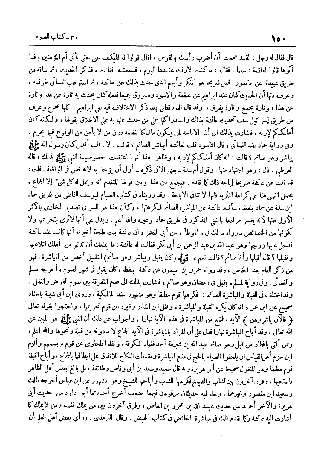قَالَ فَقَالَ لَهُ رَجُلٌ لَقَدْ هَمَمْتُ أَنْ أَضْرِبَ رَأْسَكَ بِالْقَوْسِ فَقَالَ قُولُوا لَهُ فَلْيَكُفَّ عَنِّي حَتَّى نَأْتِيَ أُمَّ الْمُؤْمِنِينَ فَلَمَّا أَتَوْهَا قَالُوا لِعَلْقَمَةَ سَلْهَا فَقَالَ مَا كُنْتُ لِأَرْفُثَ عِنْدَهَا الْيَوْمَ فَسَمِعَتْهُ فَقَالَتْ فَذَكَرَ الْحَدِيثَ ثُمَّ سَاقَهُ مِنْ طَرِيقِ عُبَيْدَةَ عَنْ مَنْصُورٍ فَجَعَلَ شُرَيْحًا هُوَ الْمُنَكَّرَ وَأَبْهَمَ الَّذِي حَدَّثَ بِذَلِكَ عَنْ عَائِشَةَ ثُمَّ اسْتَوْعَبَ النَّسَائِيُّ طُرُقَهُ وَعُرِفَ مِنْهَا أَنَّ الْحَدِيثَ كَانَ عِنْدَ إِبْرَاهِيمَ عَنْ عَلْقَمَةَ وَالْأَسْوَدِ وَمَسْرُوقٍ جَمِيعًا فَلَعَلَّهُ كَانَ يُحَدِّثُ بِهِ تَارَةً عَنْ هَذَا وَتَارَةً عَنْ هَذَا وَتَارَةً يَجْمَعُ وَتَارَةً يُفَرِّقُ وَقَدْ قَالَ الدَّارَقُطْنِيُّ بَعْدَ ذِكْرِ الِاخْتِلَافِ فِيهِ عَلَى إِبْرَاهِيمَ كُلُّهَا صِحَاحٌ وَعُرِفَ مِنْ طَرِيقِ إِسْرَائِيلِ سَبَبُ تَحْدِيثِ عَائِشَةَ بِذَلِكَ وَاسْتِدْرَاكِهَا عَلَى مَنْ حَدَّثَ عَنْهَا بِهِ عَلَى الْإِطْلَاقِ بِقَوْلِهَا وَلَكِنَّهُ كَانَ أَمْلَكَكُمْ لِإِرْبِهِ فَأَشَارَتْ بِذَلِكَ إِلَى أَنَّ الْإِبَاحَةَ لِمَنْ يَكُونُ مَالِكًا لِنَفْسِهِ دُونَ مَنْ لَا يَأْمَنُ مِنَ الْوُقُوعِ فِيمَا يَحْرُمُ وَفِي رِوَايَةِ حَمَّادٍ عِنْدَ النَّسَائِيِّ قَالَ الْأَسْوَدُ قُلْتُ لِعَائِشَةَ أَيُبَاشِرُ الصَّائِمُ قَالَتْ لَا قُلْتُ أَلَيْسَ كَانَ رَسُولُ اللَّهِ صَلَّى اللَّهُ عَلَيْهِ وَسَلَّمَ يُبَاشِرُ وَهُوَ صَائِمٌ قَالَتْ إِنَّهُ كَانَ أَمْلَكَكُمْ لِإِرْبِهِ وَظَاهِرُ هَذَا أَنَّهَا اعْتَقَدَتْ خُصُوصِيَّةَ النَّبِيِّ صَلَّى اللَّهُ عَلَيْهِ وَسَلَّمَ بِذَلِكَ قَالَهُ الْقُرْطُبِيُّ قَالَ وَهُوَ اجْتِهَادٌ مِنْهَا وَقَوْلُ أُمِّ سَلَمَةَ يَعْنِي الْآتِي ذِكْرُهُ أَوْلَى أَنْ يُؤْخَذَ بِهِ لِأَنَّهُ نَصٌّ فِي الْوَاقِعَةِ قُلْتُ قَدْ ثَبَتَ عَنْ عَائِشَةَ صَرِيحًا إِبَاحَةُ ذَلِكَ كَمَا تَقَدَّمَ فَيُجْمَعُ بَيْنَ هَذَا وَبَيْنَ قَوْلِهَا الْمُتَقَدِّمِ إِنَّهُ يَحِلُّ لَهُ كُلُّ شَيْءٍ إِلَّا الْجِمَاعَ بِحَمْلِ النَّهْيِ هُنَا عَلَى كَرَاهَةِ التَّنْزِيهِ فَإِنَّهَا لَا تُنَافِي الْإِبَاحَةَ وَقَدْ رُوِّينَاهُ فِي كِتَابِ الصِّيَامِ لِيُوسُفَ الْقَاضِي مِنْ طَرِيقِ حَمَّادِ بْنِ سَلَمَةَ عَنْ حَمَّادٍ بِلَفْظِ سَأَلْتُ عَائِشَةَ عَنِ الْمُبَاشَرَةِ لِلصَّائِمِ فَكَرِهَتْهَا وَكَأَنَّ هَذَا هُوَ السِّرُّ فِي تَصْدِيرِ الْبُخَارِيِّ بِالْأَثَرِ الْأَوَّلِ عَنْهَا لِأَنَّهُ يُفَسِّرُ مُرَادَهَا بِالنَّفْيِ الْمَذْكُورِ فِي طَرِيقِ حَمَّادٍ وَغَيْرِهِ وَاللَّهُ أَعْلَمُ وَيَدُلُّ عَلَى أَنَّهَا لَا تَرَى بِتَحْرِيمِهَا وَلَا بِكَوْنِهَا مِنَ الْخَصَائِصِ مَا رَوَاهُ مَالِكٌ فِي الْمُوَطَّأِ عَنْ أَبِي النَّضْرِ أَنَّ عَائِشَةَ بِنْتَ طَلْحَةَ أَخْبَرَتْهُ أَنَّهَا كَانَتْ عِنْدَ عَائِشَةَ فَدَخَلَ عَلَيْهَا زَوْجُهَا وَهُوَ عَبْدِ اللَّهِ بْنِ عَبْدِ الرَّحْمَنِ بْنِ أَبِي بَكْرٍ فَقَالَتْ لَهُ عَائِشَةُ مَا يَمْنَعُكَ أَنْ تَدْنُوَ مِنْ أَهْلِكَ فَتُلَاعِبَهَا وَتُقَبِّلَهَا قَالَ أُقَبِّلُهَا وَأَنَا صَائِمٌ قَالَتْ نَعَمْ قَوْلُهُ كَانَ يُقَبِّلُ وَيُبَاشِرُ وَهُوَ صَائِمٌ التَّقْبِيلُ أَخَصُّ مِنَ الْمُبَاشَرَةِ فَهُوَ مِنْ ذِكْرِ الْعَامِّ بَعْدَ الْخَاصِّ وَقَدْ رَوَاهُ عَمْرُو بْنُ مَيْمُونٍ عَنْ عَائِشَةَ بِلَفْظِ كَانَ يُقَبِّلُ فِي شَهْرِ الصَّوْمِ أَخْرَجَهُ مُسْلِمٌ وَالنَّسَائِيُّ وَفِي رِوَايَةٍ لِمُسْلِمٍ يُقَبِّلُ فِي رَمَضَانَ وَهُوَ صَائِمٌ فَأَشَارَتْ بِذَلِكَ إِلَى عَدَمِ التَّفْرِقَةِ بَيْنَ صَوْم