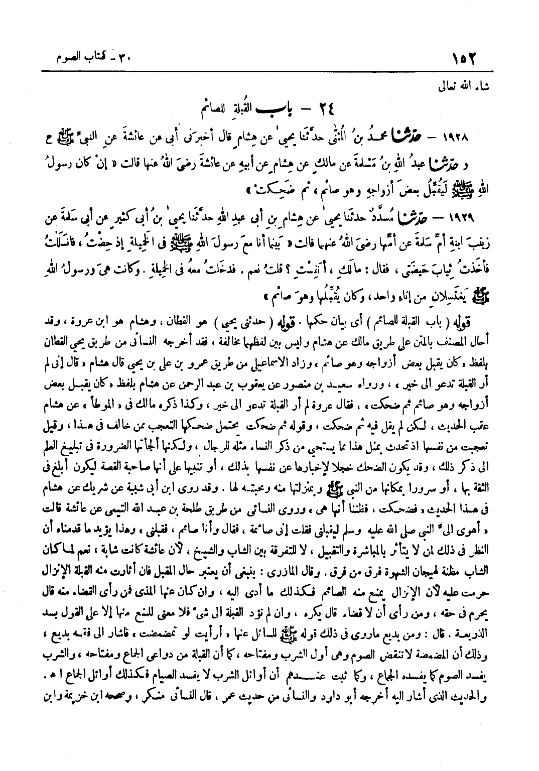 [1928] قَوْلُهُ حَدَّثَنِي يَحْيَى هُوَ الْقَطَّانُ وَهِشَامٌ هُوَ بن عُرْوَةَ وَقَدْ أَحَالَ الْمُصَنِّفُ بِالْمَتْنِ عَلَى طَرِيقِ مَالِكٍ عَنْ هِشَامٍ وَلَيْسَ بَيْنَ لَفْظِهِمَا مُخَالَفَةٌ فَقَدْ أَخْرَجَهُ النَّسَائِيُّ مِنْ طَرِيقِ يَحْيَى الْقَطَّانِ بِلَفْظِ كَانَ يُقَبِّلُ بَعْضَ أَزْوَاجِهِ وَهُوَ صَائِمٌ وَزَادَ الْإِسْمَاعِيلِيُّ مِنْ طَرِيقِ عَمْرِو بْنِ عَلِيِّ بْنِ يَحْيَى قَالَ هِشَامٌ قَالَ إِنِّي لَمْ أَرَ الْقُبْلَةَ تَدْعُو إِلَى خَيْرٍ وَرَوَاهُ سَعِيدُ بْنُ مَنْصُورٍ عَنْ يَعْقُوبَ بْنِ عَبْدِ الرَّحْمَنِ عَنْ هِشَامٍ بِلَفْظِ كَانَ يُقَبِّلُ بَعْضَ أَزْوَاجِهِ وَهُوَ صَائِمٌ ثُمَّ ضَحِكَتْ فَقَالَ عُرْوَةُ لَمْ أَرَ الْقُبْلَةَ تَدْعُو إِلَى خَيْرٍ وَكَذَا ذَكَرَهُ مَالِكٌ فِي الْمُوَطَّأِ عَنْ هِشَامٍ عَقِبَ الْحَدِيثِ لَكِنْ لَمْ يَقُلْ فِيهِ ثُمَّ ضَحِكَتْ وَقَوْلُهُ ثمَّ ضحِكت يحْتَمل ضحكها التَّعَجُّب مِمَّنْ خَالَفَ فِي هَذَا وَقِيلَ تَعَجَّبَتْ مِنْ نَفْسِهَا إِذْ تُحَدِّثُ بِمِثْلِ هَذَا مِمَّا يُسْتَحَى مِنْ ذِكْرِ النِّسَاءِ مِثْلَهُ لِلرِّجَالِ وَلَكِنَّهَا أَلْجَأَتْهَا الضَّرُورَةُ فِي تَبْلِيغِ الْعِلْمِ إِلَى ذِكْرِ ذَلِكَ وَقَدْ يَكُونُ الضَّحِكُ خَجَلًا لِإِخْبَارِهَا عَنْ نَفْسِهَا بِذَلِكَ أَوْ تَنْبِيهًا عَلَى أَنَّهَا صَاحِبَةُ الْقِصَّةِ لِيَكُونَ أَبْلَغَ فِي الثِّقَةِ بِهَا أَوْ سُرُورًا بِمَكَانِهَا مِنَ النَّبِيِّ صَلَّى اللَّهُ عَلَيْهِ وَسَلَّمَ وبمنزلتها مِنْهُ ومحبته لَهَا وَقد روى بن أَبِي شَيْبَةَ عَنْ شَرِيكٍ عَنْ هِشَامٍ فِي هَذَا الْحَدِيثِ فَضَحِكَتْ فَظَنَنَّا أَنَّهَا هِيَ وَرَوَى النَّسَائِيُّ مِنْ طَرِيقِ طَلْحَةَ بْنِ عَبْدِ اللَّهِ التَّيْمِيِّ عَنْ عَائِشَةَ قَالَتْ أَهْوَى إِلَيَّ النَّبِيُّ صَلَّى اللَّهُ عَلَيْهِ وَسَلَّمَ لِيُقَبِّلَنِي فَقُلْتُ إِنِّي صَائِمَةٌ فَقَالَ وَأَنَا صَائِمٌ فَقَبَّلَنِي وَهَذَا يُؤَيِّدُ مَا قَدَّمْنَاهُ أَنَّ النَّظَرَ فِي ذَلِكَ لِمَنْ لَا يَتَأَثَّرُ بِالْمُبَاشَرَةِ وَالتَّقْبِيلِ لَا لِلتَّفْرِقَةِ بَيْنَ الشَّابِّ وَالشَّيْخِ لِأَنَّ عَائِشَةَ كَانَتْ شَابَّةً نَعَمْ لَمَّا كَانَ الشَّابُّ مَظِنَّةً لِهَيَجَانِ الشَّهْوَةِ فَرَّقَ مَنْ فَرَّقَ وَقَالَ الْمَازِرِيُّ يَنْبَغِي أَنْ يُعْتَبَرَ حَالُ الْمُقَبِّلِ فَإِنْ أَثَارَتْ مِنْهُ الْقُبْلَةُ الْإِنْزَالَ حَرُمَتْ عَلَيْهِ لِأَنَّ الْإِنْزَالَ يُمْنَعُ مِنْهُ الصَّائِمُ فَكَذَلِكَ مَا أَدَّى إِلَيْهِ وَإِنْ كَانَ عَنْهَا الْمَذْيُ فَمَنْ رَأَى الْقَضَاءَ مِنْهُ قَالَ يَحْرُمُ فِي حَقِّهِ وَمَنْ رَأَى أَنْ لَا قَضَاءَ قَالَ يُكْرَهُ وَإِنْ لَمْ تُؤَدِّ الْقُبْلَةُ إِلَى شَيْءٍ فَلَا مَعْنَى لِلْمَنْعِ مِنْهَا إِلَّا عَلَى الْقَوْلِ بِسَدِّ الذَّرِيعَةِ قَالَ وَمِنْ بَدِيعِ مَا رُوِيَ فِي ذَلِكَ قَوْلُهُ صَلَّى اللَّهُ عَلَيْهِ وَسَلَّمَ لِلسَّائِلِ عَنْهَا أَرَأَيْتَ لَوْ تَمَضْمَضْتَ فَأَشَارَ إِلَى فِقْهٍ بَدِيعٍ وَذَلِكَ أَنَّ الْمَضْمَضَةَ لَا تَنْقُضُ الصَّوْمَ وَهِيَ أَوَّلُ الشُّرْبِ وَمِفْتَاحُهُ كَمَا أَنَّ الْقُبْلَةَ مِنْ دَوَاعِي الْجِمَاعِ وَمِفْتَاحِهِ وَالشُّرْبُ يُفْسِدُ الصَّوْمَ كَمَا يُفْسِدُهُ الْجِمَاعُ وَكَمَا ثَبَتَ عِنْدَهُمْ أَنَّ أَوَائِلَ الشُّرْبِ لَا يُفْسِدُ الصِّيَامَ فَكَذَلِكَ أَوَائِلُ الْجِمَاعِ اه وَالْحَدِيثُ الَّذِي أَشَارَ إِلَيْهِ أَخْرَجَهُ أَبُو دَاوُدَ وَالنَّسَائِيُّ مِنْ حَدِيثِ عمر قَالَ النَّسَائِيّ مُنكر وَصَححهُ بن خُزَيْمَة وبن
