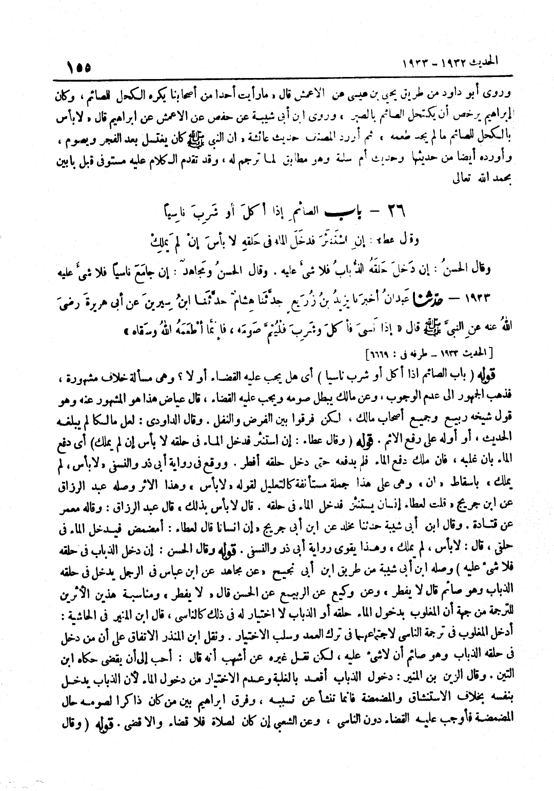 (قَوْلُهُ بَابٌ الصَّائِمُ إِذَا أَكَلَ أَوْ شَرِبَ نَاسِيًا أَيْ هَلْ يَجِبُ عَلَيْهِ الْقَضَاءُ أَوْ لَا وَهِيَ مَسْأَلَةُ خِلَافٍ مَشْهُورَةٌ فَذَهَبَ الْجُمْهُورُ إِلَى عَدَمِ الْوُجُوبِ وَعَنْ مَالِكٍ يَبْطُلُ صَوْمُهُ وَيَجِبُ عَلَيْهِ الْقَضَاءُ قَالَ عِيَاضٌ هَذَا هُوَ الْمَشْهُورُ عَنْهُ وَهُوَ قَوْلُ شَيْخِهِ رَبِيعٍ وَجَمِيعِ أَصْحَابِ مَالِكٍ لَكِنْ فَرَّقُوا بَيْنَ الْفَرْضِ وَالنَّفْلِ وَقَالَ الدَّاوُدِيُّ لَعَلَّ مَالِكًا لَمْ يَبْلُغْهُ الْحَدِيثُ أَوْ أَوَّلَهُ عَلَى رَفْعِ الْإِثْمِ قَوْلُهُ وَقَالَ عَطَاءٌ إِنِ اسْتَنْثَرَ فَدَخَلَ الْمَاءُ فِي حَلْقِهِ لَا بَأْسَ إِنْ لَمْ يَمْلِكْ أَيْ دَفْعَ الْمَاءِ بِأَنْ غَلَبَهُ فَإِنْ مَلَكَ دَفْعَ الْمَاءِ فَلَمْ يَدْفَعْهُ حَتَّى دَخَلَ حَلْقَهُ أَفْطَرَ وَوَقَعَ فِي رِوَايَةِ أَبِي ذَرٍّ وَالنَّسَفِيِّ لَا بَأْسَ لَمْ يَمْلِكْ بِإِسْقَاطِ إِنْ وَهِيَ عَلَى هَذَا جُمْلَةٌ مُسْتَأْنَفَةٌ كَالتَّعْلِيلِ لِقَوْلِهِ لَا بَأْسَ وَهَذَا الْأَثر وَصله عبد الرَّزَّاق عَن بن جُرَيْجٍ قُلْتُ لِعَطَاءٍ إِنْسَانٌ يَسْتَنْثِرُ فَدَخَلَ الْمَاءُ فِي حَلْقِهِ قَالَ لَا بَأْسَ بِذَلِكَ قَالَ عَبْدُ الرَّزَّاقِ وَقَالَهُ مَعْمَرٌ عَنْ قَتَادَةَ وَقَالَ بن أبي شيبَة حَدثنَا مخلد عَن بن أَبِي جُرَيْجٍ أَنَّ إِنْسَانًا قَالَ لِعَطَاءٍ أُمَضْمِضُ فَيَدْخُلُ الْمَاءُ فِي حَلْقِي قَالَ لَا بَأْسَ لَمْ يَمْلِكْ وَهَذَا يُقَوِّي رِوَايَةَ أَبِي ذَرٍّ وَالنَّسَفِيِّ قَوْلُهُ وَقَالَ الْحَسَنُ إِنْ دَخَلَ الذُّبَابُ فِي حلقه فَلَا شَيْء عَلَيْهِ وَصله بن أبي شيبَة من طَرِيق بن أبي نجيح عَن مُجَاهِد عَن بن عَبَّاسٍ فِي الرَّجُلِ يَدْخُلُ فِي حَلْقِهِ الذُّبَابُ وَهُوَ صَائِمٌ قَالَ لَا يُفْطِرُ وَعَنْ وَكِيعٍ عَنِ الرَّبِيعِ عَنِ الْحَسَنِ قَالَ لَا يُفْطِرُ وَمُنَاسَبَةُ هَذَيْنِ الْأَثَرَيْنِ لِلتَّرْجَمَةِ مِنْ جِهَةِ أَنَّ الْمَغْلُوبَ بِدُخُولِ الْمَاءِ حَلْقَهُ أَوِ الذُّبَابِ لَا اخْتِيَار لَهُ فِي ذَلِك كالناسى قَالَ بن الْمُنِيرِ فِي الْحَاشِيَةِ أَدْخَلَ الْمَغْلُوبَ فِي تَرْجَمَةِ النَّاسِي لِاجْتِمَاعِهِمَا فِي تَرْكِ الْعَمْدِ وَسَلْبِ الِاخْتِيَارِ وَنقل بن الْمُنْذِرِ الِاتِّفَاقَ عَلَى أَنَّ مَنْ دَخَلَ فِي حَلْقِهِ الذُّبَابُ وَهُوَ صَائِمٌ أَنْ لَا شَيْءَ عَلَيْهِ لَكِنْ نَقَلَ غَيْرُهُ عَنْ أَشْهَبَ أَنَّهُ قَالَ أحب إِلَى أَن يقْضِي حَكَاهُ بن التِّينِ وَقَالَ الزَّيْنُ بْنُ الْمُنِيرِ دُخُولُ الذُّبَابِ أَقْعَدُ بِالْغَلَبَةِ وَعَدَمِ الِاخْتِيَارِ مِنْ دُخُولِ الْمَاءِ لِأَنَّ الذُّبَابَ يَدْخُلُ بِنَفْسِهِ بِخِلَافِ الِاسْتِنْشَاقِ وَالْمَضْمَضَةِ فَإِنَّمَا تَنْشَأُ عَنْ تَسَبُّبِهِ وَفَرَّقَ إِبْرَاهِيمُ بَيْنَ مَنْ كَانَ ذَاكِرًا لِصَوْمِهِ حَالَ الْمَضْمَضَةِ فَأَوْجَبَ عَلَيْهِ الْقَضَاءَ دُونَ النَّاسِي وَعَنِ الشَّعْبِيِّ إِنْ كَانَ لِصَلَاةٍ فَلَا قَضَاءَ وَإِلَّا قَضَى قَوْلُهُ وَقَالَ)
