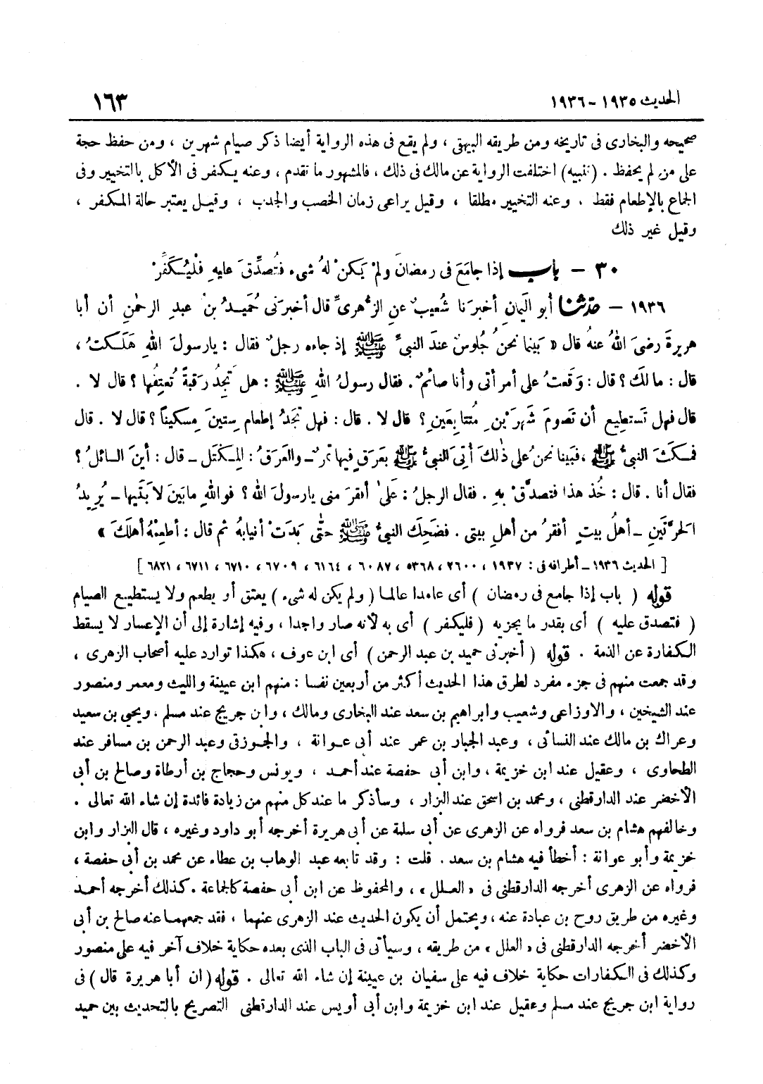 [1936] أَخْبرنِي حميد بن عبد الرَّحْمَن أَي بن عَوْفٍ هَكَذَا تَوَارَدَ عَلَيْهِ أَصْحَابُ الزُّهْرِيِّ وَقَدْ جَمَعْتُ مِنْهُمْ فِي جُزْءٍ مُفْرَدٍ لِطُرُقِ هَذَا الحَدِيث أَكثر من أَرْبَعِينَ نفسا مِنْهُم بن عُيَيْنَةَ وَاللَّيْثُ وَمَعْمَرٌ وَمَنْصُورٌ عِنْدَ الشَّيْخَيْنِ وَالْأَوْزَاعِيُّ وَشُعَيْبٌ وَإِبْرَاهِيمُ بْنُ سَعْدٍ عِنْدَ الْبُخَارِيِّ وَمَالِكٍ وبن جُرَيْجٍ عِنْدَ مُسْلِمٍ وَيَحْيَى بْنُ سَعِيدٍ وَعِرَاكُ بْنُ مَالِكٍ عِنْدَ النَّسَائِيِّ وَعَبْدُ الْجَبَّارِ بْنُ عُمَرَ عِنْدَ أَبِي عَوَانَةَ وَالْجَوْزَقِيُّ وَعَبْدُ الرَّحْمَنِ بن مُسَافر عِنْد الطَّحَاوِيّ وَعقيل عِنْد بن خُزَيْمَة وبن أَبِي حَفْصَةَ عِنْدَ أَحْمَدَ وَيُونُسُ وَحَجَّاجُ بْنُ أَرْطَاةَ وَصَالِحُ بْنُ أَبِي الْأَخْضَرِ عِنْدَ الدَّارَقُطْنِيِّ وَمُحَمَّدُ بْنُ إِسْحَاقَ عِنْدَ الْبَزَّارِ وَسَأَذْكُرُ مَا عِنْدَ كُلٍّ مِنْهُمْ مِنْ زِيَادَةِ فَائِدَةٍ إِنْ شَاءَ اللَّهُ تَعَالَى وَخَالَفَهُمْ هِشَامُ بْنُ سَعْدٍ فَرَوَاهُ عَنِ الزُّهْرِيِّ عَنْ أَبِي سَلَمَةَ عَنْ أَبِي هُرَيْرَةَ أَخْرَجَهُ أَبُو دَاوُدَ وَغَيْرُهُ قَالَ الْبَزَّار وبن خُزَيْمَةَ وَأَبُو عَوَانَةَ أَخْطَأَ فِيهِ هِشَامُ بْنُ سَعْدٍ قُلْتُ وَقَدْ تَابَعَهُ عَبْدُ الْوَهَّابِ بْنُ عَطَاءٍ عَنْ مُحَمَّدِ بْنِ أَبِي حَفْصَةَ فَرَوَاهُ عَنِ الزُّهْرِيِّ أَخْرَجَهُ الدَّارَقُطْنِيُّ فِي الْعِلَلِ وَالْمَحْفُوظُ عَن بن أَبِي حَفْصَةَ كَالْجَمَاعَةِ كَذَلِكَ أَخْرَجَهُ أَحْمَدُ وَغَيْرُهُ مِنْ طَرِيقِ رَوْحِ بْنِ عُبَادَةَ عَنْهُ وَيُحْتَمَلُ أَنْ يَكُونَ الْحَدِيثُ عِنْدَ الزُّهْرِيِّ عَنْهُمَا فَقَدْ جَمَعَهُمَا عَنْهُ صَالِحُ بْنُ أَبِي الْأَخْضَرِ أَخْرَجَهُ الدَّارَقُطْنِيُّ فِي الْعِلَلِ مِنْ طَرِيقِهِ وَسَيَأْتِي فِي الْبَابِ الَّذِي بَعْدَهُ حِكَايَةُ خِلَافٍ آخَرَ فِيهِ عَلَى مَنْصُورٍ وَكَذَلِكَ فِي الْكَفَّارَاتِ حِكَايَةُ خِلَافٍ فِيهِ عَلَى سُفْيَانَ بْنِ عُيَيْنَةَ إِنْ شَاءَ اللَّهُ تَعَالَى قَوْلُهُ إِنَّ أَبَا هُرَيْرَةَ قَالَ فِي رِوَايَةِ بن جريج عِنْد مُسلم وَعقيل عِنْد بن خُزَيْمَة وبن أَبِي أُوَيْسٍ عِنْدَ الدَّارَقُطْنِيِّ التَّصْرِيحُ بِالتَّحْدِيثِ بَيْنَ حميد
