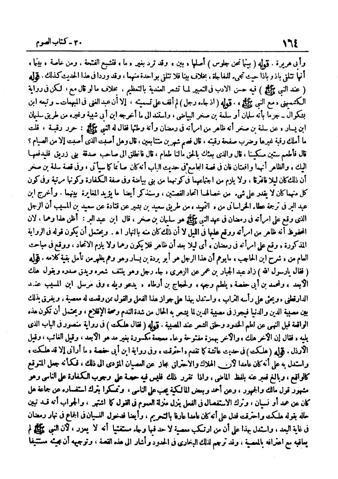 وَأَبِي هُرَيْرَةَ قَوْلُهُ بَيْنَمَا نَحْنُ جُلُوسٌ أَصْلُهَا بَيْنَ وَقَدْ تَرِدُ بِغَيْرِ مَا فَتُشْبَعُ الْفَتْحَةُ وَمن خَاصَّة بَيْنَمَا أَنَّهَا تتلقى باذوباذا حَيْثُ تَجِيءُ لِلْمُفَاجَأَةِ بِخِلَافِ بَيْنَا فَلَا تُتَلَقَّى بِوَاحِدَةٍ مِنْهُمَا وَقَدْ وَرَدَا فِي هَذَا الْحَدِيثِ كَذَلِكَ قَوْلُهُ عِنْدَ النَّبِيِّ صَلَّى اللَّهُ عَلَيْهِ وَسَلَّمَ فِيهِ حُسْنُ الْأَدَبِ فِي التَّعْبِيرِ لِمَا تُشْعِرُ الْعِنْدِيَّةُ بِالتَّعْظِيمِ بِخِلَافِ مَا لَوْ قَالَ مَعَ لَكِنْ فِي رِوَايَةِ الْكُشْمِيهَنِيِّ مَعَ النَّبِيِّ صَلَّى اللَّهُ عَلَيْهِ وَسَلَّمَ قَوْلُهُ إِذْ جَاءَهُ رَجُلٌ لَمْ أَقِفْ عَلَى تَسْمِيَتِهِ إِلَّا أَنَّ عبد الْغَنِيّ فِي المبهمات وَتَبعهُ بن بَشْكُوَالَ جَزْمًا بِأَنَّهُ سُلَيْمَانُ أَوْ سَلَمَةُ بْنُ صَخْر البياضي واستند إِلَى مَا أخرجه بن أَبِي شَيْبَةَ وَغَيْرُهُ مِنْ طَرِيقِ سُلَيْمَانَ بْنِ يَسَارٍ عَنْ سَلَمَةَ بْنِ صَخْرٍ أَنَّهُ ظَاهَرَ مِنِ امْرَأَتِهِ فِي رَمَضَانَ وَأَنَّهُ وَطِئَهَا فَقَالَ لَهُ النَّبِيُّ صَلَّى اللَّهُ عَلَيْهِ وَسَلَّمَ حَرِّرْ رَقَبَةً قُلْتُ مَا أَمْلِكُ رَقَبَةً غَيْرَهَا وَضَرَبَ صَفْحَةَ رَقَبَتِهِ قَالَ فَصُمْ شَهْرَيْنِ مُتَتَابِعِينَ قَالَ وَهَلْ أَصَبْتُ الَّذِي أَصَبْتُ إِلَّا مِنَ الصِّيَامِ قَالَ فَأَطْعِمْ سِتِّينَ مِسْكَيْنَا قَالَ وَالَّذِي بَعَثَكَ بِالْحَقِّ مَا لَنَا طَعَامٌ قَالَ فَانْطَلِقْ إِلَى صَاحِبِ صَدَقَةِ بَنِي زُرَيْقٍ فَلْيَدْفَعْهَا إِلَيْكَ وَالظَّاهِرُ أَنَّهُمَا وَاقِعَتَانِ فَإِنَّ فِي قِصَّةِ الْمُجَامِعِ فِي حَدِيثِ الْبَابِ أَنَّهُ كَانَ صَائِمًا كَمَا سَيَأْتِي وَفِي قِصَّةِ سَلَمَةَ بْنِ صَخْرٍ أَنَّ ذَلِكَ كَانَ لَيْلًا فَافْتَرَقَا وَلَا يَلْزَمُ مِنِ اجْتِمَاعِهِمَا فِي كَوْنِهِمَا مِنْ بَنِي بَيَاضَةَ وَفِي صِفَةِ الْكَفَّارَةِ وَكَوْنِهَا مُرَتَّبَةً وَفِي كَوْنِ كُلٍّ مِنْهُمَا كَانَ لَا يَقْدِرُ عَلَى شَيْءٍ مِنْ خِصَالِهَا اتِّحَادُ الْقِصَّتَيْنِ وَسَنَذْكُرُ أَيْضًا مَا يُؤَيِّدُ الْمُغَايِرَةَ بَينهمَا وَأخرج بن عبد الْبر فِي تَرْجَمَة عَطاء الخرساني مِنَ التَّمْهِيدِ مِنْ طَرِيقِ سَعِيدِ بْنِ بَشِيرٍ عَنْ قَتَادَةَ عَنْ سَعِيدِ بْنِ الْمُسَيَّبِ أَنَّ الرَّجُلَ الَّذِي وَقَعَ عَلَى امْرَأَتِهِ فِي رَمَضَانَ فِي عَهْدِ النَّبِيِّ صَلَّى اللَّهُ عَلَيْهِ وَسَلَّمَ هُوَ سُلَيْمَان بن صَخْر قَالَ بن عَبْدِ الْبَرِّ أَظُنُّ هَذَا وَهْمًا لِأَنَّ الْمَحْفُوظَ أَنَّهُ ظَاهَرَ مِنِ امْرَأَتِهِ وَوَقَعَ عَلَيْهَا فِي اللَّيْلِ لَا أَنَّ ذَلِكَ كَانَ مِنْهُ بِالنَّهَارِ اه وَيُحْتَمَلُ أَنْ يَكُونَ قَوْلُهُ فِي الرِّوَايَةِ الْمَذْكُورَةِ وَقَعَ عَلَى امْرَأَتِهِ فِي رَمضَانَ أَيْ لَيْلًا بَعْدَ أَنْ ظَاهَرَ فَلَا يَكُونُ وَهْمًا وَلَا يَلْزَمُ الِاتِّحَادُ وَوَقَعَ فِي مَبَاحِثِ الْعَامِّ من شرح بن الْحَاجِبِ مَا يُوهِمُ أَنَّ هَذَا الرَّجُلَ هُوَ أَبُو بُرْدَةَ بْنُ يَسَارٍ وَهُوَ وَهَمٌ يَظْهَرُ مِنْ تَأَمُّلِ بَقِيَّةِ كَلَامِهِ قَوْلُهُ فَقَالَ يَا رَسُولَ اللَّهِ زَادَ عَبْدُ الْجَبَّارِ بْنُ عُمَرَ عَنِ الزُّهْرِيِّ جَاءَ رَجُلٌ وَهُوَ يَنْتِفُ شَعْرَهُ وَيَدُقُّ صَدْرَهُ وَيَقُولُ هَلَكَ الْأَبْعَدُ وَلِمُحَمَّدِ بْنِ أَبِي حَفْصَةَ يَلْطِمُ وَجْهَهُ وَلِحَجَّاجِ بْنِ أَرْطَاةَ يَدْعُو ويله وَفِي مُرْسل بن الْمُسَيَّبِ عِنْدَ الدَّارَقُطْنِيِّ وَيُحْثِي عَلَى رَأْسِهِ التُّرَابَ وَاسْتُدِلَّ بِهَذَا عَلَى جَوَازِ هَذَا الْفِعْلِ وَالْقَوْلِ مِمَّن وَقَعَتْ لَهُ مَعْصِيَةٌ وَيُفَرَّقُ بِذَلِكَ بَيْنَ مُصِيبَةِ الدِّينِ وَالدُّنْيَا ف