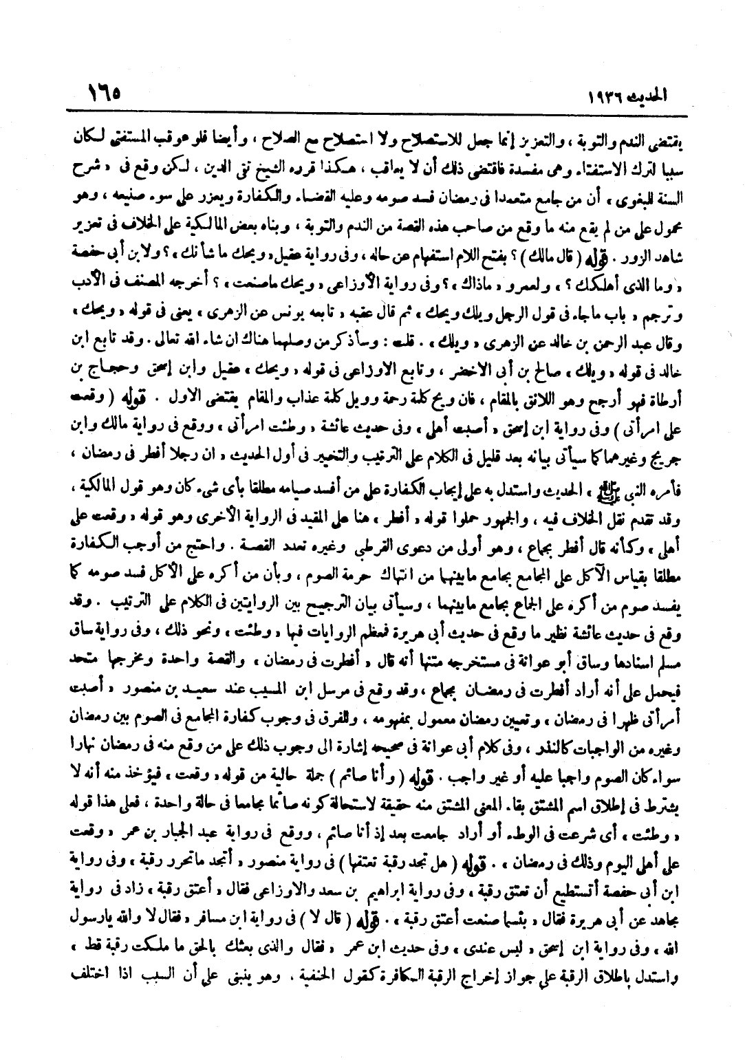 يقتضى النَّدَم وَالتَّوْبَة والتعزيز إِنَّمَا جعل للاستصلاح وَلَا استصلاح مَعَ الصَّلَاحِ وَأَيْضًا فَلَوْ عُوقِبَ الْمُسْتَفْتِي لَكَانَ سَبَبًا لِتَرْكِ الِاسْتِفْتَاءِ وَهِيَ مَفْسَدَةٌ فَاقْتَضَى ذَلِكَ أَنْ لَا يُعَاقَبَ هَكَذَا قَرَّرَهُ الشَّيْخُ تَقِيُّ الدِّينِ لَكِنْ وَقَعَ فِي شَرْحِ السُّنَّةِ لِلْبَغَوِيِّ أَنَّ مَنْ جَامَعَ مُتَعَمِّدًا فِي رَمَضَانَ فَسَدَ صَوْمُهُ وَعَلَيْهِ الْقَضَاءُ وَالْكَفَّارَةُ وَيُعَزَّرُ عَلَى سُوءِ صَنِيعِهِ وَهُوَ مَحْمُولٌ عَلَى مَنْ لَمْ يَقَعْ مِنْهُ مَا وَقَعَ مِنْ صَاحِبِ هَذِهِ الْقِصَّةِ مِنَ النَّدَمِ وَالتَّوْبَةِ وَبَنَاهُ بَعْضُ الْمَالِكِيَّةِ عَلَى الْخِلَافِ فِي تَعْزِير شَاهد الزُّور قَوْله قَالَ مَالك بِفَتْحِ اللَّامِ اسْتِفْهَامٌ عَنْ حَالِهِ وَفِي رِوَايَةِ عُقَيْلٍ وَيْحَكَ مَا شَأْنُكَ وَلِابْنِ أَبِي حَفْصَةَ وَمَا الَّذِي أَهْلَكَكَ وَلِعَمْرٍو مَا ذَاكَ وَفِي رِوَايَةِ الْأَوْزَاعِيِّ وَيْحَكَ مَا صَنَعْتَ أَخْرَجَهُ الْمُصَنِّفُ فِي الْأَدَبِ وَتَرْجَمَ بَابُ مَا جَاءَ فِي قَوْلِ الرَّجُلِ وَيْلَكَ وَيْحَكَ ثُمَّ قَالَ عَقِبَهُ تَابَعَهُ يُونُسُ عَنِ الزُّهْرِيِّ يَعْنِي فِي قَوْلِهِ وَيْحَكَ وَقَالَ عَبْدُ الرَّحْمَنِ بْنُ خَالِدٍ عَنِ الزُّهْرِيِّ وَيْلَكَ قُلْتُ وَسَأَذْكُرُ مَنْ وَصَلَهُمَا هُنَاكَ أَن شَاءَ الله تَعَالَى وَقد تَابع بن خَالِدٍ فِي قَوْلِهِ وَيْلَكَ صَالِحُ بْنُ أَبِي الْأَخْضَرِ وَتَابَعَ الْأَوْزَاعِيَّ فِي قَوْلِهِ وَيْحَكَ عُقَيْلٌ وبن إِسْحَاقَ وَحَجَّاجُ بْنُ أَرْطَاةَ فَهُوَ أَرْجَحُ وَهُوَ اللَّائِق بالْمقَام فَإِن وَيْح كلمة رَحْمَة وويل كَلِمَةُ عَذَابٍ وَالْمَقَامُ يَقْتَضِي الْأَوَّلَ قَوْلُهُ وَقَعْتُ على امراتى وَفِي رِوَايَة بن إِسْحَاقَ أَصَبْتُ أَهْلِي وَفِي حَدِيثِ عَائِشَةَ وَطِئْتُ امْرَأَتي وَوَقع فِي رِوَايَة مَالك وبن جُرَيْجٍ وَغَيْرِهِمَا كَمَا سَيَأْتِي بَيَانُهُ بَعْدَ قَلِيلٍ فِي الْكَلَامِ عَلَى التَّرْتِيبِ وَالتَّخْيِيرِ فِي أَوَّلِ الْحَدِيثِ أَنَّ رَجُلًا أَفْطَرَ فِي رَمَضَانَ فَأَمَرَهُ النَّبِيُّ صَلَّى اللَّهُ عَلَيْهِ وَسَلَّمَ الْحَدِيثَ وَاسْتُدِلَّ بِهِ عَلَى إِيجَابِ الْكَفَّارَةِ عَلَى مَنْ أَفْسَدَ صِيَامَهُ مُطْلَقًا بِأَيِّ شَيْءٍ كَانَ وَهُوَ قَوْلُ الْمَالِكِيَّةِ وَقَدْ تَقَدَّمَ نَقْلُ الْخِلَافِ فِيهِ وَالْجُمْهُورُ حَمَلُوا قَوْلُهُ أَفْطَرَ هُنَا عَلَى الْمُقَيَّدِ فِي الرِّوَايَةِ الْأُخْرَى وَهُوَ قَوْلُهُ وَقَعْتُ عَلَى أَهْلِي وَكَأَنَّهُ قَالَ أَفْطَرَ بِجِمَاعٍ وَهُوَ أَوْلَى مِنْ دَعْوَى الْقُرْطُبِيِّ وَغَيْرِهِ تَعَدُّدَ الْقِصَّةِ وَاحْتَجَّ مَنْ أَوْجَبَ الْكَفَّارَةَ مُطْلَقًا بِقِيَاسِ الْآكِلِ عَلَى الْمُجَامِعِ بِجَامِعِ مَا بَيْنَهُمَا مِنَ انْتَهَاكِ حُرْمَةِ الصَّوْمِ وَبِأَنَّ مَنْ أُكْرِهَ عَلَى الْأَكْلِ فَسَدَ صَوْمُهُ كَمَا يَفْسُدُ صَوْمُ مَنْ أُكْرِهَ عَلَى الْجِمَاعِ بِجَامِعِ مَا بَيْنَهُمَا وَسَيَأْتِي بَيَانُ التَّرْجِيحِ بَيْنَ الرِّوَايَتَيْنِ فِي الْكَلَامِ عَلَى التَّرْتِيبِ وَقَدْ وَقَعَ فِي حَدِيثِ عَائِشَةَ نَظِيرُ مَا وَقَعَ فِي حَدِيثِ أَبِي هُرَيْرَةَ فَمُعْظَمُ الرِّوَايَاتِ فِيهَا وَطِئْتُ وَنَحْوُ ذَلِكَ وَفِي رِوَايَةٍ سَاقَ مُسْلِمٌ إِسْنَادَهَا وَسَاقَ أَبُو عَوَانَةَ فِي مُسْتَخْرَجِهِ مَتْنَهَا أَنَّهُ قَالَ أَفْطَرْتُ فِي رَمَضَانَ وَالْقِصَّةُ وَاحِدَةٌ وَمَخْرَجُهَا مُتَّحِدٌ فَيُحْمَلُ عَلَى أَنَّهُ أَرَادَ أَفْطَرْتُ فِي رَمَضَان بجماع وَقد وَقع فِي مُرْسل بن الْمُسَيَّبِ عِنْدَ سَعِيدِ بْنِ مَنْصُورٍ أَصَبْتُ امْرَأَتِي ظُهْرًا فِي رَمَضَانَ 