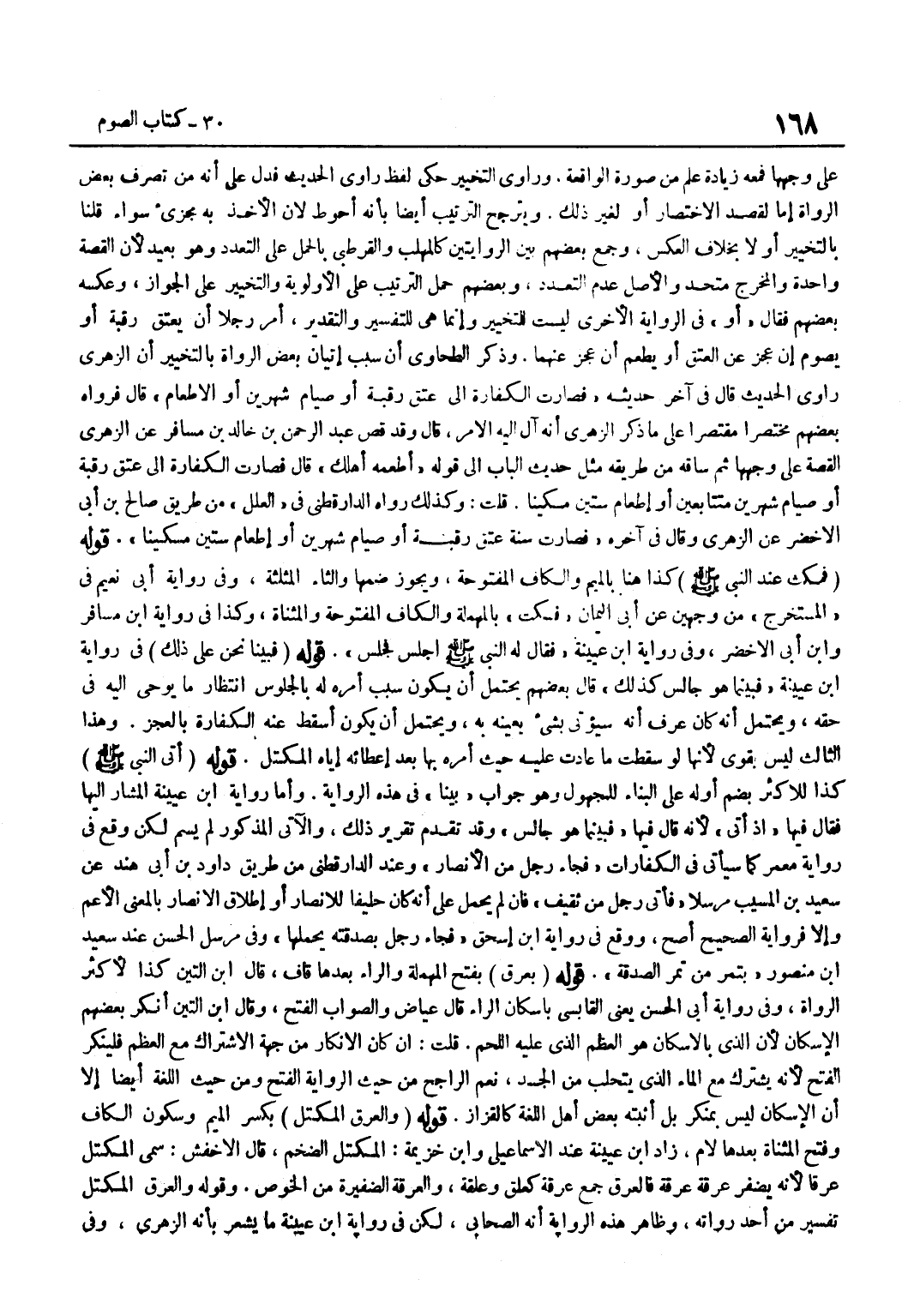 عَلَى وَجْهِهَا فَمَعَهُ زِيَادَةُ عِلْمٍ مِنْ صُورَةِ الْوَاقِعَةِ وَرَاوِي التَّخْيِيرِ حَكَى لَفْظَ رَاوِي الْحَدِيثِ فَدَلَّ عَلَى أَنَّهُ مِنْ تَصَرُّفِ بَعْضِ الرُّوَاةِ إِمَّا لِقَصْدِ الِاخْتِصَارِ أَوْ لِغَيْرِ ذَلِكَ وَيَتَرَجَّحُ التَّرْتِيبُ أَيْضًا بِأَنَّهُ أَحْوَطُ لِأَنَّ الْأَخْذَ بِهِ مجزىء سَوَاءٌ قُلْنَا بِالتَّخْيِيرِ أَوْ لَا بِخِلَافِ الْعَكْسِ وَجَمَعَ بَعْضُهُمْ بَيْنَ الرِّوَايَتَيْنِ كَالْمُهَلَّبِ وَالْقُرْطُبِيِّ بِالْحَمْلِ عَلَى التَّعَدُّدِ وَهُوَ بَعِيدٌ لِأَنَّ الْقِصَّةَ وَاحِدَةٌ وَالْمَخْرَجُ مُتَّحِدٌ وَالْأَصْلُ عَدَمُ التَّعَدُّدِ وَبَعْضُهُمْ حَمَلَ التَّرْتِيبَ عَلَى الْأَوْلَوِيَّةِ وَالتَّخْيِيرَ عَلَى الْجَوَازِ وَعَكَسَهُ بَعْضُهُمْ فَقَالَ أَوْ فِي الرِّوَايَةِ الْأُخْرَى لَيْسَتْ لِلتَّخْيِيرِ وَإِنَّمَا هِيَ لِلتَّفْسِيرِ وَالتَّقْدِيرِ أَمَرَ رَجُلًا أَنْ يُعْتِقَ رَقَبَةً أَوْ يَصُومَ إِنْ عَجَزَ عَنِ الْعِتْقِ أَوْ يُطْعِمَ إِنْ عَجَزَ عَنْهُمَا وَذَكَرَ الطَّحَاوِيُّ أَنَّ سَبَبَ إِتْيَانِ بَعْضِ الرُّوَاةِ بِالتَّخْيِيرِ أَنَّ الزُّهْرِيَّ رَاوِيَ الْحَدِيثِ قَالَ فِي آخِرِ حَدِيثِهِ فَصَارَتِ الْكَفَّارَةُ إِلَى عِتْقِ رَقَبَةٍ أَوْ صِيَامِ شَهْرَيْنِ أَوِ الْإِطْعَامِ قَالَ فَرَوَاهُ بَعْضُهُمْ مُخْتَصَرًا مُقْتَصَرًا عَلَى مَا ذَكَرَ الزُّهْرِيُّ أَنَّهُ آلَ إِلَيْهِ الْأَمْرُ قَالَ وَقَدْ قَصَّ عَبْدُ الرَّحْمَنِ بْنُ خَالِدِ بْنِ مُسَافِرٍ عَنِ الزُّهْرِيِّ الْقِصَّةَ عَلَى وَجْهِهَا ثُمَّ سَاقَهُ مِنْ طَرِيقِهِ مِثْلَ حَدِيثِ الْبَابِ إِلَى قَوْلِهِ أَطْعِمْهُ أَهْلَكَ قَالَ فَصَارَتِ الْكَفَّارَةُ إِلَى عِتْقِ رَقَبَةٍ أَوْ صِيَامِ شَهْرَيْنِ مُتَتَابِعَيْنِ أَوْ إِطْعَامِ سِتِّينَ مِسْكِينًا قُلْتُ وَكَذَلِكَ رَوَاهُ الدَّارَقُطْنِيُّ فِي الْعِلَلِ مِنْ طَرِيقِ صَالِحِ بْنِ أَبِي الْأَخْضَرِ عَنِ الزُّهْرِيِّ وَقَالَ فِي آخِرِهِ فَصَارَتْ سُنَّةً عِتْقُ رَقَبَةٍ أَوْ صِيَامُ شَهْرَيْنِ أَوْ إِطْعَامُ سِتِّينَ مِسْكِينًا قَوْلُهُ فَمَكَثَ عِنْدَ النَّبِيِّ صَلَّى اللَّهُ عَلَيْهِ وَسَلَّمَ كَذَا هُنَا بِالْمِيمِ وَالْكَافِ الْمَفْتُوحَةِ وَيَجُوزُ ضَمُّهَا وَالثَّاءِ الْمُثَلَّثَةِ وَفِي رِوَايَةِ أَبِي نُعَيْمٍ فِي الْمُسْتَخْرَجِ مِنْ وَجْهَيْنِ عَنْ أَبِي الْيَمَانِ فَسَكَتَ بِالْمُهْمَلَةِ وَالْكَافِ الْمَفْتُوحَةِ وَالْمُثَنَّاةِ وَكَذَا فِي رِوَايَة بن مُسَافر وبن أَبى الْأَخْضَر وَفِي رِوَايَة بن عُيَيْنَةَ فَقَالَ لَهُ النَّبِيُّ صَلَّى اللَّهُ عَلَيْهِ وَسَلَّمَ اجْلِسْ فَجَلَسَ قَوْلُهُ فَبَيْنَا نَحْنُ عَلَى ذَلِكَ فِي رِوَايَةِ بن عُيَيْنَةَ فَبَيْنَمَا هُوَ جَالِسٌ كَذَلِكَ قَالَ بَعْضُهُمْ يُحْتَمَلُ أَنْ يَكُونَ سَبَبُ أَمْرِهِ لَهُ بِالْجُلُوسِ انْتِظَارَ مَا يُوحَى إِلَيْهِ فِي حَقِّهِ وَيُحْتَمَلُ أَنَّهُ كَانَ عَرَفَ أَنَّهُ سَيُؤْتَى بِشَيْءٍ يُعِينُهُ بِهِ وَيُحْتَمَلُ أَنْ يَكُونَ أَسْقَطَ عَنْهُ الْكَفَّارَةَ بِالْعَجْزِ وَهَذَا الثَّالِثُ لَيْسَ بِقَوِيٍّ لِأَنَّهَا لَوْ سَقَطَتْ مَا عَادَتْ عَلَيْهِ حَيْثُ أَمَرَهُ بِهَا بَعْدَ إِعْطَائِهِ إِيَّاهُ الْمِكْتَلَ قَوْلُهُ أُتِيَ النَّبِيَّ صَلَّى اللَّهُ عَلَيْهِ وَسَلَّمَ كَذَا لِلْأَكْثَرِ بِضَمِّ أَوَّلِهِ عَلَى الْبِنَاءِ لِلْمَجْهُولِ وَهُوَ جَوَابُ بَيْنَا فِي هَذِه الرِّوَايَة وَأما رِوَايَة بن عُيَيْنَةَ الْمُشَارُ إِلَيْهَا فَقَالَ فِيهَا إِذْ أُتِيَ لِأَنَّهُ قَالَ فِيهَا فَبَيْنَمَا هُوَ جَالِسٌ وَقَدْ تَقَدَّمَ تَقْرِيرُ ذَلِكَ وَالْآتِي الْمَذْكُورُ لَمْ يُسَمَّ لَكِنْ وَقَعَ فِي ر