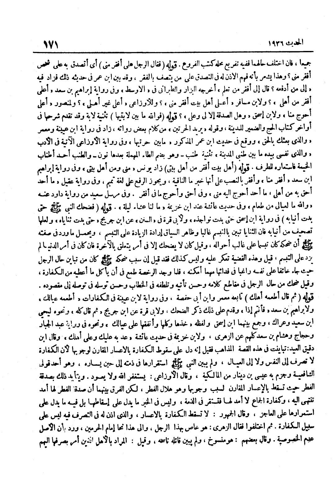 جَمِيعًا فَإِنِ اخْتَلَفَ حَالُهُمَا فَفِيهِ تَفْرِيعٌ مَحَلُّهُ كُتُبُ الْفُرُوعِ قَوْلُهُ فَقَالَ الرَّجُلُ عَلَى أَفْقَرَ مِنِّي أَيْ أَتَصَدَّقُ بِهِ عَلَى شَخْصٍ أَفْقَرَ مِنِّي وَهَذَا يُشْعِرُ بِأَنَّهُ فَهِمَ الْإِذْنَ لَهُ فِي التَّصَدُّقِ عَلَى مَنْ يَتَّصِفُ بِالْفَقْرِ وَقَدْ بَين بن عُمَرَ فِي حَدِيثِهِ ذَلِكَ فَزَادَ فِيهِ إِلَى مَنْ أَدْفَعُهُ قَالَ إِلَى أَفْقَرَ مَنْ تَعْلَمُ أَخْرَجَهُ الْبَزَّارُ وَالطَّبَرَانِيُّ فِي الْأَوْسَطِ وَفِي رِوَايَةِ إِبْرَاهِيمَ بْنِ سَعْدٍ أَعَلَى أَفْقَرَ مِنْ أَهْلِي وَلِابْنِ مُسَافِرٍ أَعَلَى أَهْلِ بَيْتٍ أَفْقَرَ مِنِّي وَلِلْأَوْزَاعِيِّ أَعَلَى غَيْرِ أَهْلِي وَلِمَنْصُورٍ أَعَلَى أَحْوَجَ مِنَّا وَلِابْنِ إِسْحَاقَ وَهَلِ الصَّدَقَةُ إِلَّا لِي وَعَلَيَّ قَوْلُهُ فَوَاللَّهِ مَا بَيْنَ لَابَتَيْهَا تَثْنِيَةُ لَابَةٍ وَقَدْ تَقَدَّمَ شَرْحُهَا فِي أَوَاخِرِ كِتَابِ الْحَجِّ وَالضَّمِيرُ لِلْمَدِينَةِ وَقَوْلُهُ يُرِيدُ الْحَرَّتَيْنِ مِنْ كَلَام بعض رُوَاته زَاد فِي رِوَايَة بن عُيَيْنَةَ وَمَعْمَرٍ وَالَّذِي بَعَثَكَ بِالْحَقِّ وَوَقَعَ فِي حَدِيث بن عُمَرَ الْمَذْكُورِ مَا بَيْنَ حَرَّتَيْهَا وَفِي رِوَايَةِ الْأَوْزَاعِيِّ الْآتِيَةِ فِي الْأَدَبِ وَالَّذِي نَفْسِي بِيَدِهِ مَا بَيْنَ طُنُبَيِ الْمَدِينَةِ تَثْنِيَةُ طُنُبٍ وَهُوَ بِضَمِّ الطَّاءِ الْمُهْمَلَةِ بَعْدَهَا نُونٌ وَالطُّنُبُ أَحَدُ أَطْنَابِ الْخَيْمَةِ فَاسْتَعَارَهُ لِلطَّرَفِ قَوْلُهُ أَهْلُ بَيْتٍ أَفْقَرُ مِنْ أَهْلِ بَيْتِي زَادَ يُونُسُ مِنِّي وَمِنْ أَهْلِ بَيْتِي وَفِي رِوَايَةِ إِبْرَاهِيمَ بْنِ سعد أفقر منا وأفقر بِالنَّصْبِ عَلَى أَنَّهَا خَبَرُ مَا النَّافِيَةِ وَيَجُوزُ الرَّفْعُ عَلَى لُغَةِ تَمِيمٍ وَفِي رِوَايَةِ عُقَيْلٍ مَا أَحَدٌ أَحَقَّ بِهِ مِنْ أَهْلِي مَا أحد أحْوج إِلَيْهِ مني وَفِي أَحَق واحوج مَا فِي أَفْقَرَ وَفِي مُرْسَلِ سَعِيدٍ مِنْ رِوَايَةِ دَاوُدَ عَنْهُ وَاللَّهِ مَا لِعِيَالِي مِنْ طَعَام وَفِي حَدِيث عَائِشَة عِنْد بن خُزَيْمَةَ مَا لَنَا عَشَاءُ لَيْلَةٍ قَوْلُهُ فَضَحِكَ النَّبِيُّ صَلَّى اللَّهُ عَلَيْهِ وَسَلَّمَ حَتَّى بَدَتْ انيابه فِي رِوَايَة بن إِسْحَاقَ حَتَّى بَدَتْ نَوَاجِذُهُ وَلِأَبِي قُرَّةَ فِي السّنَن عَن بن جُرَيْجٍ حَتَّى بَدَتْ ثَنَايَاهُ وَلَعَلَّهَا تَصْحِيفٌ مِنْ أَنْيَابِهِ فَإِنَّ الثَّنَايَا تَبِينُ بِالتَّبَسُّمِ غَالِبًا وَظَاهِرُ السِّيَاقِ إِرَادَةُ الزِّيَادَةِ عَلَى التَّبَسُّمِ وَيُحْمَلُ مَا وَرَدَ فِي صِفَتِهِ صَلَّى اللَّهُ عَلَيْهِ وَسَلَّمَ أَنَّ ضَحِكَهُ كَانَ تَبَسُّمًا عَلَى غَالِبِ أَحْوَالِهِ وَقِيلَ كَانَ لَا يَضْحَكُ إِلَّا فِي أَمْرٍ يَتَعَلَّقُ بِالْآخِرَةِ فَإِنْ كَانَ فِي أَمْرِ الدُّنْيَا لَمْ يَزِدْ عَلَى التَّبَسُّمِ قِيلَ وَهَذِهِ الْقَضِيَّةُ تُعَكِّرُ عَلَيْهِ وَلَيْسَ كَذَلِكَ فَقَدْ قِيلَ إِنَّ سَبَبَ ضَحِكِهِ صَلَّى اللَّهُ عَلَيْهِ وَسَلَّمَ كَانَ مِنْ تَبَايُنِ حَالِ الرَّجُلِ حَيْثُ جَاءَ خَائِفًا عَلَى نَفْسِهِ رَاغِبًا فِي فَدَائِهَا مَهْمَا أَمْكَنَهُ فَلَمَّا وَجَدَ الرُّخْصَةَ طَمِعَ فِي أَنْ يَأْكُلَ مَا أُعْطِيَهُ مِنَ الْكَفَّارَةِ وَقِيلَ ضَحِكَ مِنْ حَالِ الرَّجُلِ فِي مَقَاطِعِ كَلَامِهِ وَحُسْنِ تَأَتِّيهِ وَتَلَطُّفِهِ فِي الْخِطَابِ وَحُسْنِ تَوَسُّلِهِ فِي تَوَصُّلِهِ إِلَى مَقْصُودِهِ قَوْلُهُ ثُمَّ قَالَ أَطْعِمْهُ أَهْلَكَ تَابعه معمر وبن أَبِي حَفْصَةَ وَفِي رِوَايَةٍ لِابْنِ عُيَيْنَةَ فِي الْكَفَّارَاتِ أَطْعِمْهُ عِيَالَكَ وَلِإِبْرَاهِيمَ بْنِ سَعْدٍ فَأَنْتُمْ إِذًا وَقَدَّمَ عَلَى ذَلِكَ ذِكْر