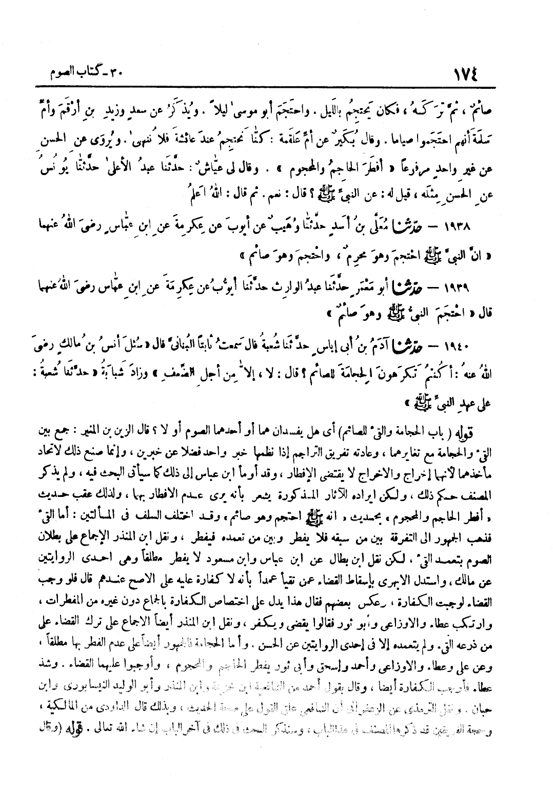 أَيْ هَلْ يُفْسِدَانِ هُمَا أَوْ أَحَدُهُمَا الصَّوْمَ أَوْ لَا قَالَ الزَّيْنُ بْنُ الْمُنِيرِ جَمَعَ بَيْنَ الْقَيْءِ وَالْحِجَامَةِ مَعَ تَغَايُرِهِمَا وَعَادَتُهُ تَفْرِيقُ التَّرَاجِمِ إِذَا نَظَمَهَا خَبَرٌ وَاحِدٌ فَضْلًا عَنْ خَبَرَيْنِ وَإِنَّمَا صَنَعَ ذَلِكَ لِاتِّحَادِ مَأْخَذِهِمَا لِأَنَّهُمَا إِخْرَاجٌ وَالْإِخْرَاجُ لَا يقتضى الْإِفْطَار وَقد أوما بن عَبَّاسٍ إِلَى ذَلِكَ كَمَا سَيَأْتِي الْبَحْثُ فِيهِ وَلَمْ يَذْكُرِ الْمُصَنِّفُ حُكْمَ ذَلِكَ وَلَكِنَّ إِيرَادَهُ لِلْآثَارِ الْمَذْكُورَةِ يُشْعِرُ بِأَنَّهُ يَرَى عَدَمَ الْإِفْطَارِ بِهِمَا وَلِذَلِكَ عَقَّبَ حَدِيثَ أَفْطَرَ الْحَاجِمُ وَالْمَحْجُومُ بِحَدِيثِ أَنَّهُ صَلَّى اللَّهُ عَلَيْهِ وَسَلَّمَ احْتَجَمَ وَهُوَ صَائِمٌ وَقَدِ اخْتَلَفَ السَّلَفُ فِي الْمَسْأَلَتَيْنِ أَمَّا الْقَيْءُ فَذَهَبَ الْجُمْهُورُ إِلَى التَّفْرِقَةِ بَيْنَ مَنْ سَبَقَهُ فَلَا يُفْطِرُ وَبَيْنَ مَنْ تَعَمَّدَهُ فيفطر وَنقل بن الْمُنْذِرِ الْإِجْمَاعَ عَلَى بُطْلَانِ الصَّوْمِ بِتَعَمُّدِ الْقَيْءِ لَكِن نقل بن بطال عَن بن عَبَّاس وبن مَسْعُودٍ لَا يُفْطِرُ مُطْلَقًا وَهِيَ إِحْدَى الرِّوَايَتَيْنِ عَنْ مَالِكٍ وَاسْتَدَلَّ الْأَبْهَرِيُّ بِإِسْقَاطِ الْقَضَاءِ عَمَّنْ تَقَيَّأَ عَمْدًا بِأَنَّهُ لَا كَفَّارَةَ عَلَيْهِ عَلَى الْأَصَحِّ عِنْدَهُمْ قَالَ فَلَوْ وَجَبَ الْقَضَاءُ لَوَجَبَتِ الْكَفَّارَةُ وَعَكَسَ بَعْضُهُمْ فَقَالَ هَذَا يَدُلُّ عَلَى اخْتِصَاصِ الْكَفَّارَةِ بِالْجِمَاعِ دُونَ غَيْرِهِ مِنَ الْمُفْطِرَاتِ وَارْتَكَبَ عَطَاءٌ وَالْأَوْزَاعِيُّ وَأَبُو ثَوْرٍ فَقَالُوا يَقْضِي وَيكفر وَنقل بن الْمُنْذِرِ أَيْضًا الْإِجْمَاعَ عَلَى تَرْكِ الْقَضَاءِ عَلَى مَنْ ذَرَعَهُ الْقَيْءُ وَلَمْ يَتَعَمَّدْهُ إِلَّا فِي إِحْدَى الرِّوَايَتَيْنِ عَنِ الْحَسَنِ وَأَمَّا الْحِجَامَةُ فَالْجُمْهُورُ أَيْضًا عَلَى عَدَمِ الْفِطْرِ بِهَا مُطْلَقًا وَعَنْ عَلِيٍّ وَعَطَاءٍ وَالْأَوْزَاعِيِّ وَأَحْمَدَ وَإِسْحَاقَ وَأَبِي ثَوْرٍ يُفْطِرُ الْحَاجِمُ وَالْمَحْجُومُ وَأَوْجَبُوا عَلَيْهِمَا الْقَضَاءَ وَشَذَّ عَطَاءٌ فَأَوْجَبَ الْكَفَّارَةَ أَيْضًا وَقَالَ بِقَوْلِ أَحْمَدَ من الشَّافِعِيَّة بن خُزَيْمَة وبن الْمُنْذر وَأَبُو الْوَلِيد النَّيْسَابُورِي وبن حبَان وَنقل التِّرْمِذِيُّ عَنِ الزَّعْفَرَانِيِّ أَنَّ الشَّافِعِيَّ عَلَّقَ الْقَوْلَ عَلَى صِحَّةِ الْحَدِيثِ وَبِذَلِكَ قَالَ الدَّاوُدِيُّ مِنَ الْمَالِكِيَّةِ وَحُجَّةُ الْفَرِيقَيْنِ قَدْ ذَكَرَهَا الْمُصَنِّفُ فِي هَذَا الْبَابِ وَسَنَذْكُرُ الْبَحْثَ فِي ذَلِكَ فِي آخِرِ الْبَابِ إِنْ شَاءَ اللَّهُ تَعَالَى قَوْلُهُ وَقَالَ