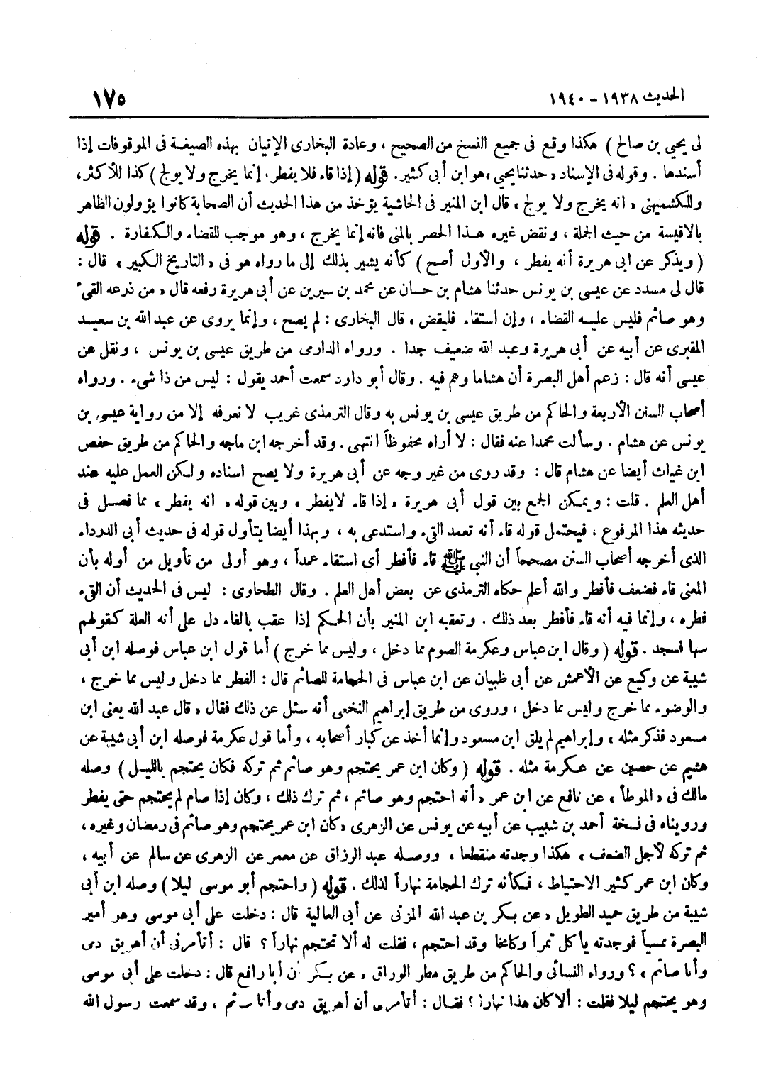 لِي يَحْيَى بْنُ صَالِحٍ هَكَذَا وَقَعَ فِي جَمِيعِ النُّسَخِ مِنَ الصَّحِيحِ وَعَادَةُ الْبُخَارِيِّ الْإِتْيَانُ بِهَذِهِ الصِّيغَةِ فِي الْمَوْقُوفَاتِ إِذَا أَسْنَدَهَا وَقَوْلُهُ فِي الْإِسْنَاد حَدثنَا يحيى هُوَ بن أَبِي كَثِيرٍ قَوْلُهُ إِذَا قَاءَ فَلَا يُفْطِرْ إِنَّمَا يُخْرِجُ وَلَا يُولِجُ كَذَا لِلْأَكْثَرِ ولِلْكُشْمِيهَنِيِّ أَنه يخرج وَلَا يولج قَالَ بن الْمُنِيرِ فِي الْحَاشِيَةِ يُؤْخَذُ مِنْ هَذَا الْحَدِيثِ أَن الصَّحَابَة كَانُوا يؤولون الظَّاهِرَ بِالْأَقْيِسَةِ مِنْ حَيْثُ الْجُمْلَةِ وَنَقَضَ غَيْرُهُ هَذَا الْحَصْرَ بِالْمَنِيِّ فَإِنَّهُ إِنَّمَا يَخْرُجُ وَهُوَ مُوجِبٌ لِلْقَضَاءِ وَالْكَفَّارَةِ قَوْلُهُ وَيُذْكَرُ عَنْ أَبِي هُرَيْرَةَ أَنَّهُ يُفْطِرُ وَالْأَوَّلُ أَصَحُّ كَأَنَّهُ يُشِيرُ بِذَلِكَ إِلَى مَا رَوَاهُ هُوَ فِي التَّارِيخِ الْكَبِيرِ قَالَ قَالَ لِي مُسَدَّدٌ عَنْ عِيسَى بْنِ يُونُسَ حَدَّثَنَا هِشَامِ بْنِ حَسَّانَ عَنْ مُحَمَّدِ بْنِ سِيرِينَ عَنْ أَبِي هُرَيْرَةَ رَفَعَهُ قَالَ مَنْ ذَرَعَهُ الْقَيْءُ وَهُوَ صَائِمٌ فَلَيْسَ عَلَيْهِ الْقَضَاءُ وَإِنِ اسْتِقَاءَ فَلْيَقْضِ قَالَ الْبُخَارِيُّ لَمْ يَصِحَّ وَإِنَّمَا يُرْوَى عَنْ عَبْدِ اللَّهِ بْنِ سَعِيدٍ الْمَقْبُرِيِّ عَنْ أَبِيهِ عَنْ أَبِي هُرَيْرَةَ وَعَبْدُ اللَّهِ ضَعِيفٌ جِدًّا وَرَوَاهُ الدَّارِمِيُّ مِنْ طَرِيقِ عِيسَى بْنِ يُونُسَ وَنَقَلَ عَنْ عِيسَى أَنَّهُ قَالَ زَعَمَ أَهْلُ الْبَصْرَةِ أَنَّ هِشَامًا وَهَمَ فِيهِ وَقَالَ أَبُو دَاوُدَ سَمِعْتُ أَحْمَدَ يَقُولُ لَيْسَ مِنْ ذَا شَيْءٌ وَرَوَاهُ أَصْحَابُ السُّنَنِ الْأَرْبَعَةِ وَالْحَاكِمُ مِنْ طَرِيقِ عِيسَى بْنِ يُونُسَ بِهِ وَقَالَ التِّرْمِذِيُّ غَرِيبٌ لَا نَعْرِفُهُ إِلَّا مِنْ رِوَايَةِ عِيسَى بْنِ يُونُسَ عَنْ هِشَامٍ وَسَأَلْتُ مُحَمَّدًا عَنْهُ فَقَالَ لَا أرَاهُ مَحْفُوظًا انْتهى وَقد أخرجه بن مَاجَهْ وَالْحَاكِمُ مِنْ طَرِيقِ حَفْصِ بْنِ غِيَاثٍ أَيْضًا عَنْ هِشَامٍ قَالَ وَقَدْ رُوِيَ مِنْ غَيْرِ وَجْهٍ عَنْ أَبِي هُرَيْرَةَ وَلَا يَصِحُّ إِسْنَادُهُ وَلَكِنَّ الْعَمَلَ عَلَيْهِ عِنْدَ أَهْلِ الْعِلْمِ قُلْتُ وَيُمْكِنُ الْجَمْعُ بَيْنَ قَوْلِ أَبِي هُرَيْرَةَ إِذَا قَاءَ لَا يُفْطِرُ وَبَيْنَ قَوْلِهِ إِنَّهُ يُفْطِرُ مِمَّا فُصِّلَ فِي حَدِيثِهِ هَذَا الْمَرْفُوعِ فَيَحْتَمِلُ قَوْلُهُ قَاءَ أَنَّهُ تَعَمَّدَ الْقَيْءَ وَاسْتَدْعَى بِهِ وَبِهَذَا أَيْضًا يُتَأَوَّلُ قَوْلُهُ فِي حَدِيثِ أَبِي الدَّرْدَاءِ الَّذِي أَخْرَجَهُ أَصْحَابُ السُّنَنِ مُصَحَّحًا أَنَّ النَّبِيَّ صَلَّى اللَّهُ عَلَيْهِ وَسَلَّمَ قَاءَ فَأَفْطَرَ أَيِ اسْتَقَاءَ عَمْدًا وَهُوَ أَوْلَى مِنْ تَأْوِيلِ مَنْ أَوَّلَهُ بِأَنَّ الْمَعْنَى قَاءَ فَضَعُفَ فَأَفْطَرَ وَاللَّهُ أَعْلَمُ حَكَاهُ التِّرْمِذِيُّ عَنْ بَعْضِ أَهْلِ الْعِلْمِ وَقَالَ الطَّحَاوِيُّ لَيْسَ فِي الْحَدِيثِ أَنَّ الْقَيْءَ فَطَّرَهُ وَإِنَّمَا فِيهِ أَنَّهُ قَاءَ فَأفْطر بعد ذَلِك وَتعقبه بن الْمُنِيرِ بِأَنَّ الْحُكْمَ إِذَا عُقِّبَ بِالْفَاءِ دَلَّ عَلَى أَنَّهُ الْعِلَّةُ كَقَوْلِهِمْ سَهَا فَسَجَدَ قَوْلُهُ وَقَالَ بن عَبَّاسٍ وَعِكْرِمَةُ الصَّوْمُ مِمَّا دَخَلَ وَلَيْسَ مِمَّا خرج أما قَول بن عَبَّاس فوصله بن أَبِي شَيْبَةَ عَنْ وَكِيعٍ عَنِ الْأَعْمَشِ عَنْ أبي ظبْيَان عَن بن عَبَّاسٍ فِي الْحِجَامَةِ لِلصَّائِمِ قَالَ الْفِطْرُ مِمَّا دَخَلَ وَلَيْسَ مِمَّا خَرَجَ وَالْوُضُوءُ مِمَّا خَرَجَ وَلَيْسَ مِمَّا دَخَلَ وَرُوِيَ مِنْ طَرِيقِ إِبْرَاهِيمَ النَّخَعِيِّ أَنَّهُ سُئِلَ عَنْ ذَلِكَ فَقَالَ قَالَ عبد الله يَعْنِي بن