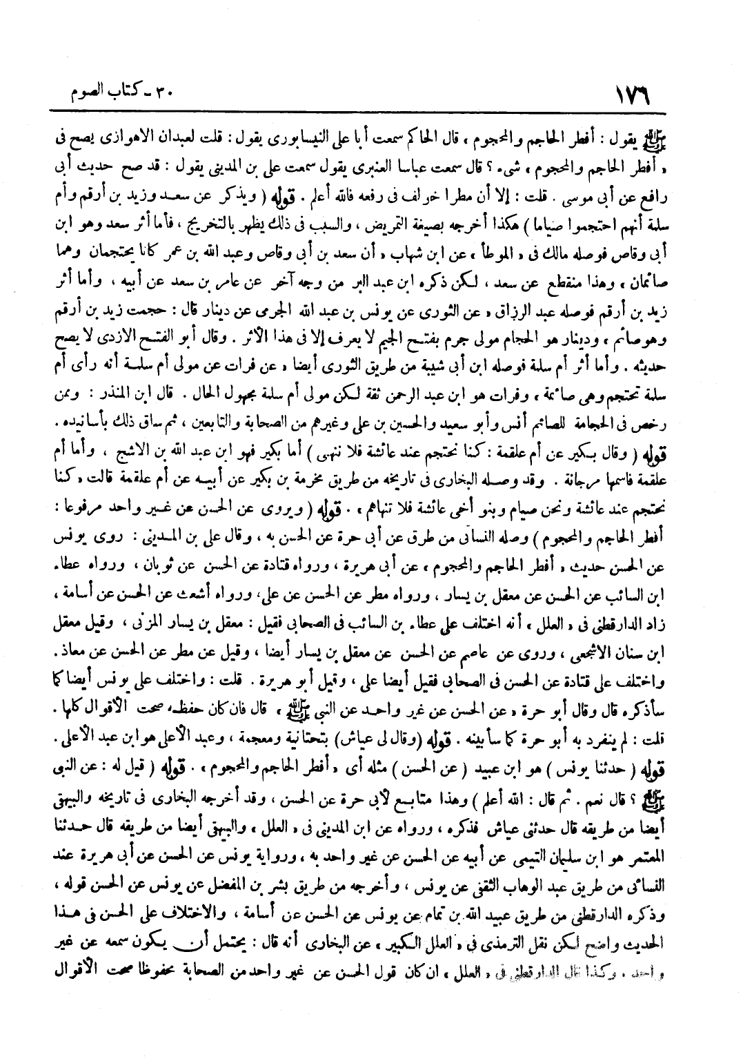 يَقُولُ أَفْطَرَ الْحَاجِمُ وَالْمَحْجُومُ قَالَ الْحَاكِمُ سَمِعْتُ أَبَا عَلِيٍّ النَّيْسَابُورِيَّ يَقُولُ قُلْتُ لِعَبْدَانَ الْأَهْوَازِيِّ يَصِحُّ فِي أَفْطَرَ الْحَاجِمُ وَالْمَحْجُومُ شَيْءٌ قَالَ سَمِعْتُ عَبَّاسًا الْعَنْبَرِيَّ يَقُولُ سَمِعْتُ عَلِيَّ بْنَ الْمَدِينِيِّ يَقُولُ قَدْ صَحَّ حَدِيثُ أَبِي رَافِعٍ عَنْ أَبِي مُوسَى قُلْتُ إِلَّا أَنَّ مَطَرًا خُولِفَ فِي رَفْعِهِ فَاللَّهُ أَعْلَمُ قَوْلُهُ وَيُذْكَرُ عَنْ سَعْدٍ وَزَيْدِ بْنِ أَرْقَمَ وَأُمِّ سَلَمَةَ أَنَّهُمُ احْتَجَمُوا صِيَامًا هَكَذَا أَخْرَجَهُ بِصِيغَةِ التَّمْرِيضِ وَالسَّبَبُ فِي ذَلِكَ يَظْهَرُ بِالتَّخْرِيجِ فَأَمَّا أَثَرُ سعد وَهُوَ بن أَبِي وَقَّاصٍ فَوَصَلَهُ مَالِكٌ فِي الْمُوَطَّأِ عَنِ بن شِهَابٍ أَنَّ سَعْدَ بْنَ أَبِي وَقَّاصٍ وَعَبْدَ اللَّهِ بْنَ عُمَرَ كَانَا يَحْتَجِمَانِ وَهُمَا صَائِمَانِ وَهَذَا مُنْقَطع عَن سعد لَكِن ذكره بن عَبْدِ الْبَرِّ مِنْ وَجْهٍ آخَرَ عَنْ عَامِرِ بْنِ سَعْدٍ عَنْ أَبِيهِ وَأَمَّا أَثَرُ زَيْدِ بْنِ أَرْقَمَ فَوَصَلَهُ عَبْدُ الرَّزَّاقِ عَنِ الثَّوْرِيِّ عَنْ يُونُسَ بْنِ عَبْدِ اللَّهِ الْجَرْمِيِّ عَنْ دِينَارٍ قَالَ حَجَّمْتُ زَيْدَ بْنَ أَرْقَمَ وَهُوَ صَائِمٌ وَدِينَارٌ هُوَ الْحَجَّامُ مَوْلَى جَرْمٍ بِفَتْحِ الْجِيمِ لَا يُعْرَفُ إِلَّا فِي هَذَا الْأَثَرِ وَقَالَ أَبُو الْفَتْحِ الْأَزْدِيُّ لَا يَصِحُّ حَدِيثُهُ وَأما أثر أم سَلمَة فوصله بن أَبِي شَيْبَةَ مِنْ طَرِيقِ الثَّوْرِيِّ أَيْضًا عَنْ فُرَاتٍ عَنْ مَوْلَى أُمِّ سَلَمَةَ أَنَّهُ رَأَى أُمَّ سَلَمَةَ تَحْتَجِمُ وَهِيَ صَائِمَةٌ وَفُرَاتٌ هُوَ بن عَبْدِ الرَّحْمَنِ ثِقَةٌ لَكِنَّ مَوْلَى أُمِّ سَلَمَةَ مَجْهُول الْحَال قَالَ بن الْمُنْذِرِ وَمِمَّنْ رَخَّصَ فِي الْحِجَامَةِ لِلصَّائِمِ أَنَسٌ وَأَبُو سَعِيدٍ وَالْحُسَيْنُ بْنُ عَلِيٍّ وَغَيْرُهُمْ مِنَ الصَّحَابَةِ وَالتَّابِعِينَ ثُمَّ سَاقَ ذَلِكَ بِأَسَانِيدِهِ قَوْلُهُ وَقَالَ بُكَيْرٌ عَنْ أُمِّ عَلْقَمَةَ كُنَّا نَحْتَجِمُ عِنْدَ عَائِشَةَ فَلَا نُنْهَى أَمَّا بُكَيْرٌ فَهُوَ بن عَبْدِ اللَّهِ بْنِ الْأَشَجِّ وَأَمَّا أُمُّ عَلْقَمَةَ فَاسْمُهَا مُرْجَانَةُ وَقَدْ وَصَلَهُ الْبُخَارِيُّ فِي تَارِيخِهِ مِنْ طَرِيقِ مَخْرَمَةَ بْنِ بُكَيْرٍ عَنْ أَبِيهِ عَنْ أُمِّ عَلْقَمَةَ قَالَتْ كُنَّا نَحْتَجِمُ عِنْدَ عَائِشَةَ وَنَحْنُ صِيَامٌ وَبَنُو أَخِي عَائِشَةَ فَلَا تَنْهَاهُمْ قَوْلُهُ وَيُرْوَى عَنِ الْحَسَنِ عَنْ غَيْرِ وَاحِدٍ مَرْفُوعًا أَفْطَرَ الْحَاجِمُ وَالْمَحْجُومُ وَصَلَهُ النَّسَائِيُّ مِنْ طُرُقٍ عَنْ أَبِي حُرَّةَ عَنِ الْحَسَنِ بِهِ وَقَالَ عَلِيُّ بْنُ الْمَدِينِيِّ رَوَى يُونُسُ عَنِ الْحَسَنِ حَدِيثَ أَفْطَرَ الْحَاجِمُ وَالْمَحْجُومُ عَنْ أَبِي هُرَيْرَةَ وَرَوَاهُ قَتَادَةُ عَنِ الْحَسَنِ عَنْ ثَوْبَانَ وَرَوَاهُ عَطَاءُ بْنُ السَّائِبِ عَنِ الْحَسَنِ عَنْ مَعْقِلِ بْنِ يَسَارٍ وَرَوَاهُ مَطَرٌ عَنِ الْحَسَنِ عَنْ عَلِيٍّ وَرَوَاهُ أَشْعَثُ عَنِ الْحَسَنِ عَنْ أُسَامَةَ زَادَ الدَّارَقُطْنِيُّ فِي الْعِلَلِ أَنَّهُ اخْتُلِفَ عَلَى عَطَاءِ بْنِ السَّائِبِ فِي الصَّحَابِيِّ فَقِيلَ مَعْقِلُ بْنُ يَسَارٍ الْمُزَنِيُّ وَقِيلَ مَعْقِلُ بْنُ سِنَانٍ الْأَشْجَعِيُّ وَرُوِيَ عَنْ عَاصِمٍ عَنِ الْحَسَنِ عَنْ مَعْقِلِ بْنِ يَسَارٍ أَيْضًا وَقِيلَ عَنْ مَطَرٍ عَنِ الْحَسَنِ عَنْ مُعَاذٍ وَاخْتُلِفَ عَلَى قَتَادَةَ عَنِ الْحَسَنِ فِي الصَّحَابِيِّ فَقِيلَ أَيْضًا عَلِيٌّ وَقِيلَ أَبُو هُرَيْرَةَ قُلْتُ وَاخْتُلِفَ عَلَى يُونُسَ أَيْضًا كَمَا سَأَذْكُرُهُ قَالَ وَقَالَ أَبُو حُرَّةَ عَنِ ا