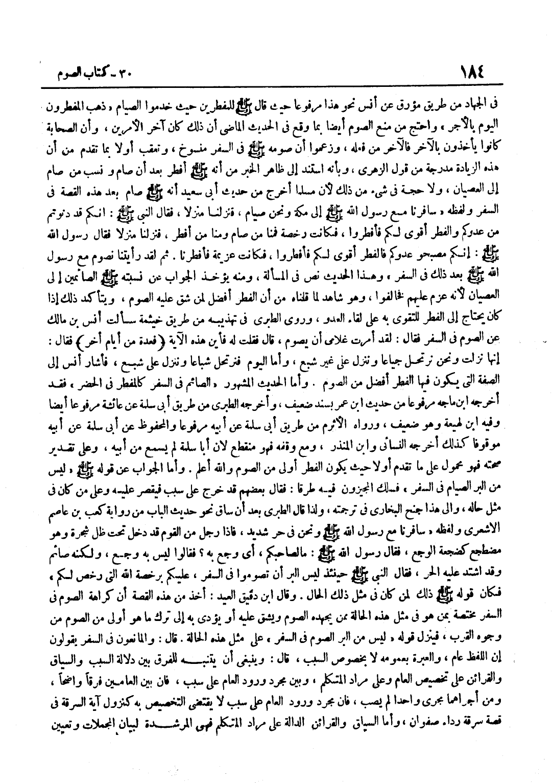 فِي الْجِهَادِ مِنْ طَرِيقِ مُؤَرَّقٍ عَنْ أَنَسٍ نَحْوُ هَذَا مَرْفُوعًا حَيْثُ قَالَ صَلَّى اللَّهُ عَلَيْهِ وَسَلَّمَ لِلْمُفْطِرِينَ حَيْثُ خَدَمُوا الصُّيَّامَ ذَهَبَ الْمُفْطِرُونَ الْيَوْمَ بِالْأَجْرِ وَاحْتَجَّ مَنْ مَنَعَ الصَّوْمَ أَيْضًا بِمَا وَقَعَ فِي الْحَدِيثِ الْمَاضِي أَنَّ ذَلِكَ كَانَ آخِرَ الْأَمْرَيْنِ وَأَنَّ الصَّحَابَةَ كَانُوا يَأْخُذُونَ بِالْآخِرِ فَالْآخِرُ مِنْ فِعْلِهِ وَزَعَمُوا أَنَّ صَوْمَهُ صَلَّى اللَّهُ عَلَيْهِ وَسَلَّمَ فِي السَّفَرِ مَنْسُوخٌ وَتُعُقِّبَ أَوَّلًا بِمَا تَقَدَّمَ مِنْ أَنَّ هَذِهِ الزِّيَادَةَ مُدْرَجَةٌ مِنْ قَوْلِ الزُّهْرِيِّ وَبِأَنَّهُ اسْتَنَدَ إِلَى ظَاهِرِ الْخَبَرِ مِنْ أَنَّهُ صَلَّى اللَّهُ عَلَيْهِ وَسَلَّمَ أَفْطَرَ بَعْدَ أَنْ صَامَ وَنَسَبَ مَنْ صَامَ إِلَى الْعِصْيَانِ وَلَا حُجَّةَ فِي شَيْءٍ مِنْ ذَلِكَ لِأَنَّ مُسْلِمًا أَخْرَجَ مِنْ حَدِيثِ أَبِي سَعِيدٍ أَنَّهُ صَلَّى اللَّهُ عَلَيْهِ وَسَلَّمَ صَامَ بَعْدَ هَذِهِ الْقِصَّةِ فِي السَّفَرِ وَلَفْظُهُ سَافَرْنَا مَعَ رَسُولِ اللَّهِ صَلَّى اللَّهُ عَلَيْهِ وَسَلَّمَ إِلَى مَكَّةَ وَنَحْنُ صِيَامٌ فَنَزَلْنَا مَنْزِلًا فَقَالَ النَّبِيُّ صَلَّى اللَّهُ عَلَيْهِ وَسَلَّمَ إِنَّكُمْ قَدْ دَنَوْتُمْ مِنْ عَدُوِّكُمْ وَالْفِطْرُ أَقْوَى لَكُمْ فَأَفْطِرُوا فَكَانَتْ رُخْصَةً فَمِنَّا مَنْ صَامَ وَمِنَّا مَنْ أَفْطَرَ فَنَزَلْنَا مَنْزِلًا فَقَالَ رَسُولُ اللَّهِ صَلَّى اللَّهُ عَلَيْهِ وَسَلَّمَ إِنَّكُمْ مُصَبِّحُو عَدُوِّكُمْ فَالْفِطْرُ أَقْوَى لَكُمْ فَأَفْطَرُوا فَكَانَتْ عَزِيمَةً فَأَفْطَرْنَا ثُمَّ لَقَدْ رَأَيْتُنَا نَصُومُ مَعَ رَسُولِ اللَّهِ صَلَّى اللَّهُ عَلَيْهِ وَسَلَّمَ بَعْدَ ذَلِكَ فِي السَّفَرِ وَهَذَا الْحَدِيثُ نَصٌّ فِي الْمَسْأَلَةِ وَمِنْهُ يُؤْخَذُ الْجَوَابُ عَنْ نِسْبَتِهِ صَلَّى اللَّهُ عَلَيْهِ وَسَلَّمَ الصَّائِمِينَ إِلَى الْعِصْيَانِ لِأَنَّهُ عَزَمَ عَلَيْهِمْ فَخَالَفُوا وَهُوَ شَاهِدٌ لِمَا قُلْنَاهُ مِنْ أَنَّ الْفِطْرَ أَفْضَلُ لِمَنْ شَقَّ عَلَيْهِ الصَّوْمُ وَيَتَأَكَّدُ ذَلِكَ إِذَا كَانَ يَحْتَاجُ إِلَى الْفِطْرِ لِلتَّقَوِّي بِهِ عَلَى لِقَاءِ الْعَدُوِّ وَرَوَى الطَّبَرِيُّ فِي تَهْذِيبِهِ مِنْ طَرِيقِ خَيْثَمَةَ سَأَلْتُ أَنَسَ بْنَ مَالِكٍ عَنِ الصَّوْمِ فِي السَّفَرِ فَقَالَ لَقَدْ أَمَرْتُ غُلَامِي أَنْ يَصُومَ قَالَ فَقُلْتُ لَهُ فَأَيْنَ هَذِهِ الْآيَةُ فَعِدَّةٌ مِنْ أَيَّام اخر فَقَالَ إِنَّهَا نَزَلَتْ وَنَحْنُ نَرْتَحِلُ جِيَاعًا وَنَنْزِلُ عَلَى غَيْرِ شِبَعٍ وَأَمَّا الْيَوْمَ فَنَرْتَحِلُ شِبَاعًا وَنَنْزِلُ عَلَى شِبَعٍ فَأَشَارَ أَنَسٌ إِلَى الصِّفَةِ الَّتِي يَكُونُ فِيهَا الْفِطْرُ أَفْضَلَ مِنَ الصَّوْمِ وَأَمَّا الْحَدِيثُ الْمَشْهُورُ الصَّائِمُ فِي السَّفَرِ كَالْمُفْطِرِ فِي الْحَضَر فقد أخرجه بن ماجة مَرْفُوعا من حَدِيث بن عُمَرَ بِسَنَدٍ ضَعِيفٍ وَأَخْرَجَهُ الطَّبَرِيُّ مِنْ طَرِيقِ أَبِي سَلَمَةَ عَنْ عَائِشَةَ مَرْفُوعًا أَيْضًا وَفِيهِ بن لَهِيعَةَ وَهُوَ ضَعِيفٌ وَرَوَاهُ الْأَثْرَمُ مِنْ طَرِيقِ أَبِي سَلَمَةَ عَنْ أَبِيهِ مَرْفُوعًا وَالْمَحْفُوظُ عَنْ أَبِي سَلَمَةَ عَنْ أَبِيهِ مَوْقُوفًا كَذَلِكَ أَخْرَجَهُ النَّسَائِيّ وبن الْمُنْذِرِ وَمَعَ وَقْفِهِ فَهُوَ مُنْقَطِعٌ لِأَنَّ أَبَا سَلَمَةَ لَمْ يَسْمَعْ مِنْ أَبِيهِ وَعَلَى تَقْدِيرِ صِحَّتِهِ فَهُوَ مَحْمُولٌ عَلَى مَا تَقَدَّمَ أَوَّلًا حَيْثُ يَكُونُ الْفِطْرُ أَوْلَى مِنَ الصَّوْمِ وَاللَّهُ أَعْلَمُ وَأَمَّا الْجَوَابُ عَنْ قَوْلِهِ صَلَّى اللَّهُ عَلَيْهِ وَسَلَّمَ لَيْسَ مِنَ ال